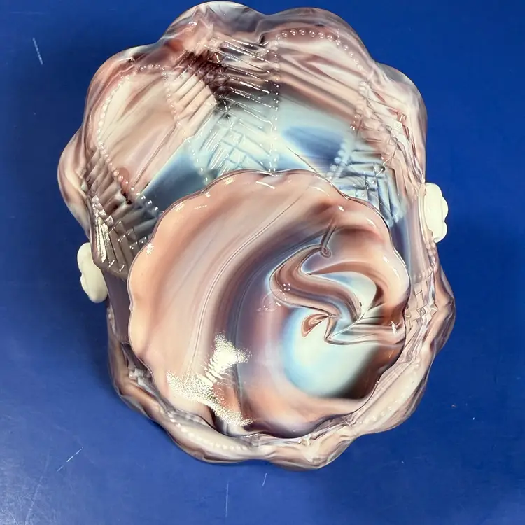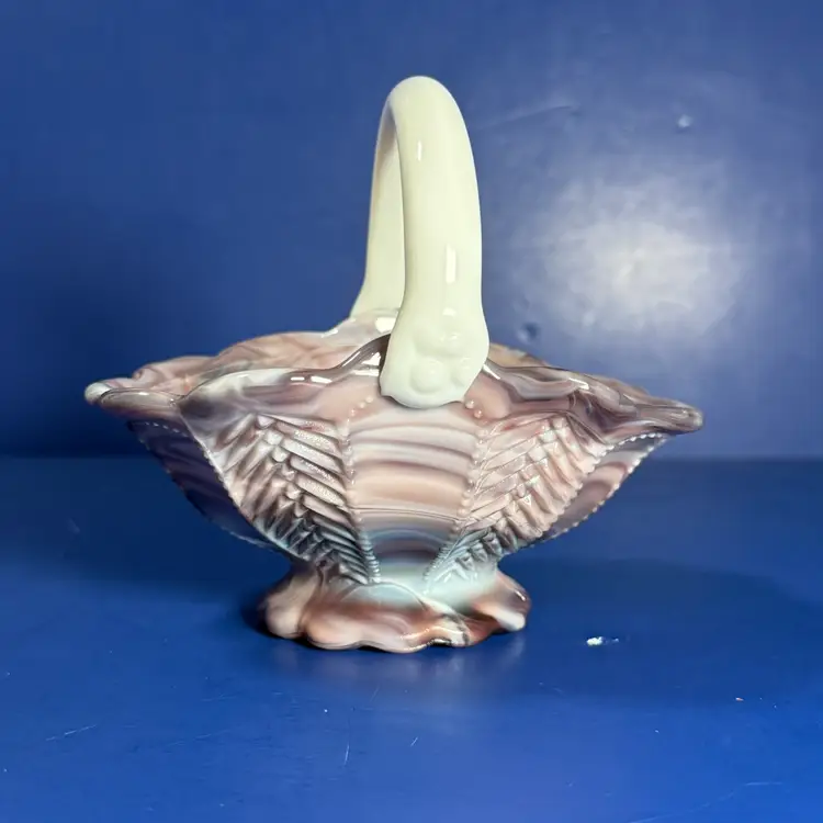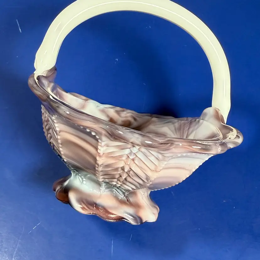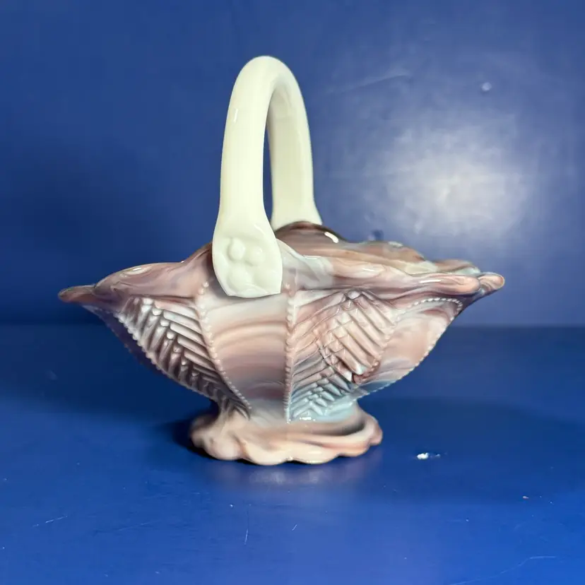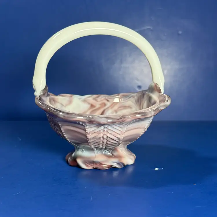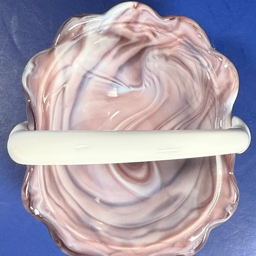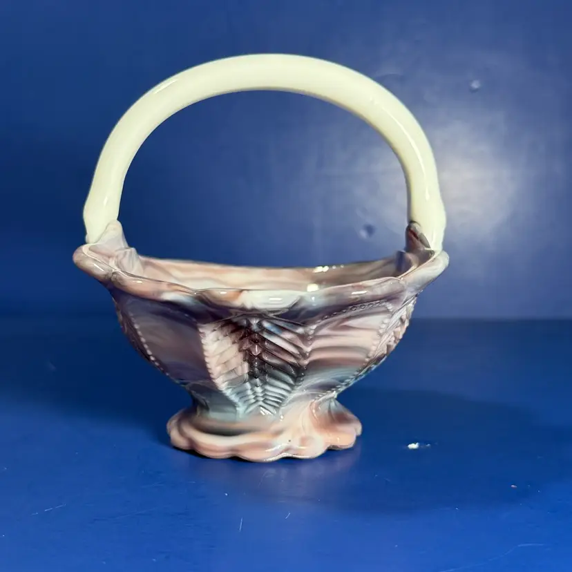 • Imperial Glass basket in the highly collectible purple slag color • Features the original impressed Imperial Glass mark on the bottom • Measures approx. 4.5” tall and 5.5” long • Beautiful glossy finish with dramatic purple‑and‑white marbling • Textured pattern with a scalloped rim and smooth handle • No chips, cracks, or defects found • Excellent example of Imperial’s slag glass craftsmanship — each piece is uniquely marbled • Perfect for Imperial Glass collectors, slag glass enthusiasts, vanity displays, or spring décor • A desirable color variant that displays beautifully in natural or artificial light