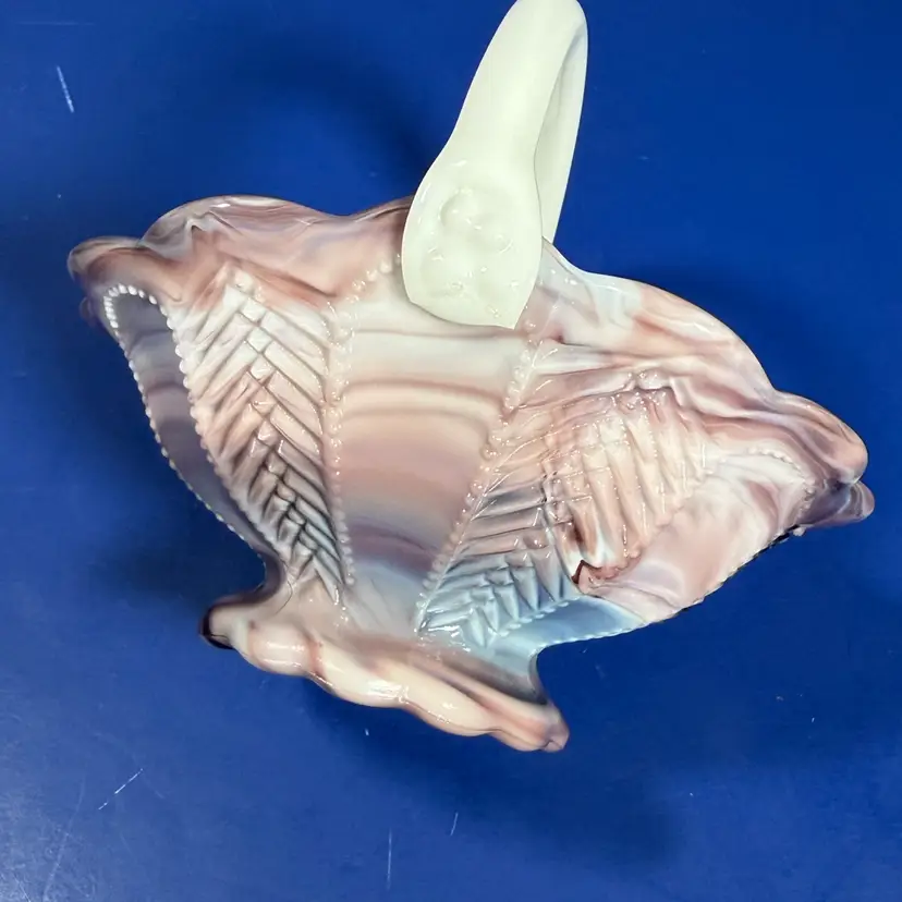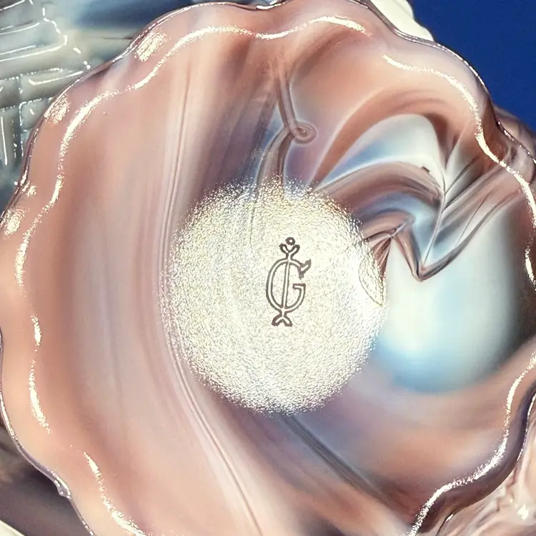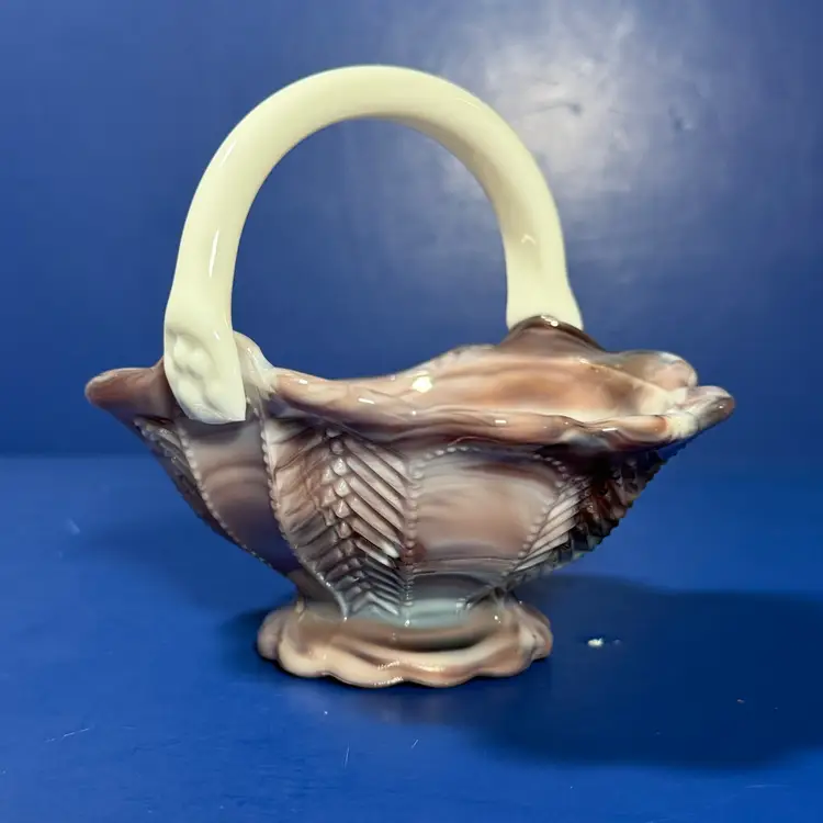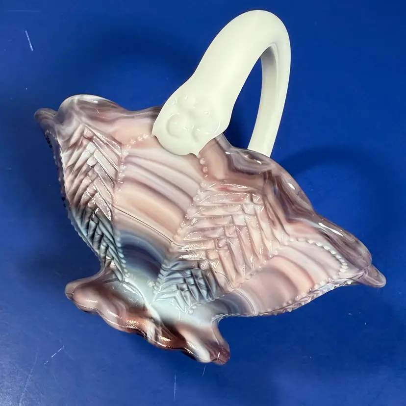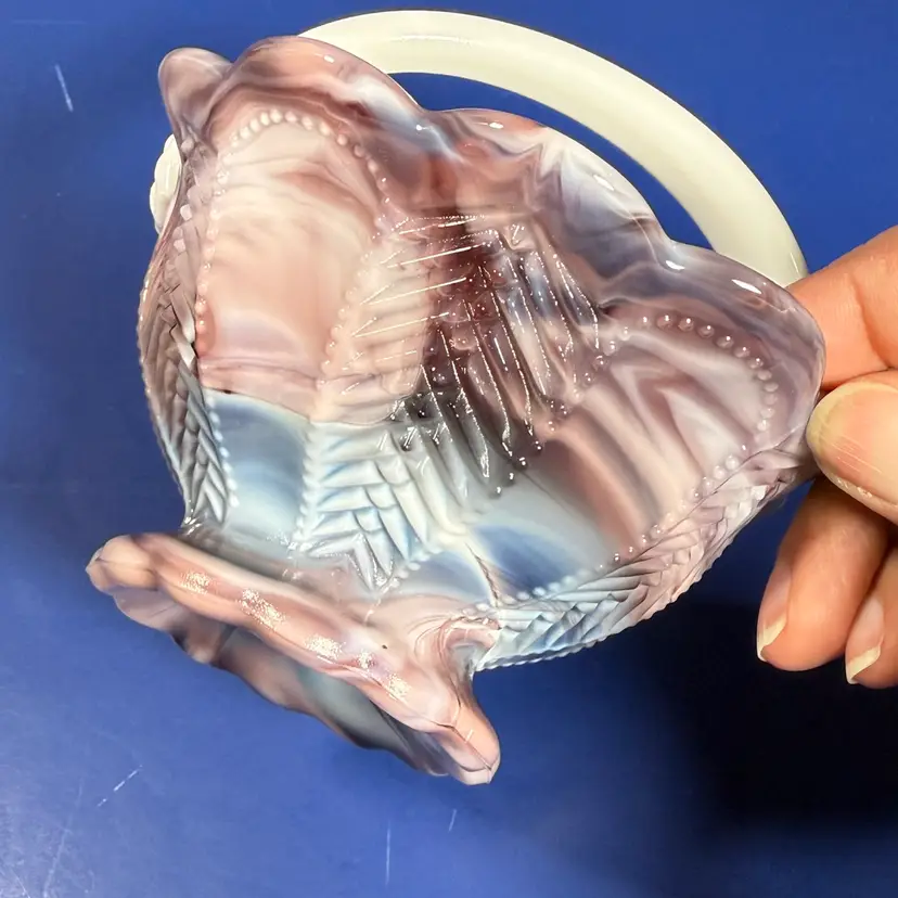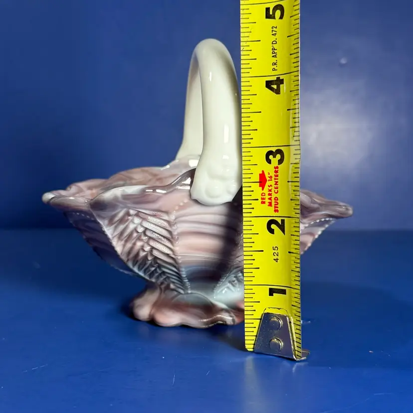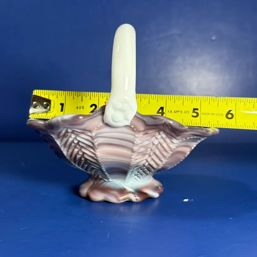 • Imperial Glass basket in the highly collectible purple slag color • Features the original impressed Imperial Glass mark on the bottom • Measures approx. 4.5” tall and 5.5” long • Beautiful glossy finish with dramatic purple‑and‑white marbling • Textured pattern with a scalloped rim and smooth handle • No chips, cracks, or defects found • Excellent example of Imperial’s slag glass craftsmanship — each piece is uniquely marbled • Perfect for Imperial Glass collectors, slag glass enthusiasts, vanity displays, or spring décor • A desirable color variant that displays beautifully in natural or artificial light