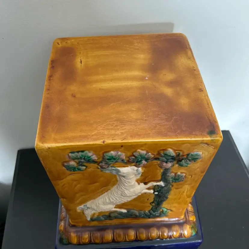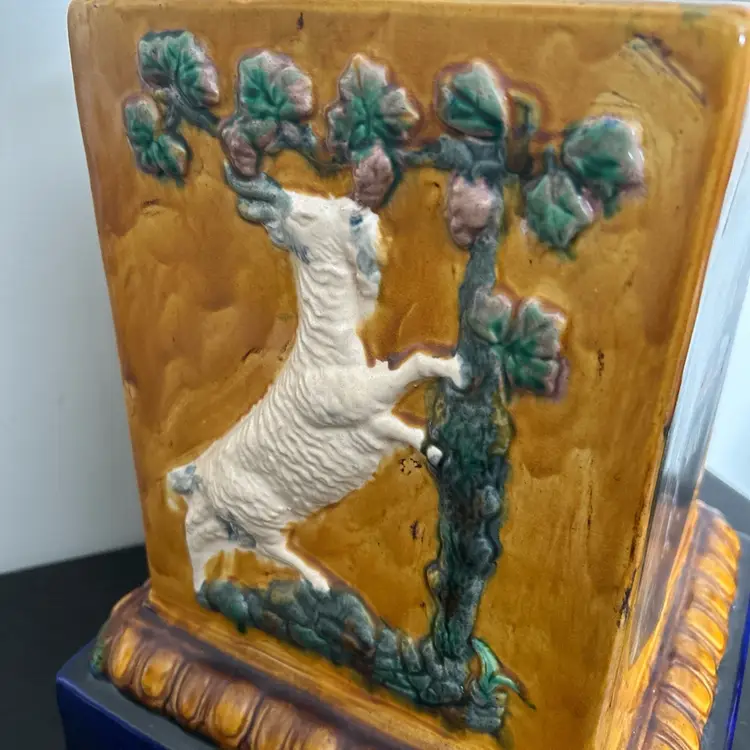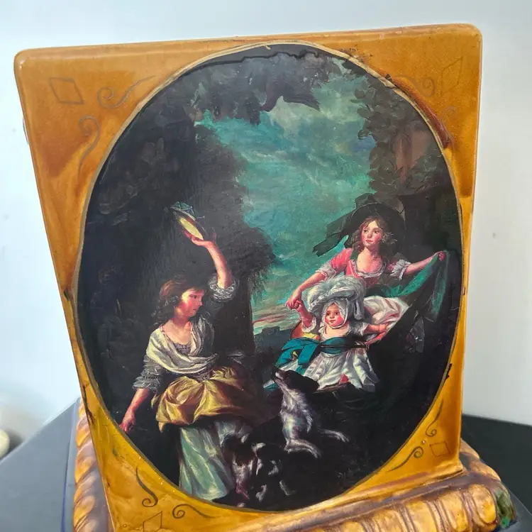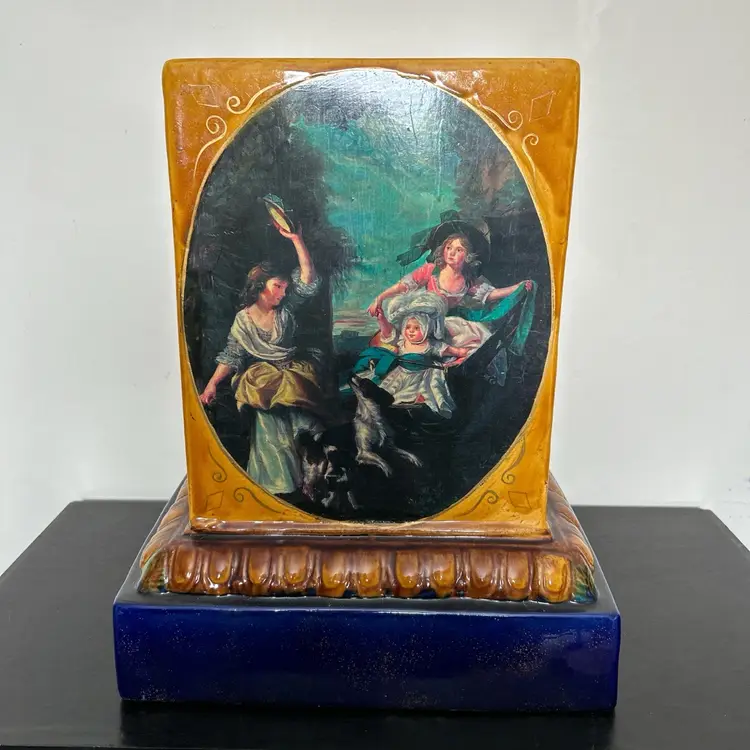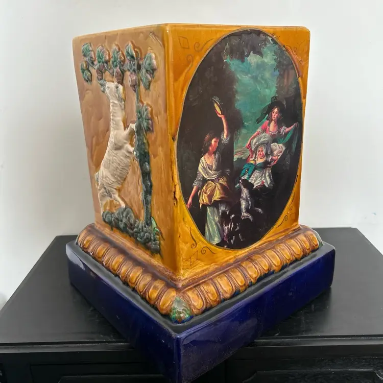 Height is 14 width is between 11-11 1/2. Two sides are of a goat eating from a tree and two sides is a picture of two Victorian women, a baby, and a dog. Very cool and unique. It weights almost 13 pounds and then with the big box and a ton of wrapping, the weight is high.