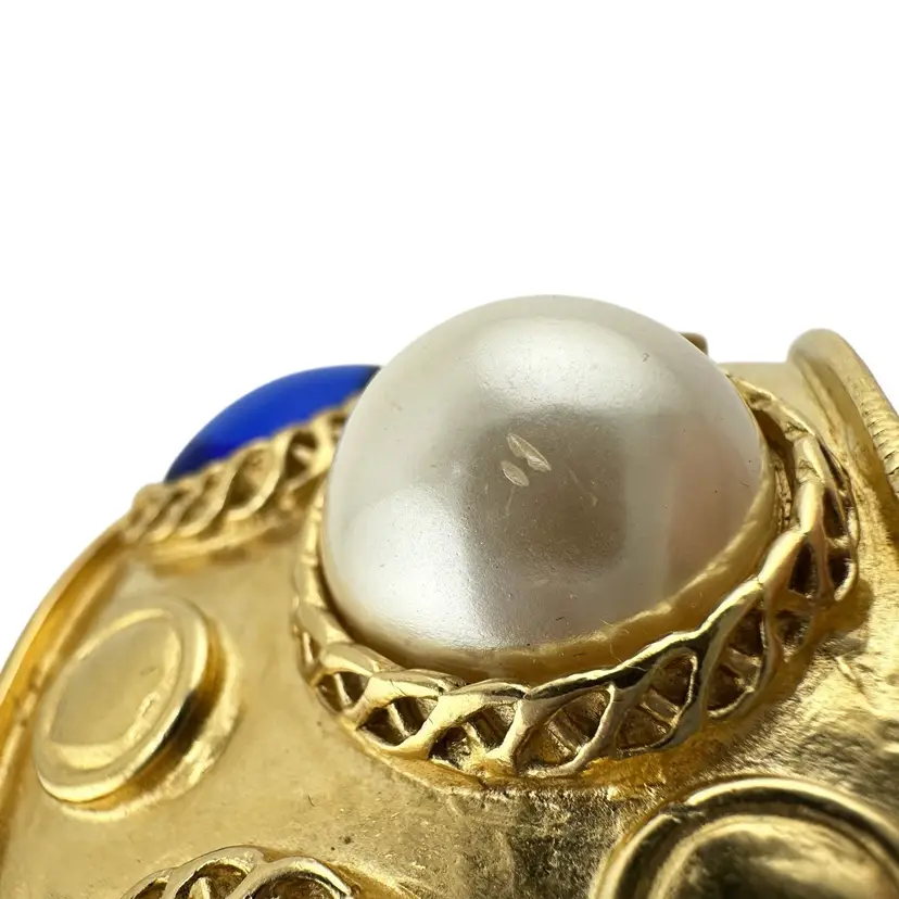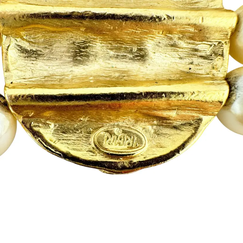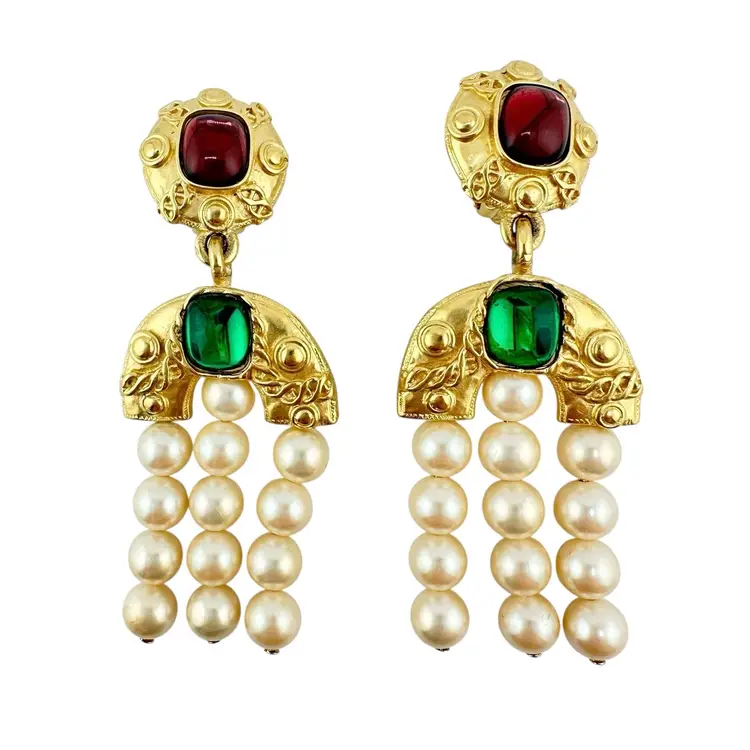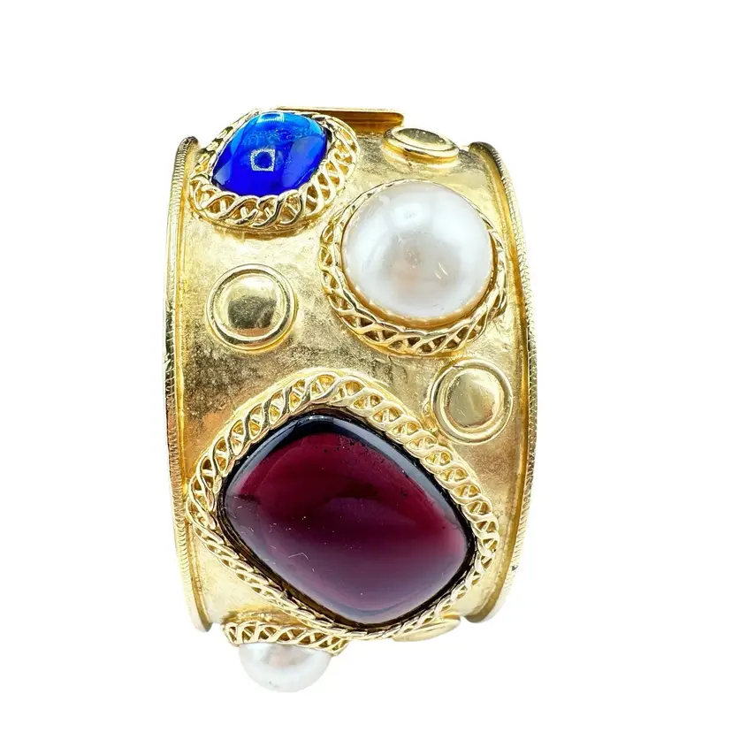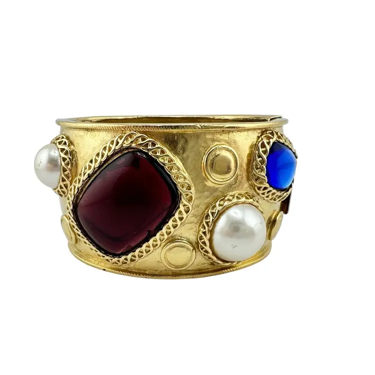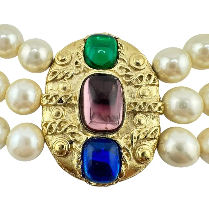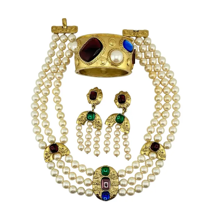 This is an extremly rare Marcella Saltz for Trifari earring, necklace, and bracelet set in Etruscan Revival style with multicolor gripoix glass faux gems. I cannot find another full parure of this set online (in fact, I have only found the earrings). It is in incredible condition, with only the back of the bangle showing any real loss of gold plating. Some of the pearls have slight discoloration, likely from exposure to skin oils/perfume/lotion in the past. I have only done a gentle wipe down to avoid doing any damage to the set, leaving additional cleaning or restoration to the buyer.