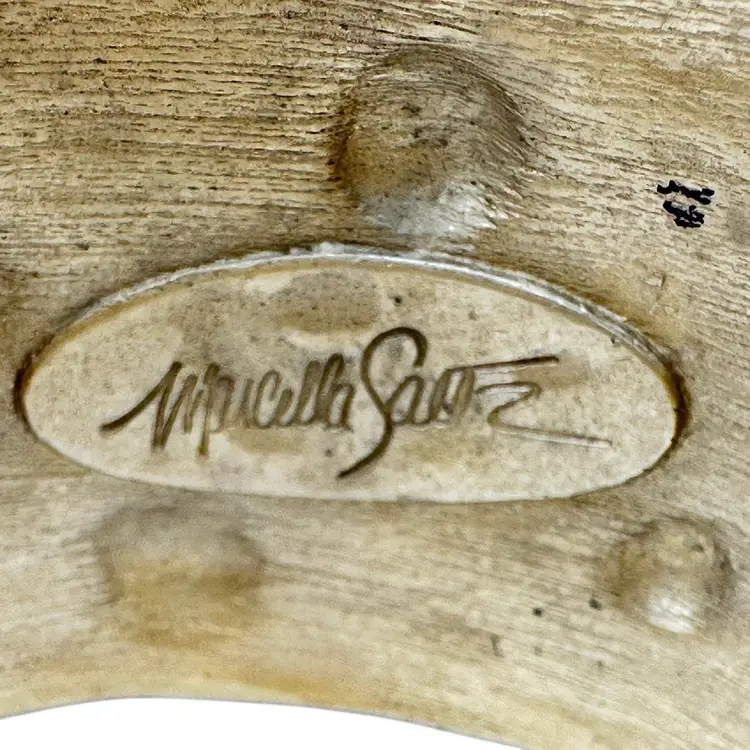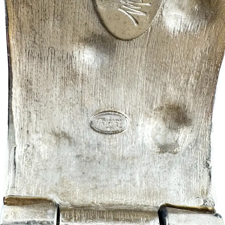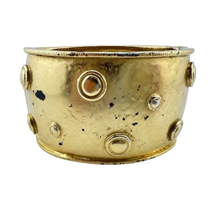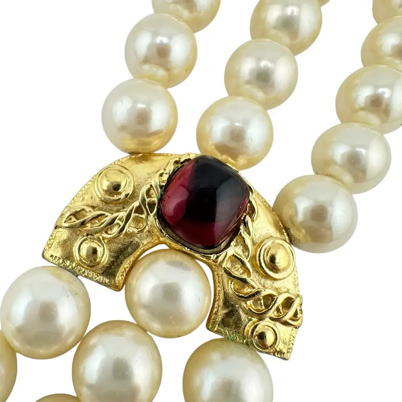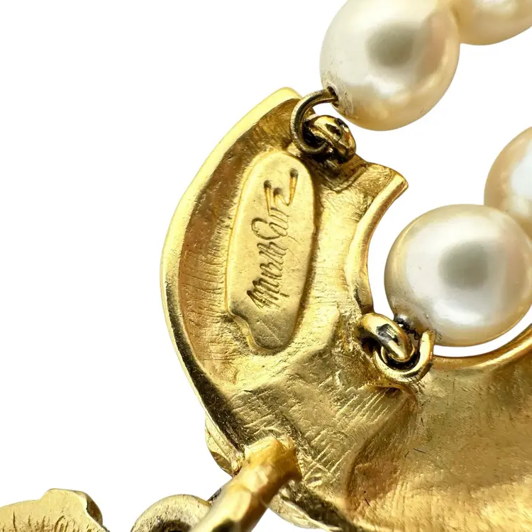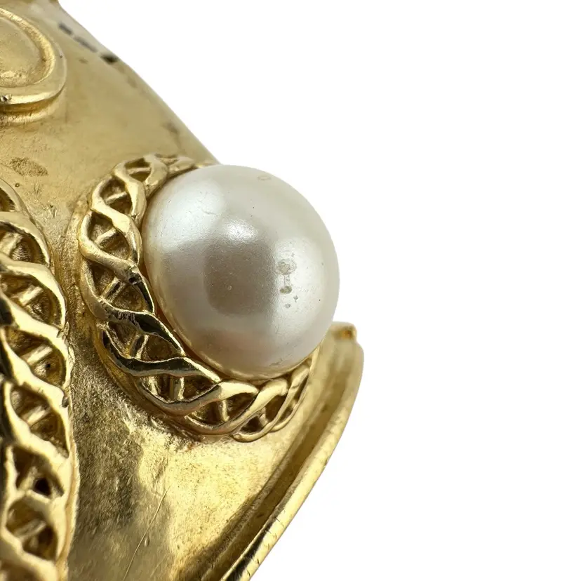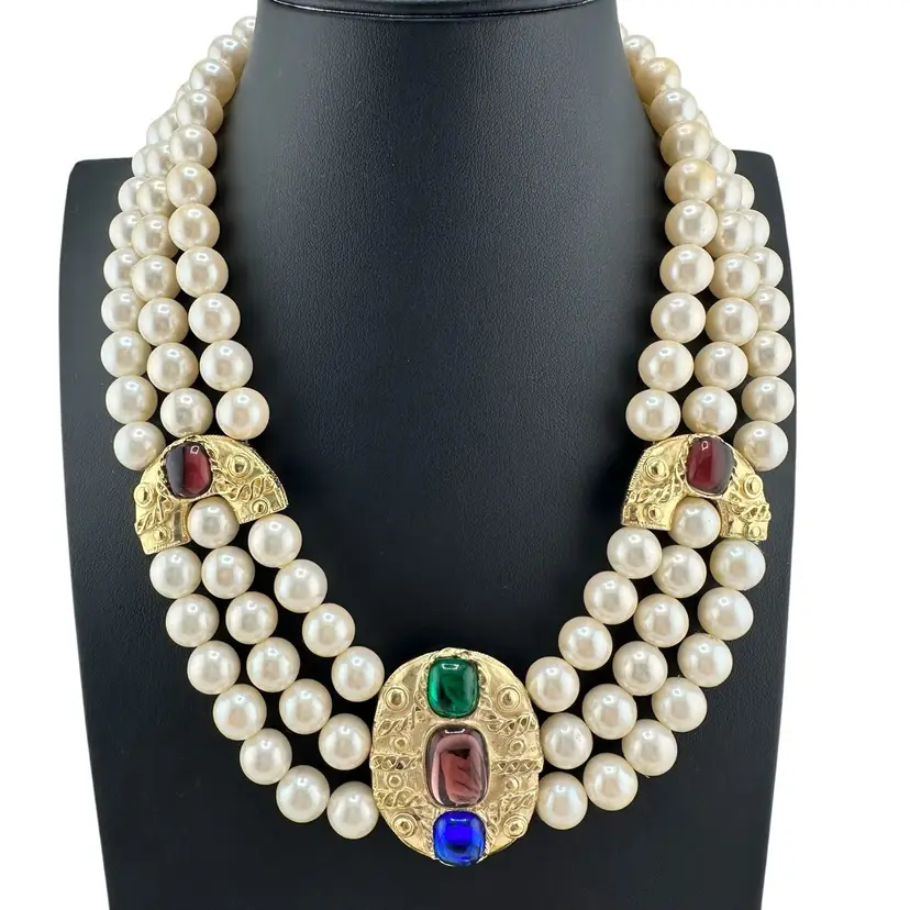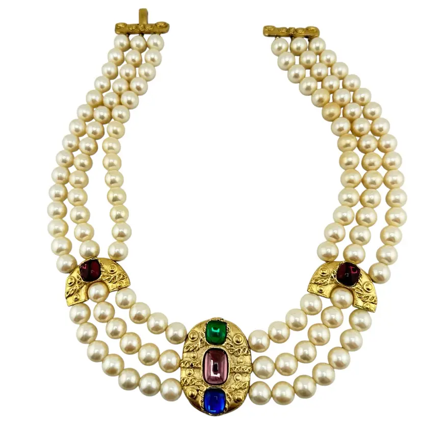 This is an extremly rare Marcella Saltz for Trifari earring, necklace, and bracelet set in Etruscan Revival style with multicolor gripoix glass faux gems. I cannot find another full parure of this set online (in fact, I have only found the earrings). It is in incredible condition, with only the back of the bangle showing any real loss of gold plating. Some of the pearls have slight discoloration, likely from exposure to skin oils/perfume/lotion in the past. I have only done a gentle wipe down to avoid doing any damage to the set, leaving additional cleaning or restoration to the buyer.