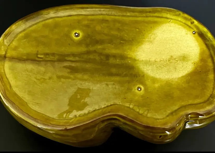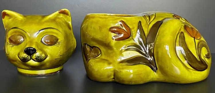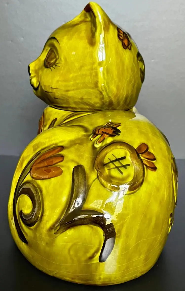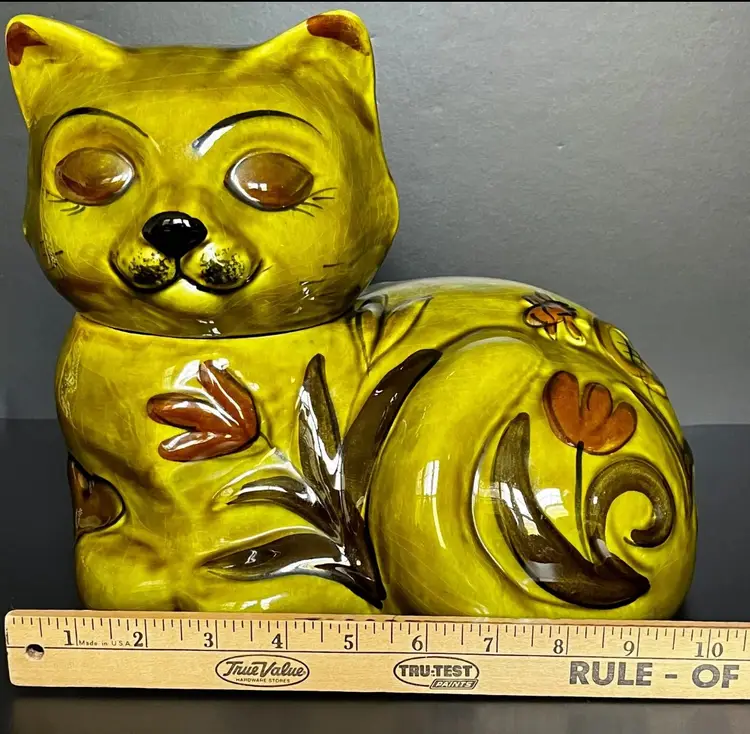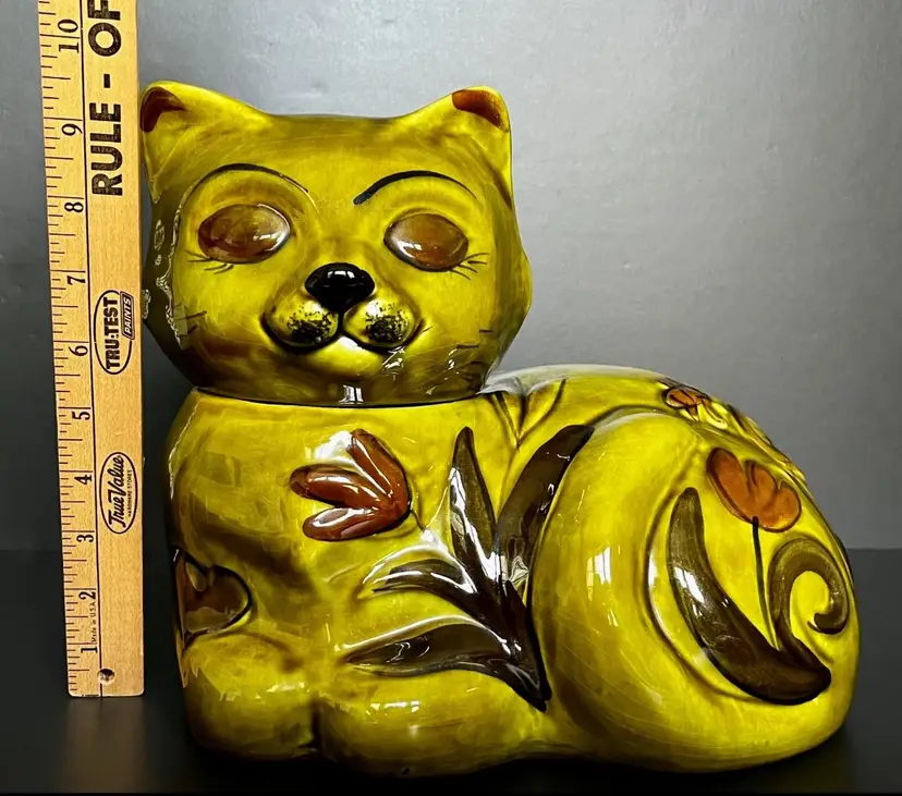 Mint pre-owned vintage condition. The cookie jar has age-appropriate crazing but no chips or cracks. A beautiful avocado yellow green color with floral design. Appears more chartreuse yellow in the pictures. Approx. dimensions: 10" L x 7" W x 9.5" H
