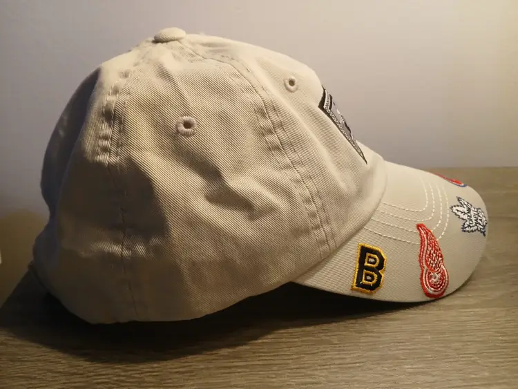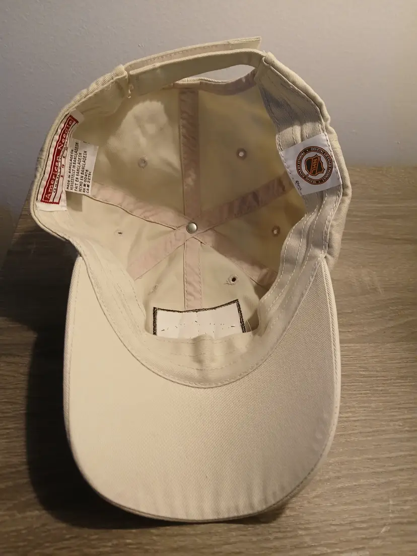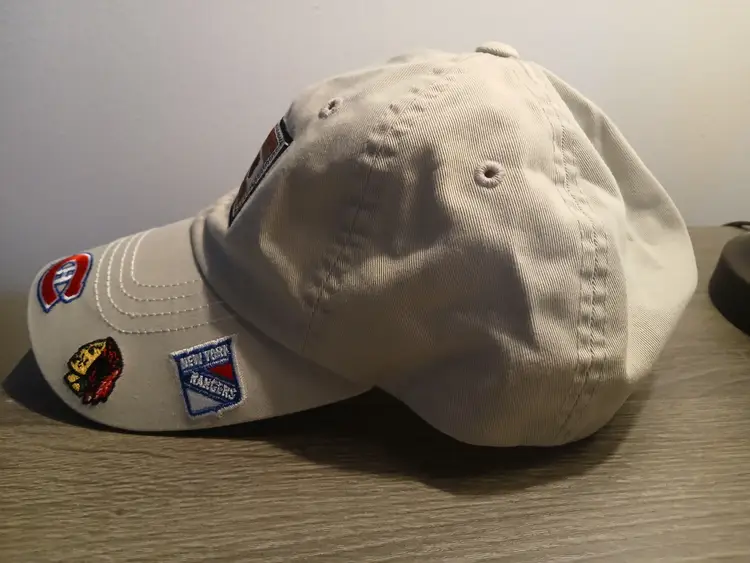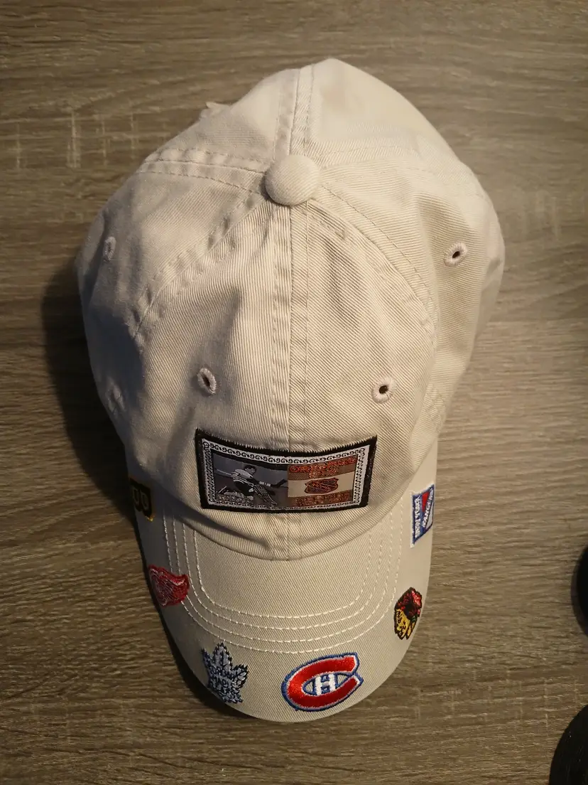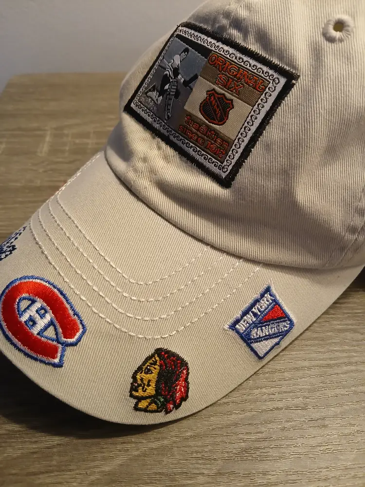 Amazing vintage American Needle Original Six NHL baseball hat. This officially licensed cap is perfect for any hockey fan, with its unisex design and one size that fits all. The cap features the logos of the Original Six teams that were established in 1917 (Boston Bruins, Detroit Red Wings, Toronto Maple Leafs, Montreal Canadians, Chicago Blackhawks, and the NY Rangers), making it a great addition to any fan's collection. Made of high-quality 100% cotton in a neutral light beige colour with a velcro back strap closure. In excellent pre-owned condition, with little to no wear. A very unique and rare NHL find!