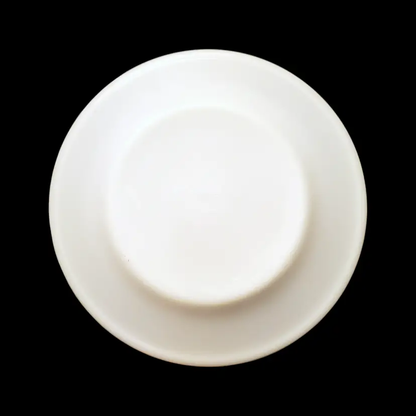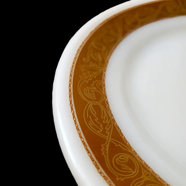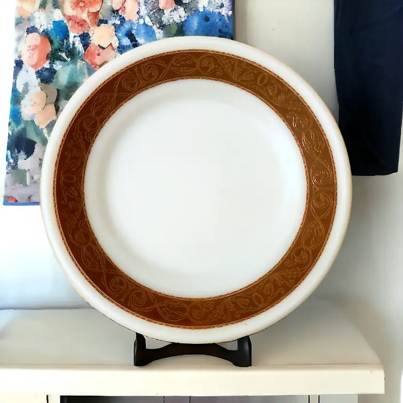 Rare pattern plate made of milk glass featuring a bronze colored rim with an intricate scroll design. Has some very minor scratches in the middle of the plate but otherwise in good vintage condition.