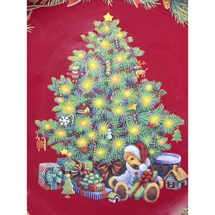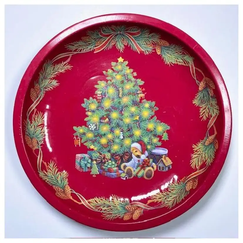 RARE Round Red Tin Serving Tray Christmas Tree Pine Swag Holiday Decor. Measures 10.5" x 1.5" No scratches. A beautiful decorative piece.