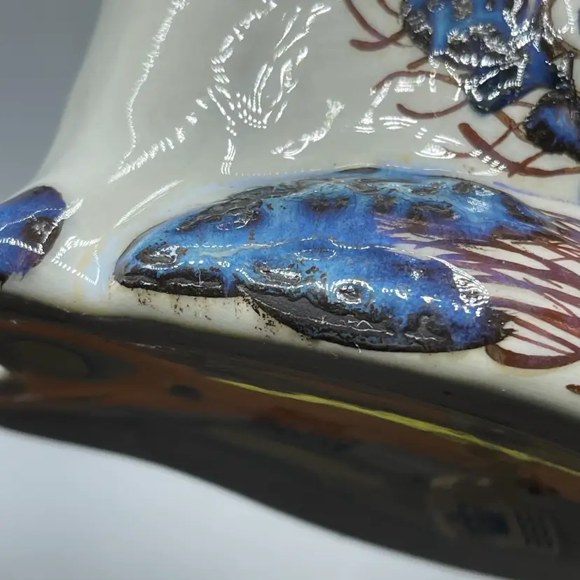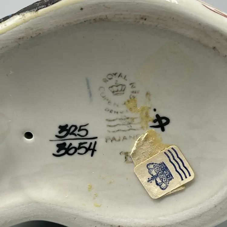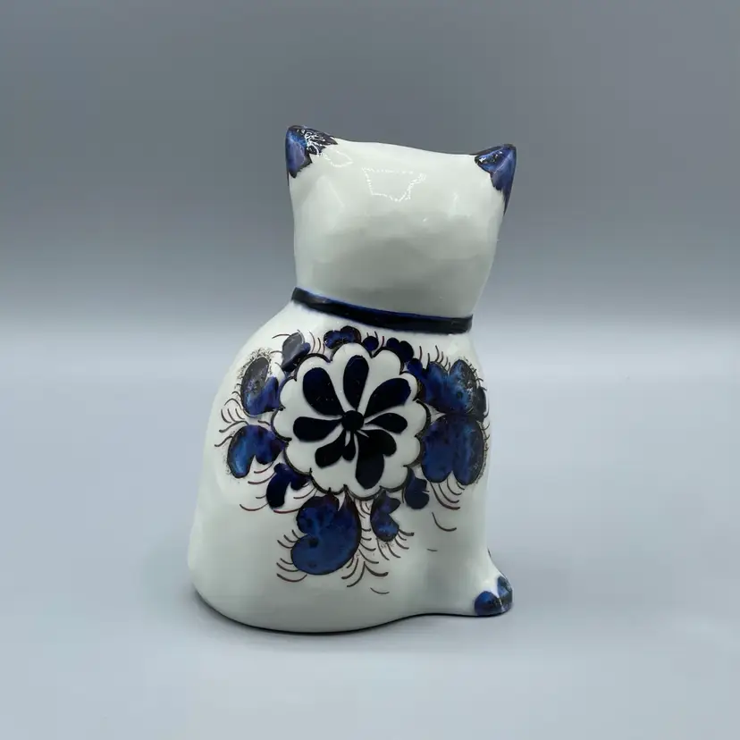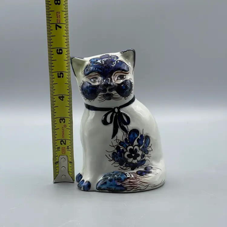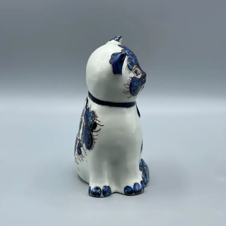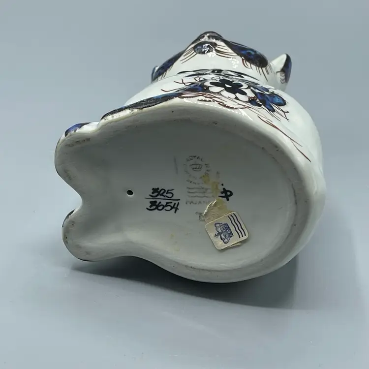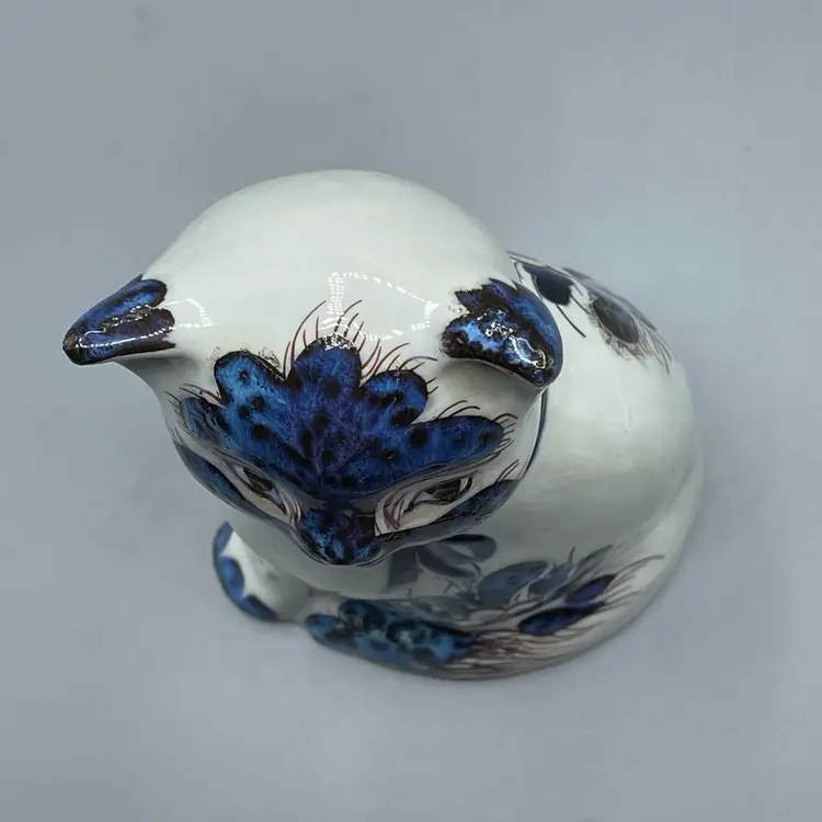 This striking cat figurine produced by Royal Copenhagen in the mid 1960’s has unique blue glaze and texture around its face, ears and floral motifs. This figurine is marked and also retains its original label. There are no chips or cracks and it stands about 5-3/4 inches tall.