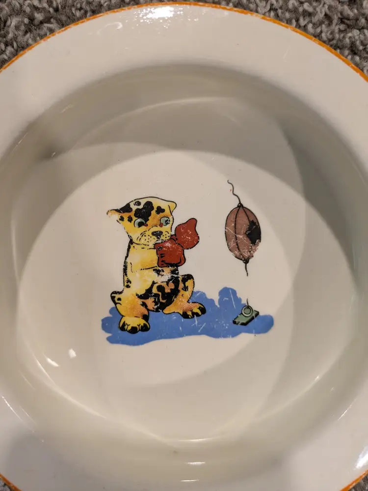 Antique children's dish featuring a boxing dog. Excitement condition, no chips or cracks.