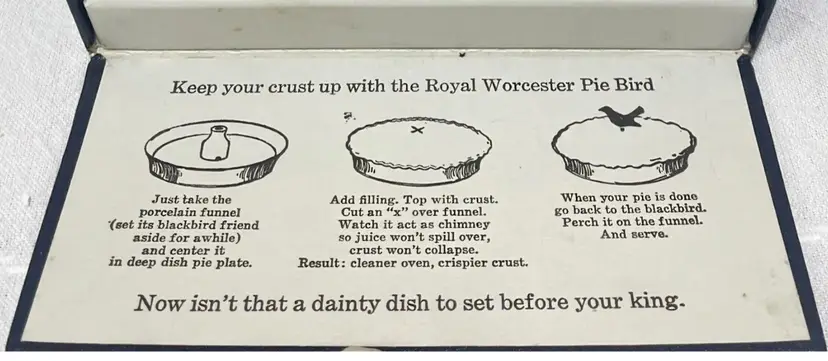 Royal Worcester England - Porcelain Pie Bird - used as funnel for baking perfect pie. See last picture for instructions. Or.... use it as Bird Figurine. Condition: very good. Measurement: 5" tall with the stand.