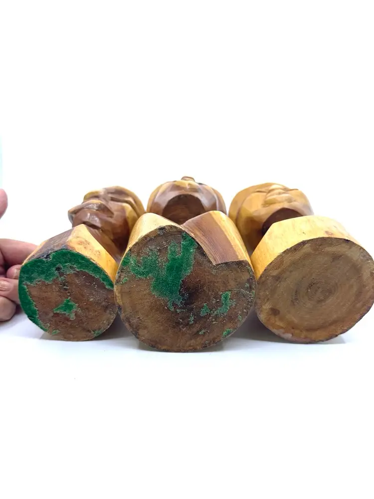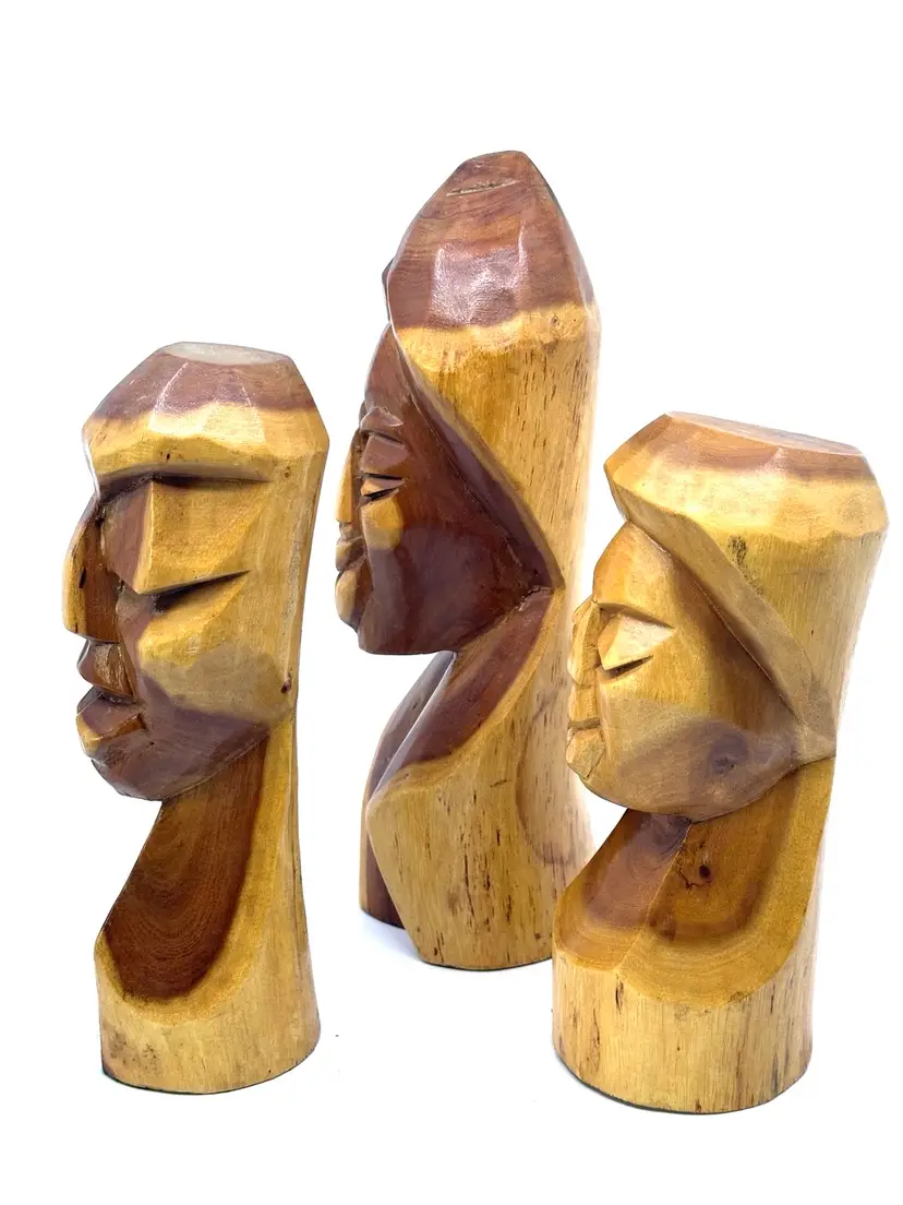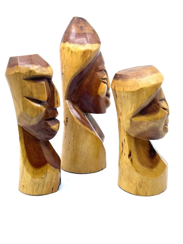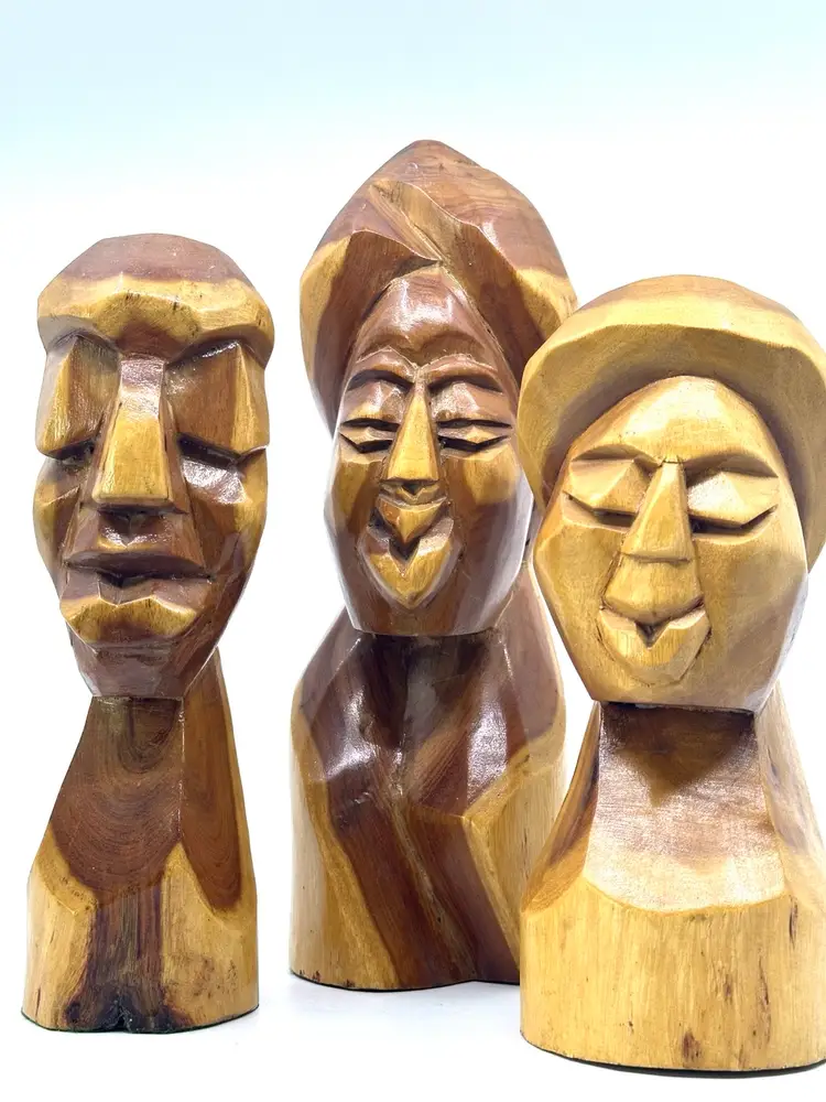 This set of three rustic wood carvings is a unique addition to any art collection. Hand-carved in the 1970s in the Bahamas, these sculptures feature a Rastafarian style and are made from high-quality wood. The intricate production technique used to create these sculptures makes them one-of-a-kind pieces of art.
