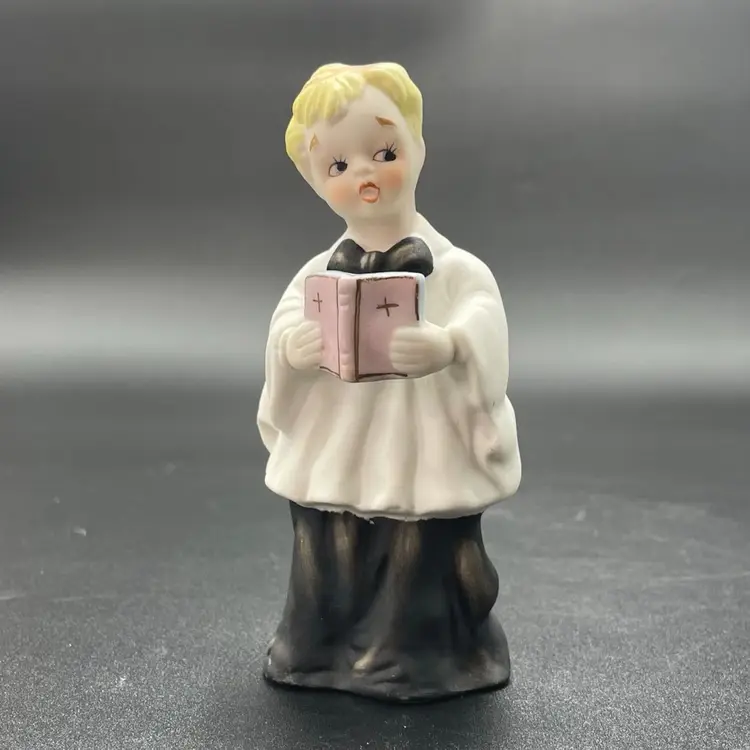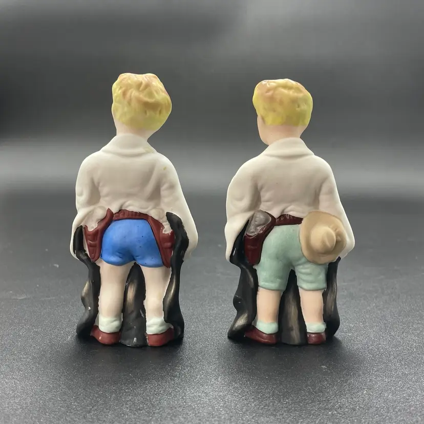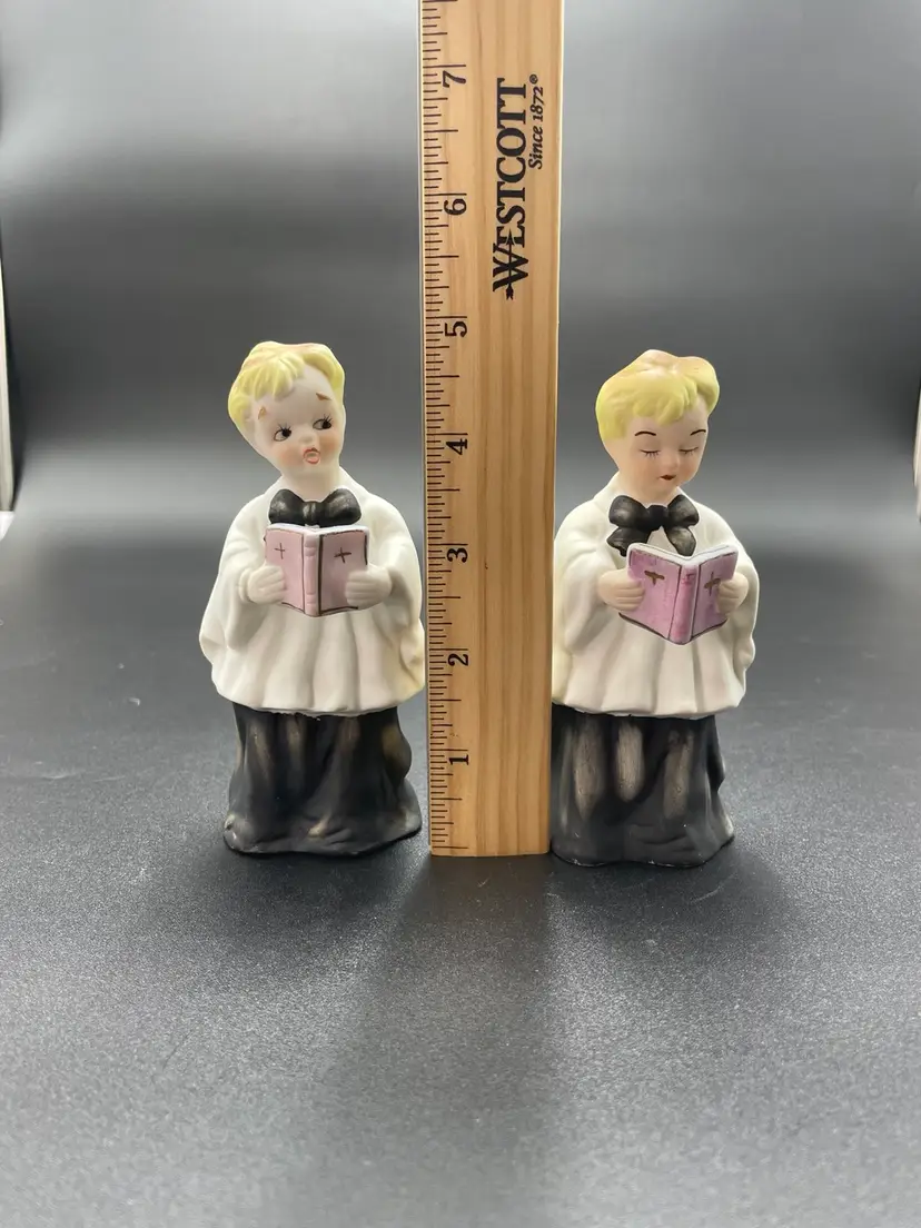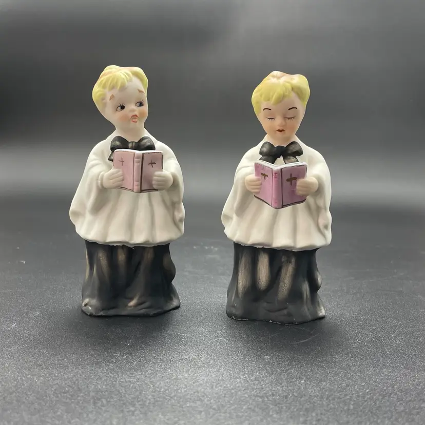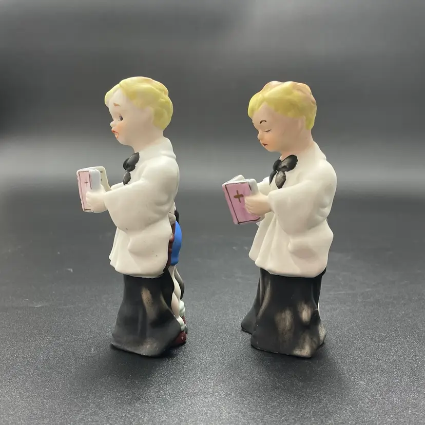 This is a set of 2 rare vintage Lefton #044 double sided figurines depicting choir boys. Their fronts show them in robes while their backs show what's underneath....cowboy hats and holsters! One of the boys still has his original Lefton label. Each measures approximately 5" tall. Picture 6 shows a little staining on the back shoulder of one. No chips or cracks.
