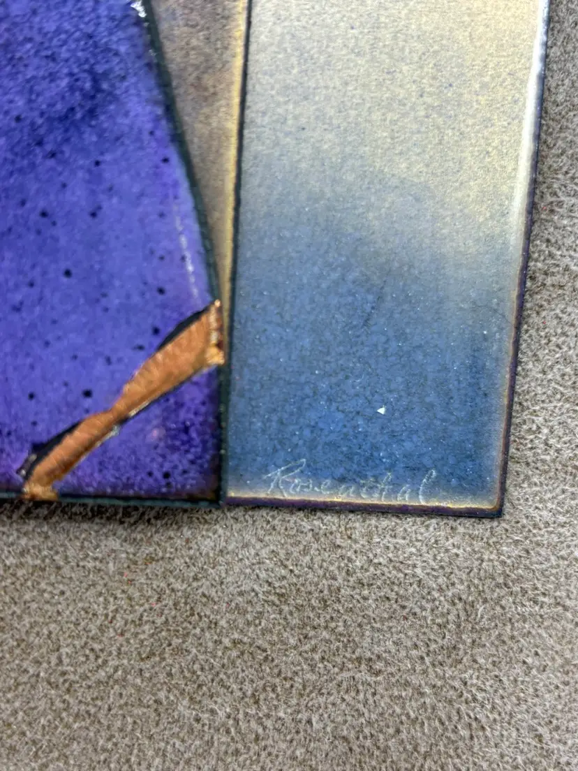 Shirley Rosenthal (1924-2015) has been exhibiting her enamel wall-panels since 1965. She participated in national juried shows sponsored by American Crafts Council at Rhinebeck, NY and Baltimore for 14 years, working with galleries, private commissions and direct sales to the public.Rosenthal has served on numerous juries, including One Hundred American Craftsmen, Kenan Center, Lockport, NY; East Aurora Art Festival; Allentown Art Festival, Buffalo, NY; and Roycroft Art Festival. Ms. Rosenthal's work is included in many public and commercial buildings, among them Blue Cross/Blue Shield lobby, Buffalo, NY; Moog, Inc., East Aurora, NY; Life Technologies, Grand Island, NY; Brylin Hospital, Buffalo, NY; Sisters Hospital Board Room, Buffalo, NY, as well as many private collections.She has taught enameling at the Jewish Center of Greater Buffalo, at Kenan Center, Lockport, NY; at Elderhostel sessions in Lewiston, NY and has given numerous enameling workshops.Ms. Rosenthal participated in the Kenan Center Craft Festival every year since its inception in l972 and was awarded Master Craftsman status and received Best of Show Award. She is also a member of Buffalo Society of Artists and has exhibited annually in its juried exhibitions and has been awarded numberous honors from that organization. Her work was exhibited in the Craft Art of Western New York at the Burchfield-Penney Gallery in 1990, 1992 and 1994. She is represented in the Charles Rand Penney Collection and the Annette Cravens Collection at the Anderson Gallery.In the past two years Ms. Rosenthal has turned her attention from enamel wall-panels to mixed-metals wall-reliefs, in some cases combining enamels and various other mixed media objects.In 2010 Rosenthal's work was exhibited in Extraordinary Forms II, Kenan Center, Lockport, New York and in the Buffalo Society of Artists Gallery at Artpark in Lewiston, New York for the 2010 season.Currently she works by commission only but in the past has had her work exhibited in many fine galleries throughout the country, primarily the Holsten Galleries in Palm Beach, Florida and Stockbridge, New York. Her work has been included in the books "Enamels, Enameling, Enamelists" and "Ecclesiastical Art."