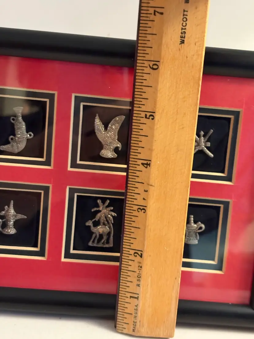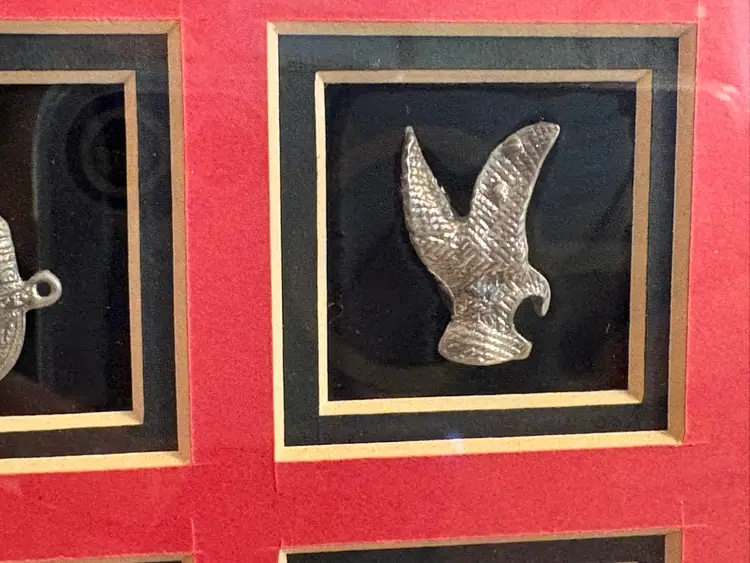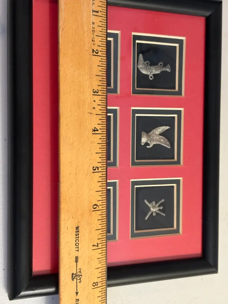 Display: The silver pieces are framed, with a black and red background.