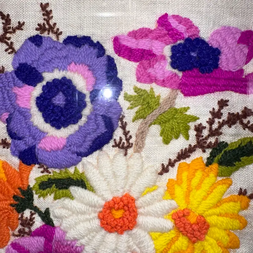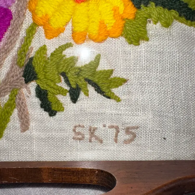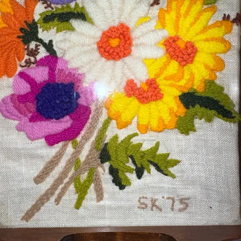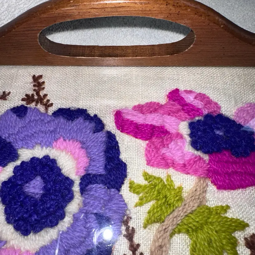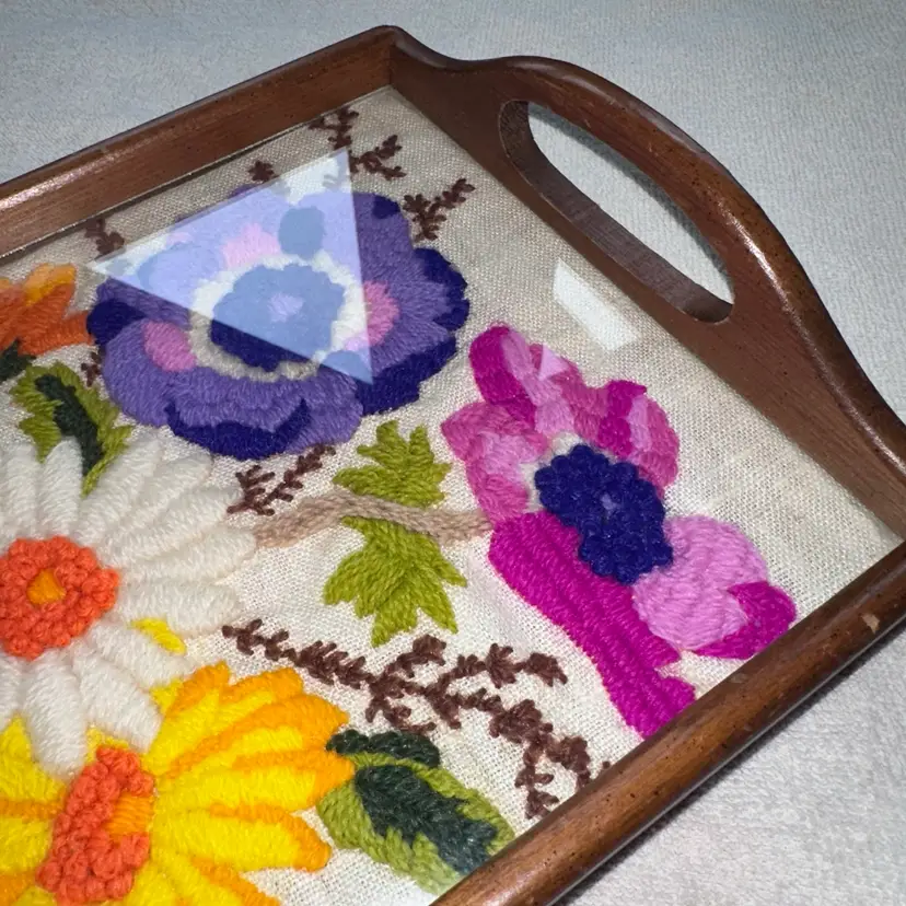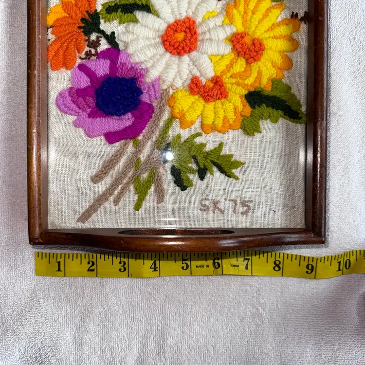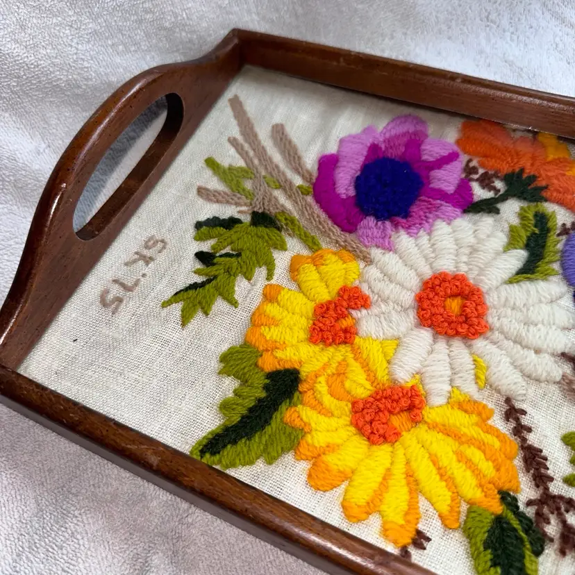 RARE Unique 1975 Needlepoint Floral Wood Glass Top Serving Tray. Beautiful Bright Colors Yellow Orange Purple Pink. One Of A Kind Handmade Piece. Smoke Free Home. #needlepoint #vintage #1975 #servingTray #handmade #woodentray