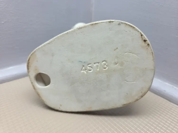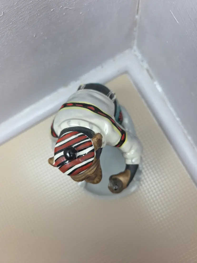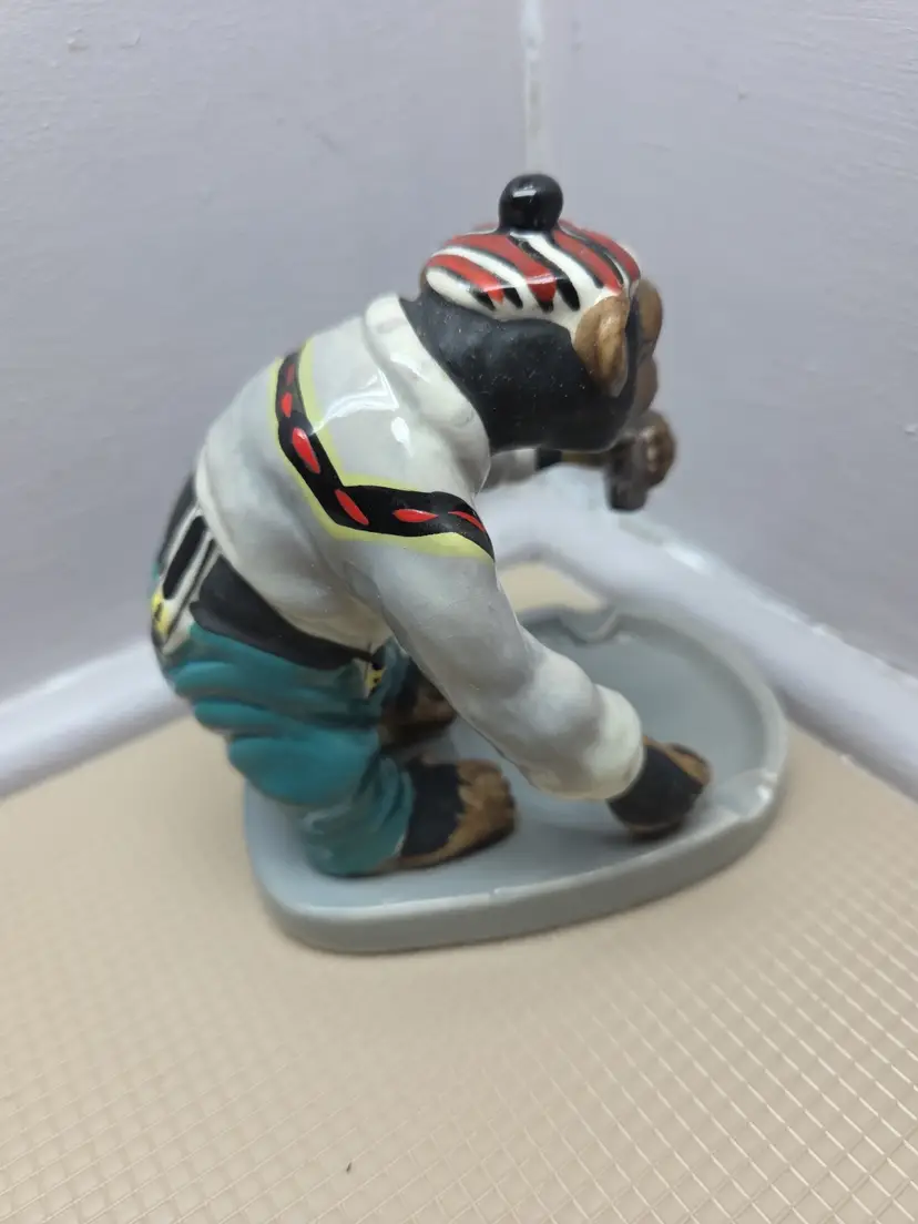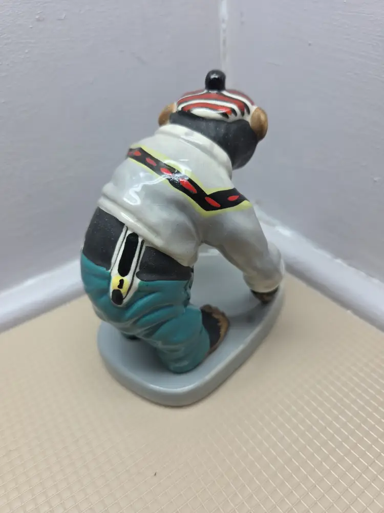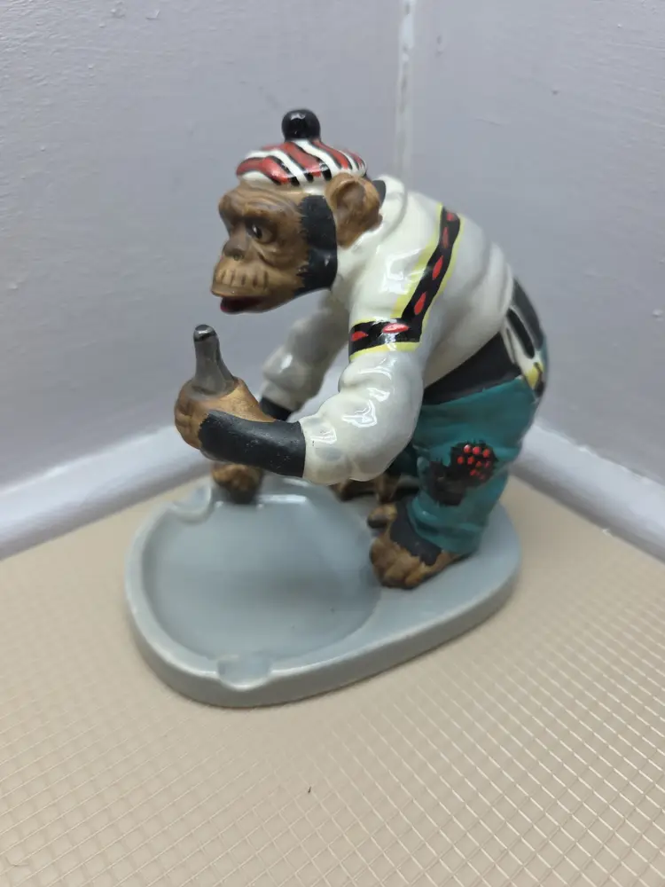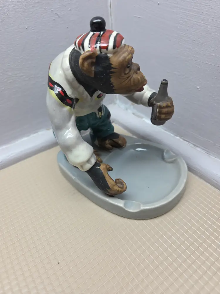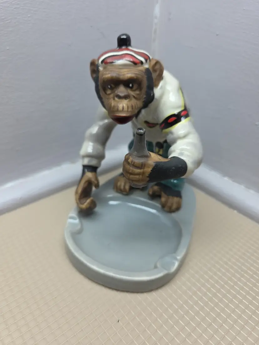 This vintage 1950's Japan chimpanzee monkey figurine is a rare and unique collectible piece. Hand-painted on porcelain, the monkey is holding a bottle and is adorned with a glossy and matte finish. Standing at 5 inches tall and 4 inches wide, this small figurine is a charming addition to any room. With its mid 20th-century style and Japanese craftsmanship, this piece is sure to delight collectors of vintage decor and animal-themed items. B-1