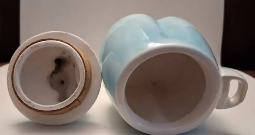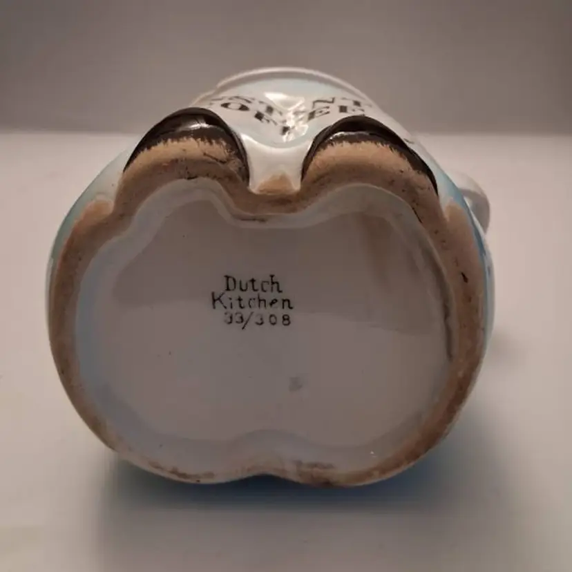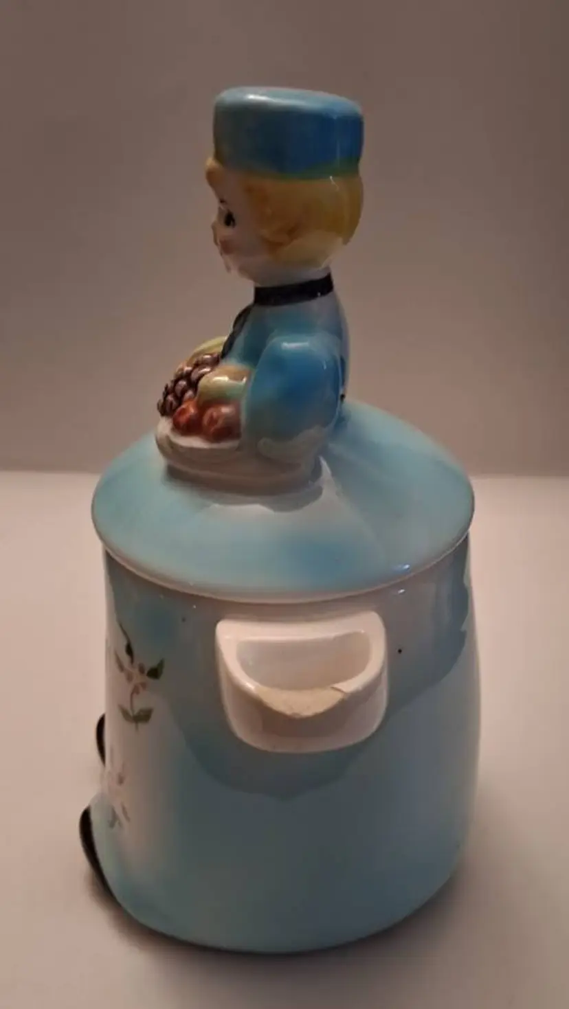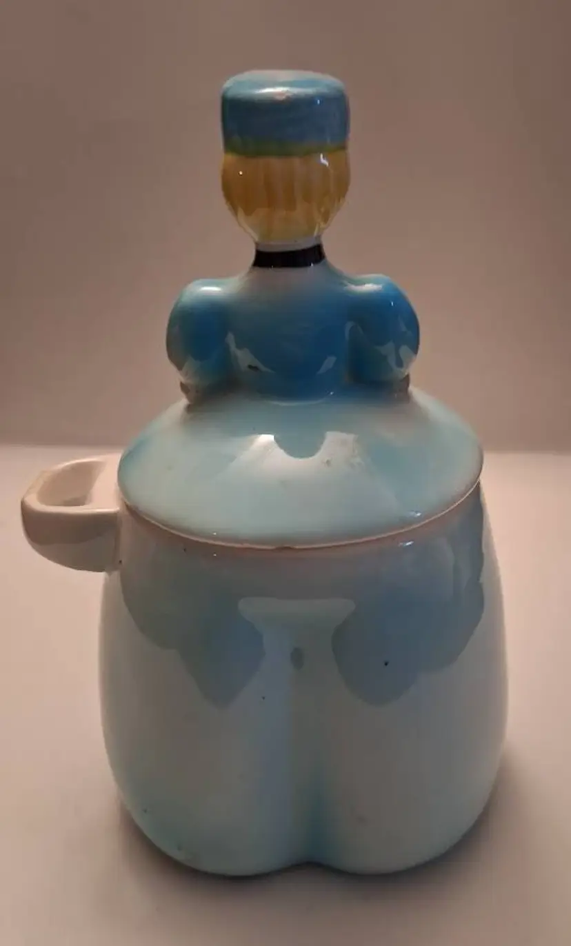Approx 5 1/2 inches high. Very good cond. Chip on scoop holder on right side.