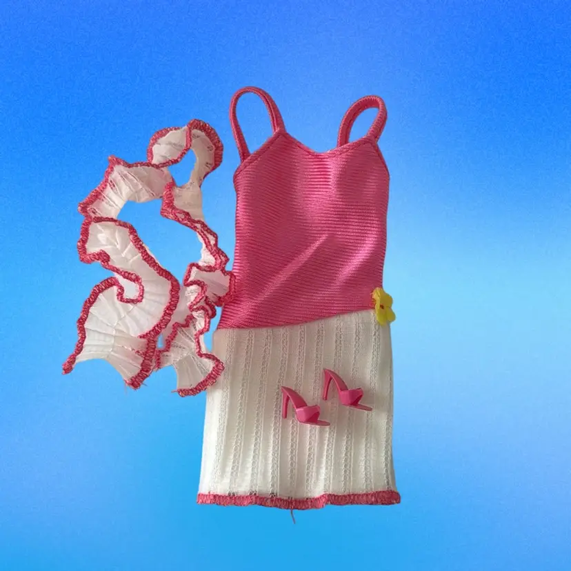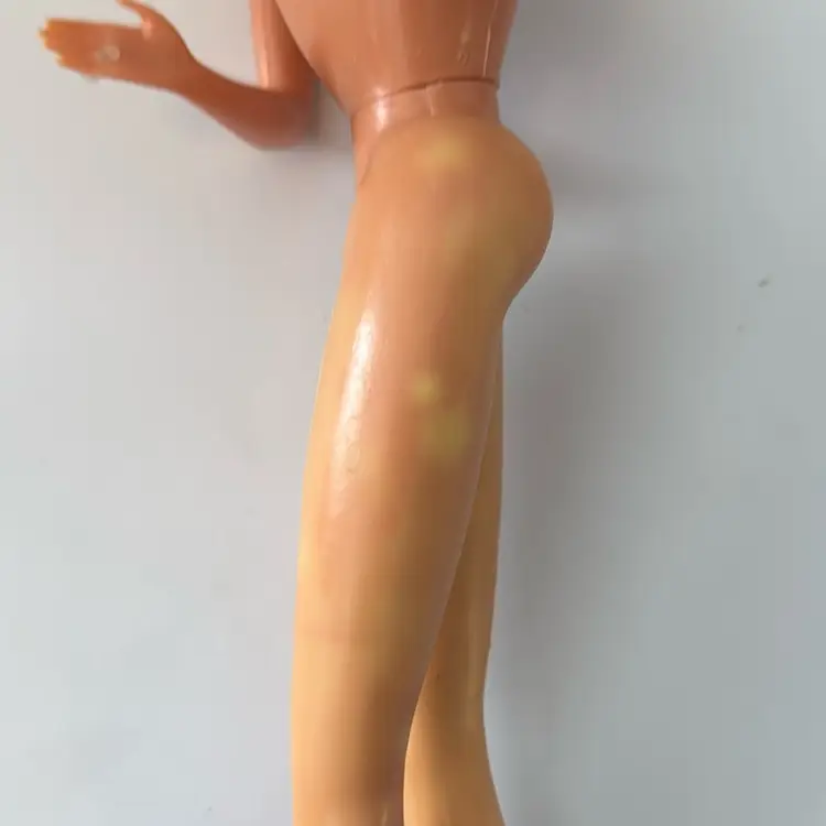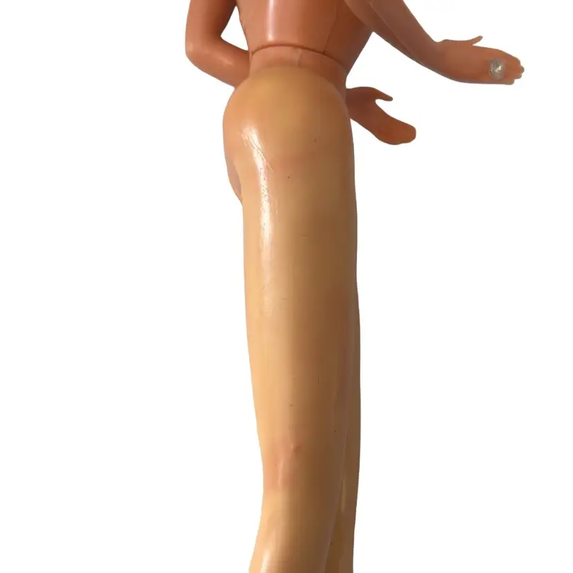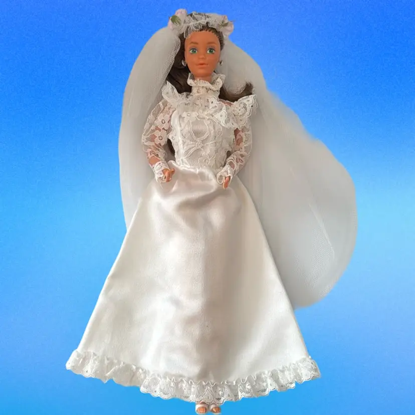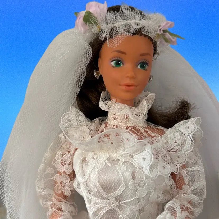 This is a Tracy “Steffie Face” Barbie She's a Bride Doll by Mattel with the coveted Steffie Face Mold. “She's a Bride! - Barbie Doll's Beautiful Friend!”- Doll Comes With: wedding dress, veil w/ flowers, ring, earrings, white shoes, long lilac Grecian dress, pink & white cocktail dress with shawl & pink shoes, hot pink bathing suit & matching wrap skirt, white evening dress with gold lame shawl, these additional Barbie outfits appear to be 1980’s era so we included them in this lot. Please note we have taken photos of this doll without clothing to show condition. Her face, hair and torso are in great condition. Her legs have some discoloration which can be seen in photos. Perhaps her legs could be swapped out because this is the only flaw I see. She still displays beautifully.