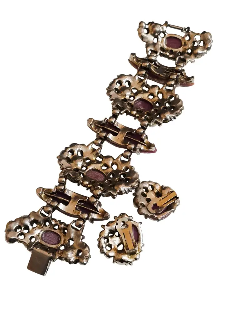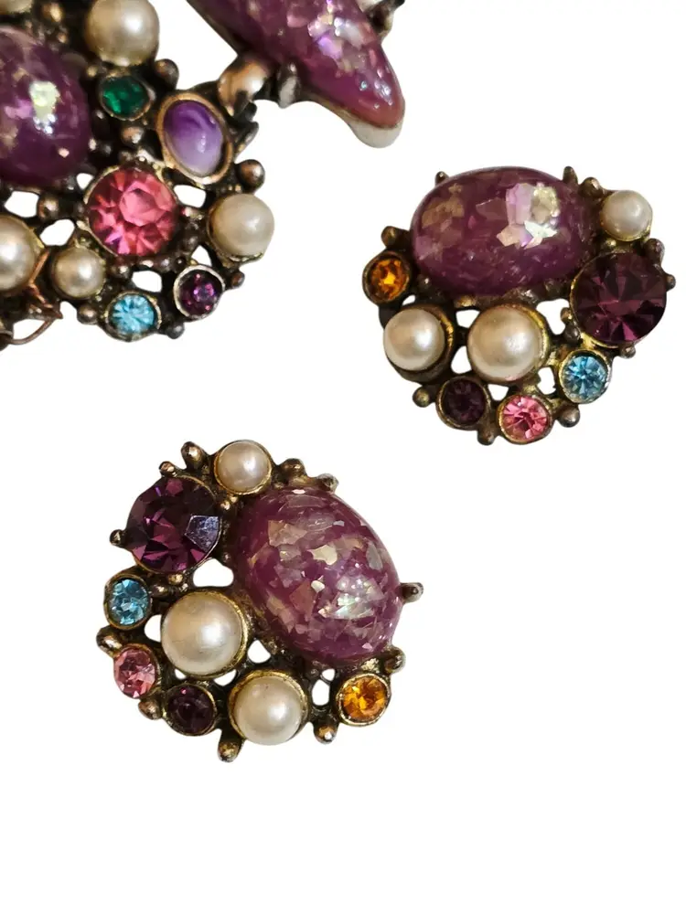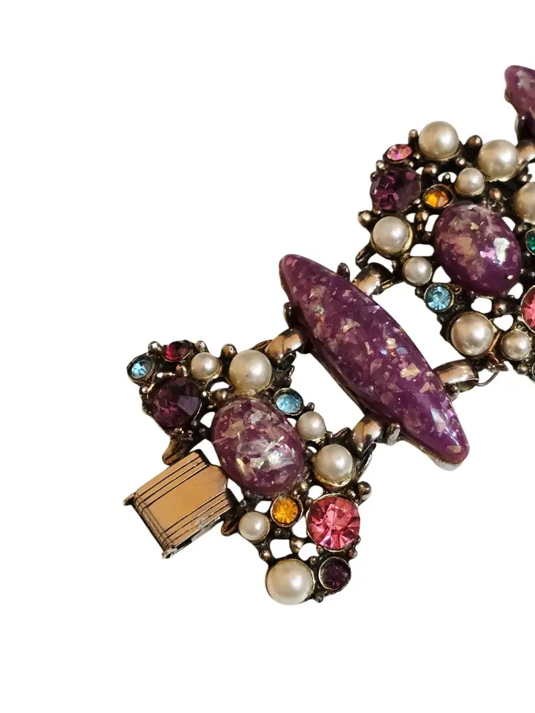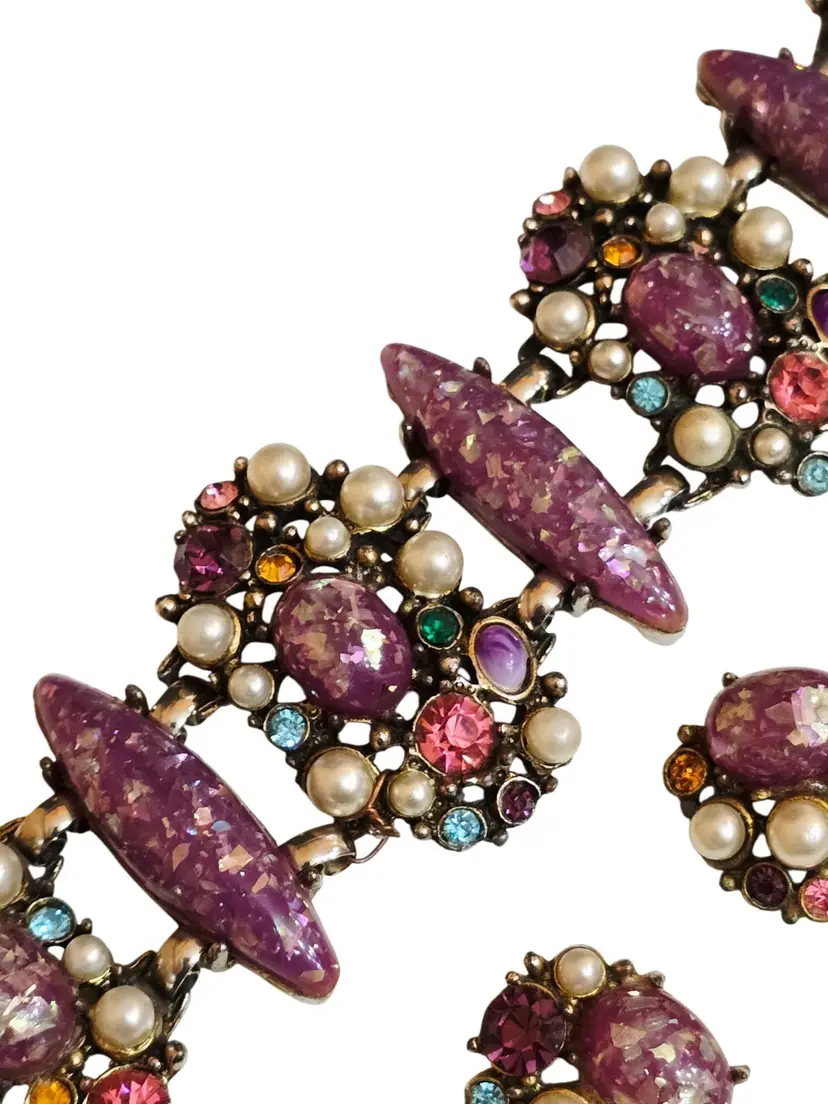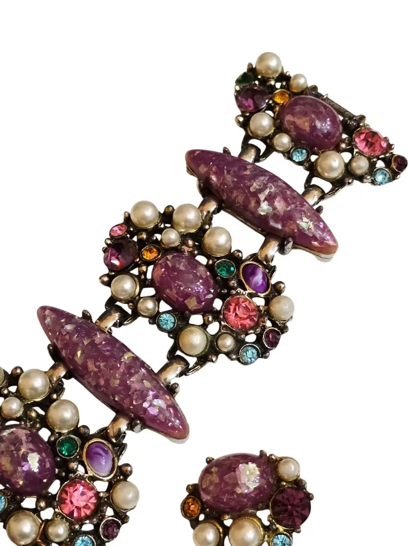 Size: The bracelet measures 8" by almost 2" wide. Clip earrings 1" Color: Multicolor Condition: Very good vintage Signed: None Details: Not marked, but very well made! Resin confetti, glass rhinestone, and pearl. Secured with a fold-over clasp, the set is heavy!