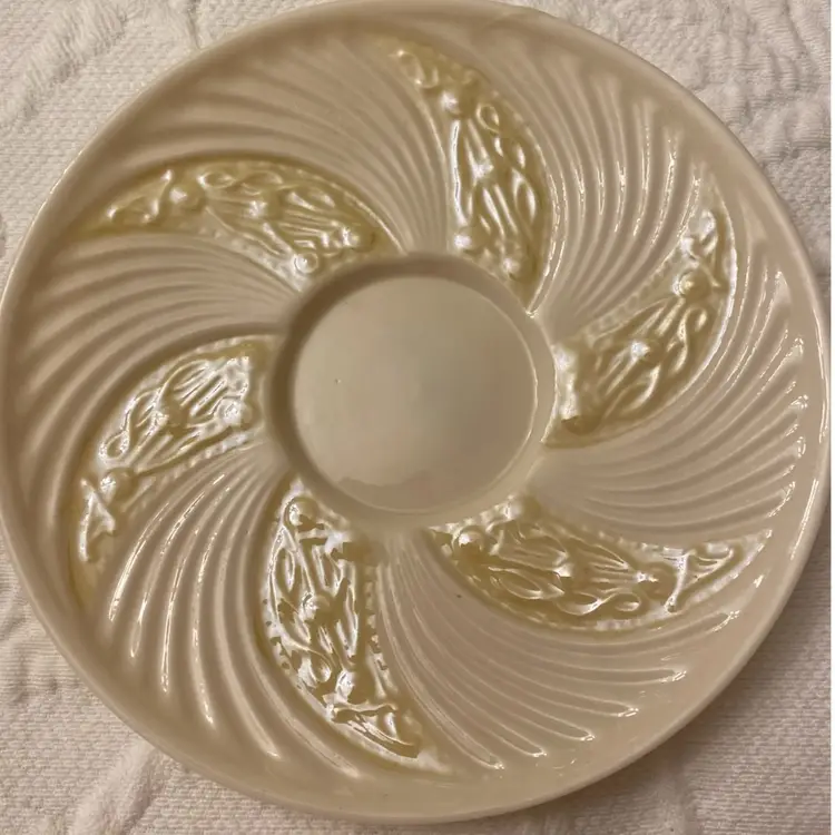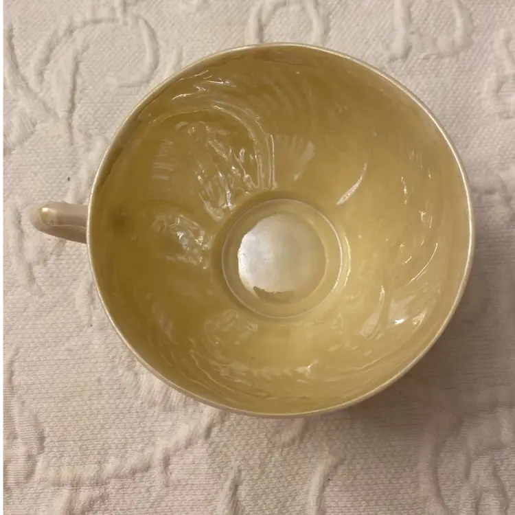 This is the neptune pattern and bears the Fifth Green mark which was used from 1955 to 1965. The swirling design and insides are a soft iridescent yellow. It looks just like a sunshine in a tea cup in soft tones of cream and yellow. I tried to capture it in different lighting to really show its full beauty.