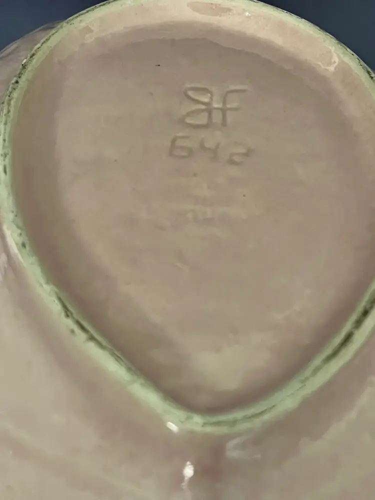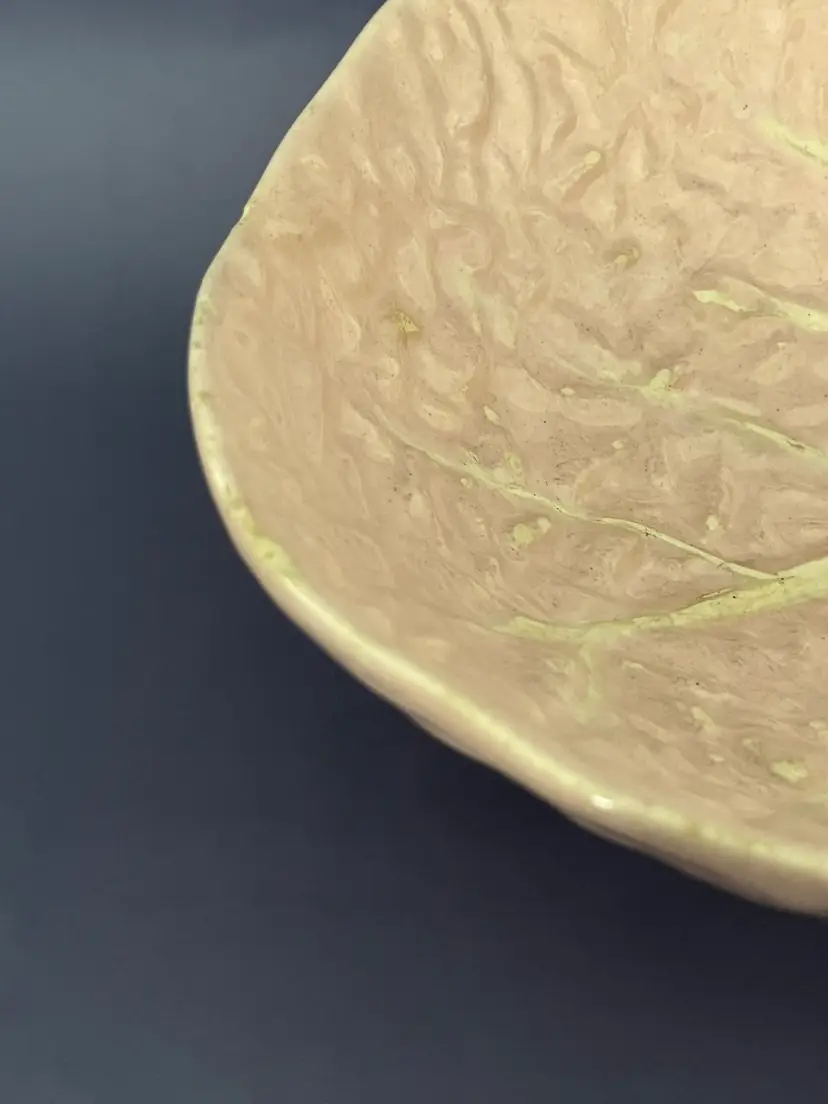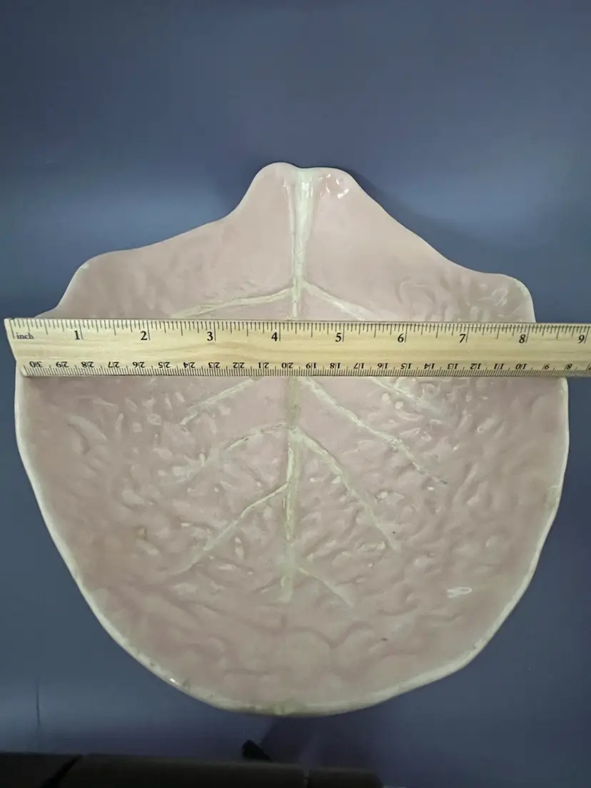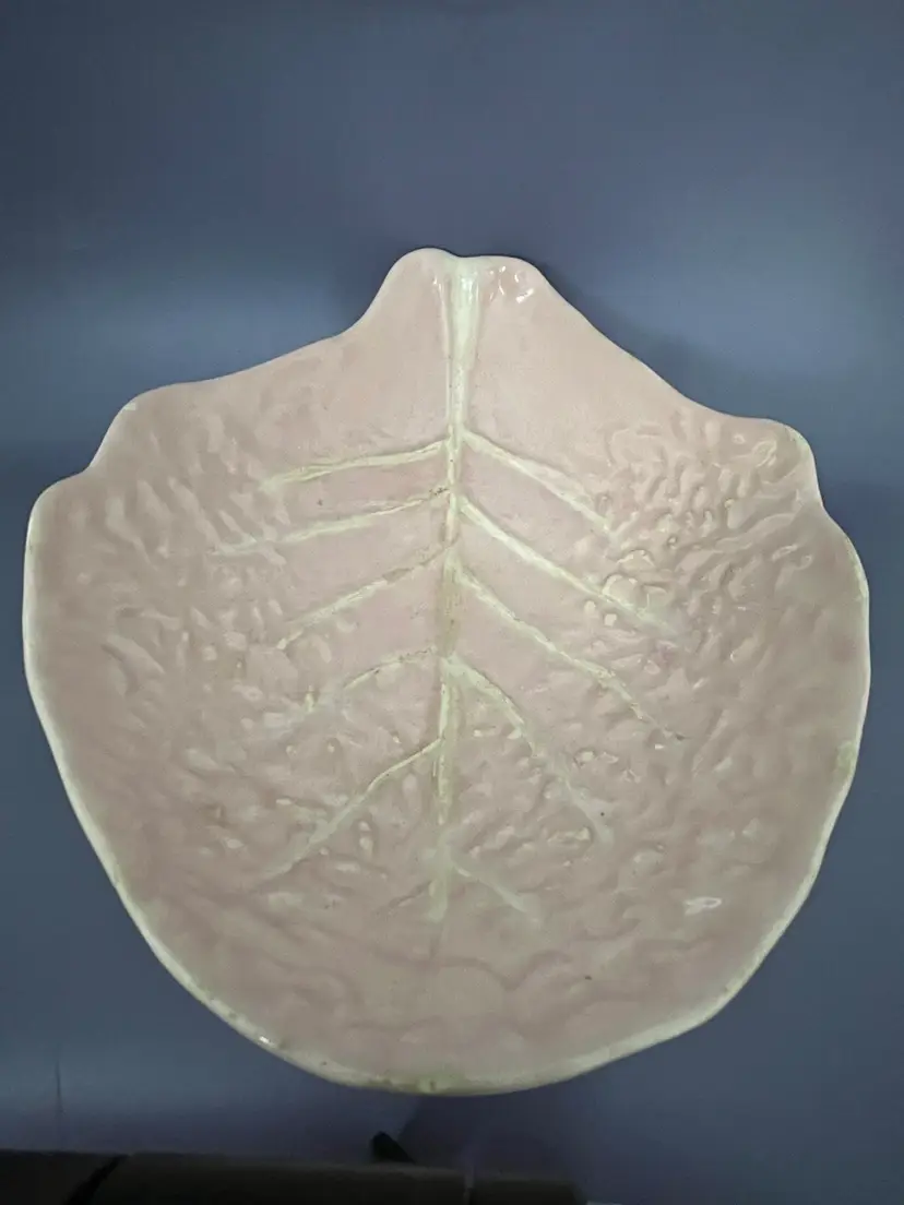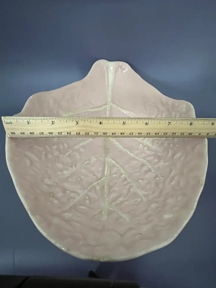 Amazing and rare JF Olfaire Portugal Pottery in pink cabbageware. Olfaire was started by Rafael Bordalo Pinheiro in 1884. This vintage 1960s Majolica bowl is perfection for entertaining. This unique piece is a must for the cabbageware enthusiast. There are a few nicks along the edges of this intricate pottery design but I have forgiven them due to the rarity of this find. Measurements: 12”L x 9.5”W x 3”H