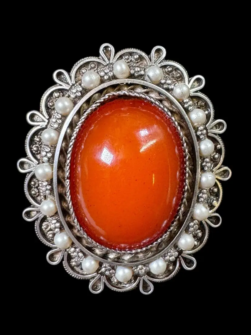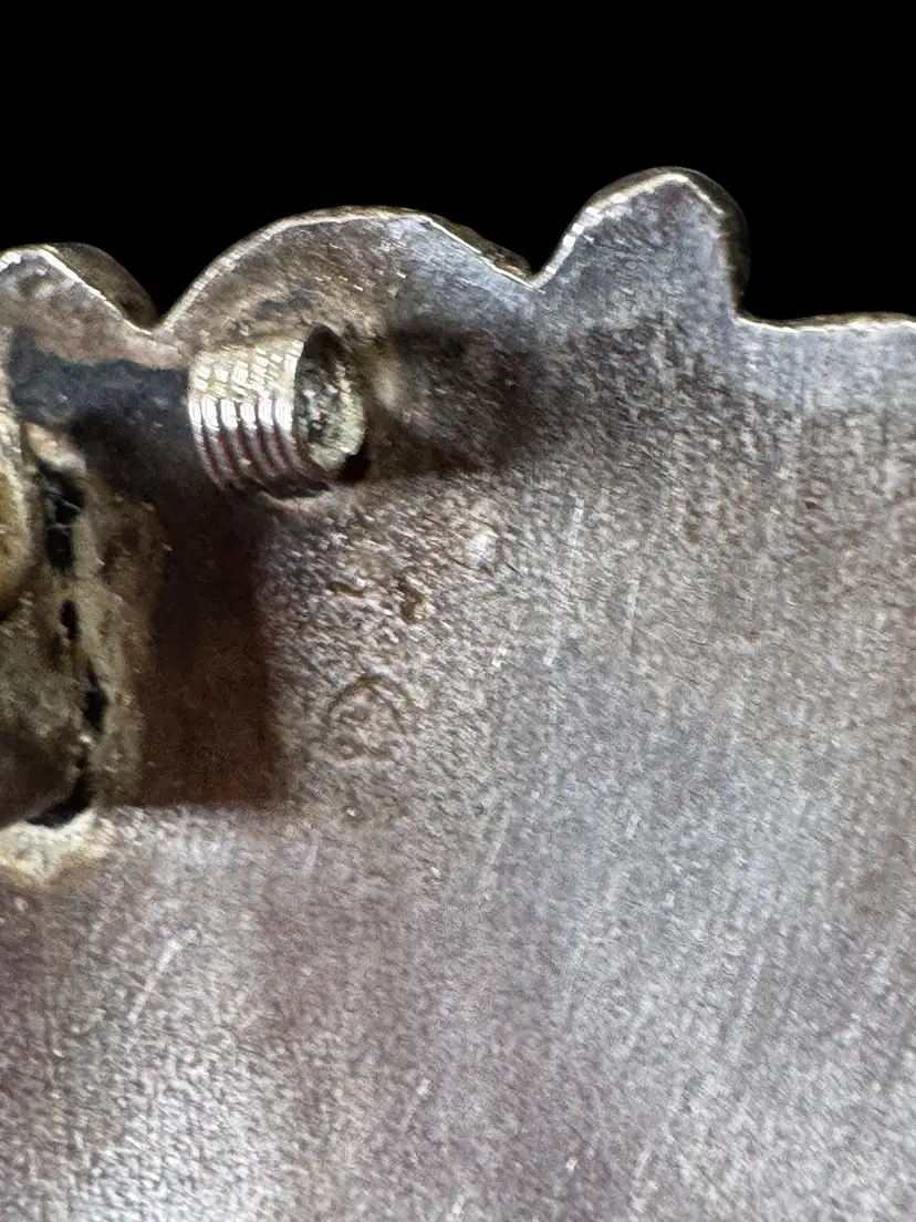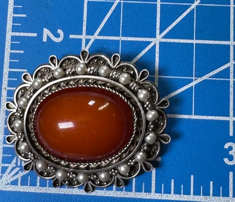 There is some silver in the brooch but not enough to call it silver. Because of its origins I suspect a maker with German influence, it looks German made, and is probably “German Silver” which is only partially silver usually mixed with zinc, nickel, and tin.