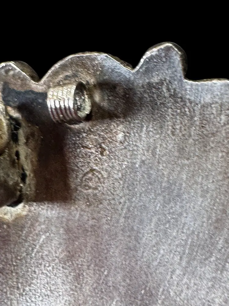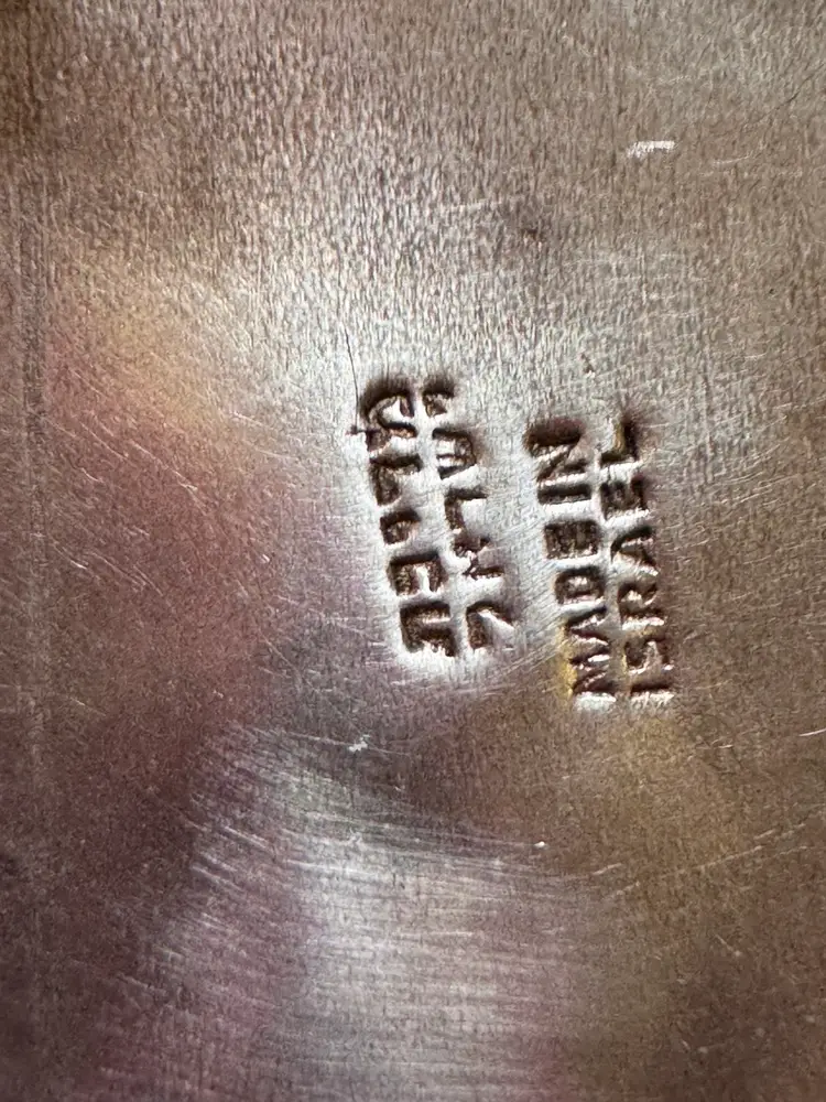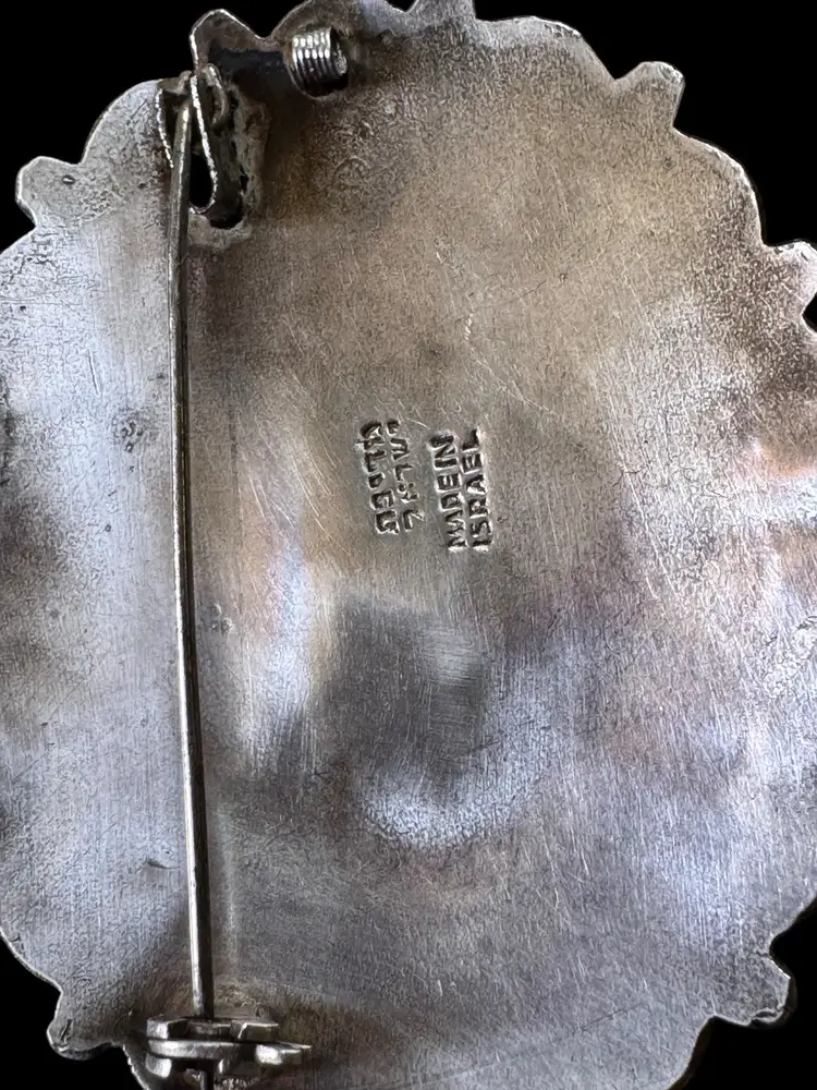 This amazing find was made in Israel and is stamped in English and Yiddish - I think. At first I thought the center might be Amber, but after the black light test failing, I tried 409 which produced positive results for Bakelite.