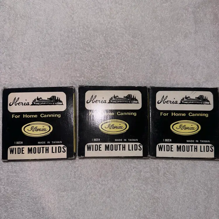 RARE Vintage NIB Iberia Wide Mouth Canning Jar Lids Set Of 3 Boxes. Each Box Contains 12 Lids. Lids Are Unused And In Original Box. Seals Are Intact. Made In Taiwan. Smoke Free Home. #iberia #widemouthlids #canning #homecanning #canninglids