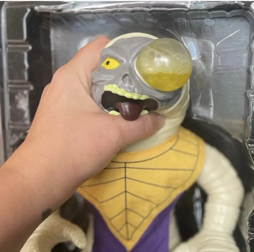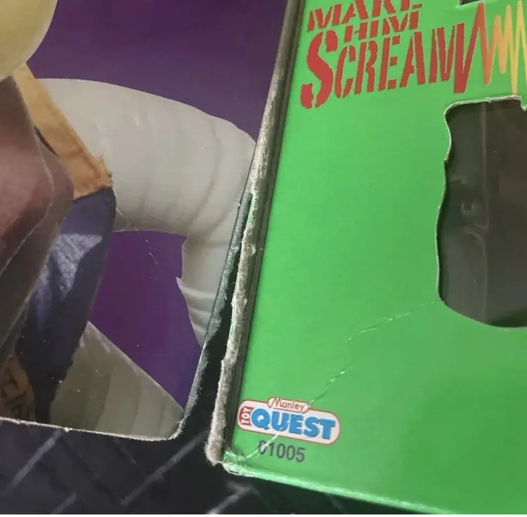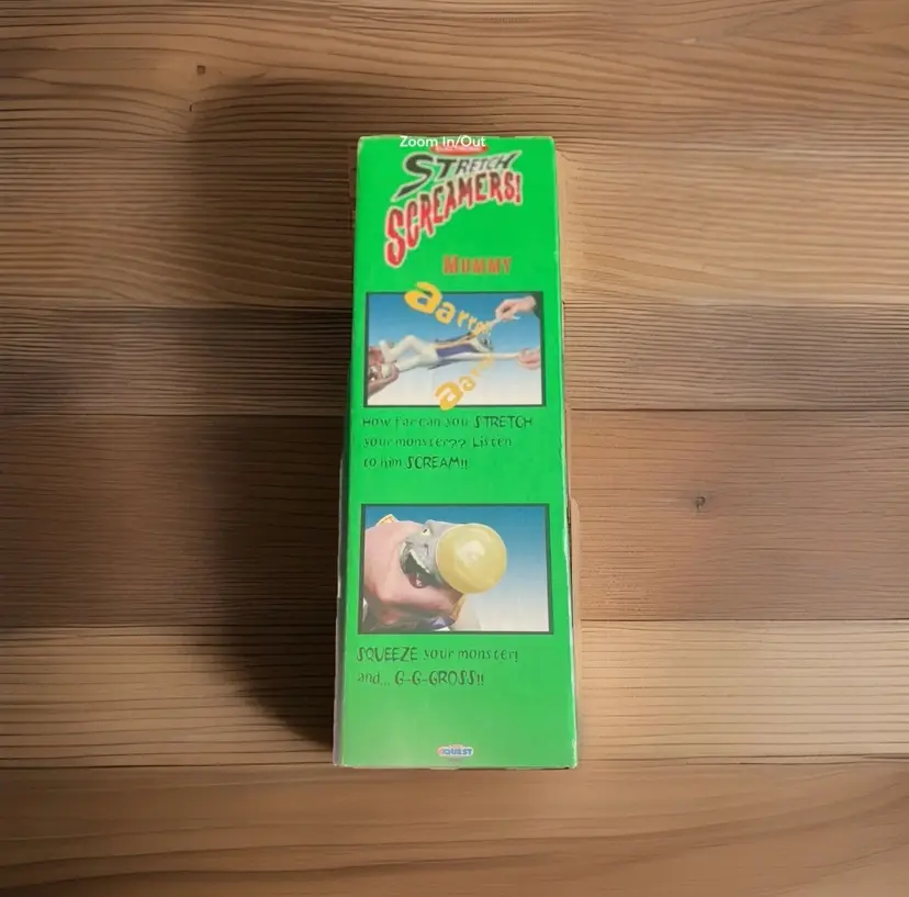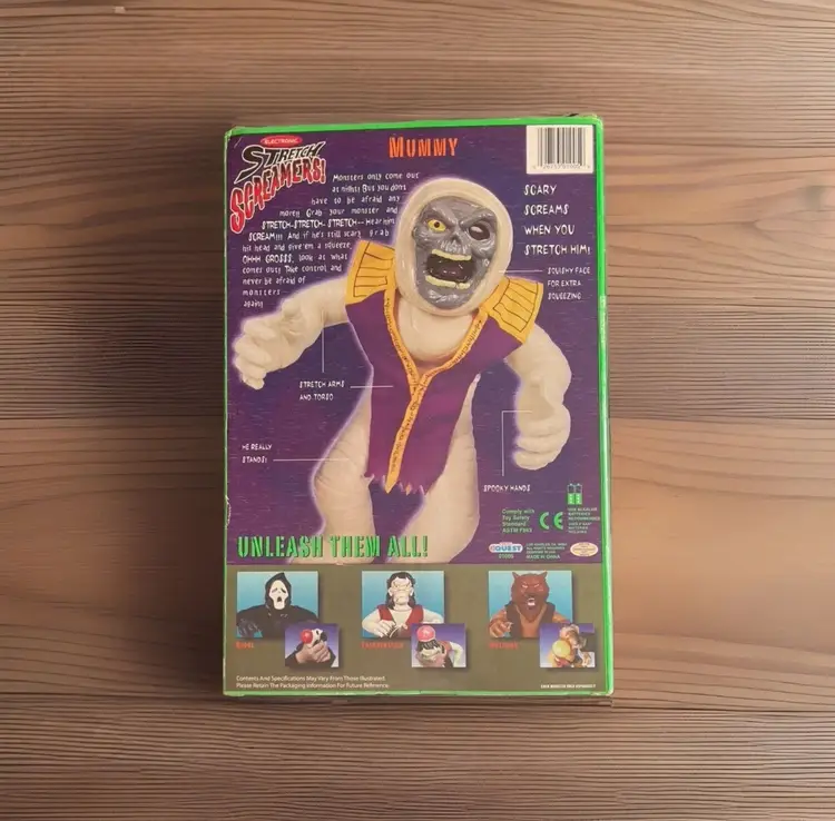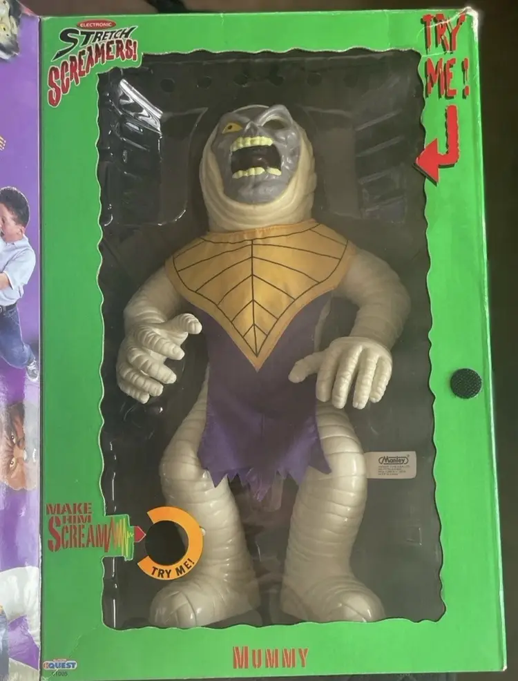 This is a rare and vintage electronic action figure from Quest Toys, featuring The Mummy Monster from the 1990s horror movie "The Mummy". The figure is made of plastic and rubber, and is boxed for display. It is an original licensed reproduction, and was manufactured in the early 2000’s. The figure is part of the Stretch Screamers series and is a great addition to any collection for fans of horror movies and action figures. The battery component is clean and toy has been tested and in working condition. Box has some damage from the years but the figure is in prestige condition and would make a great addition for any horror or monster fan.