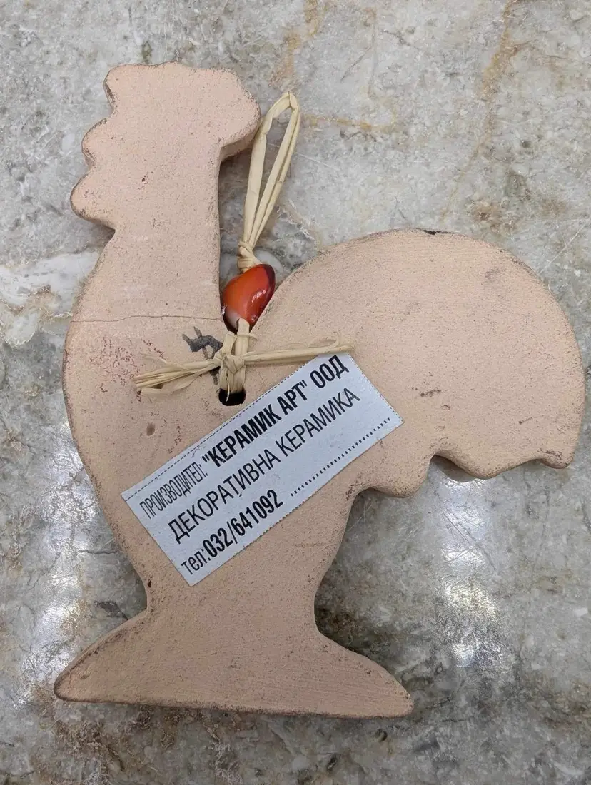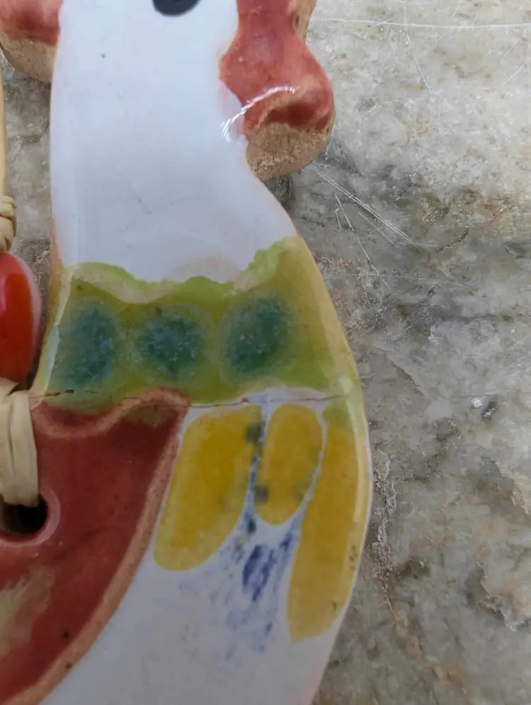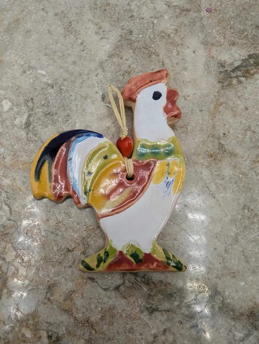 Add a touch of vintage charm to your kitchen with this rare and unique rooster ornament. Made in Bulgaria, this original piece is a must-have for any collector or lover of all things kitchen decor. Crafted from beautiful pottery ceramic, this ornament is sure to catch the eye of anyone who enters the room. Has a repair. See photos. Have to look very close to see it from front. Still strong and beautiful. Measures 3" X 2 1/2"