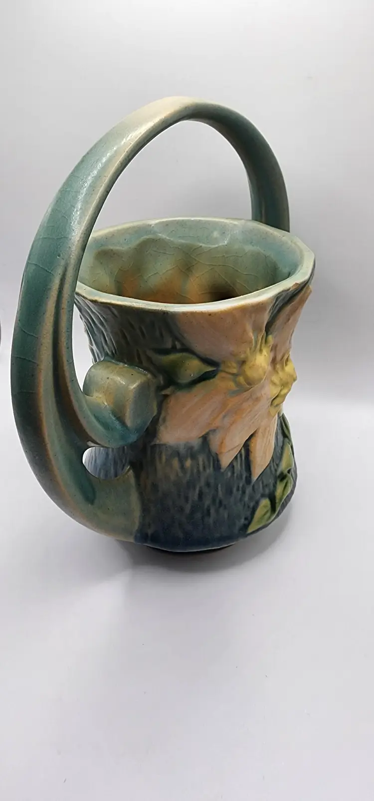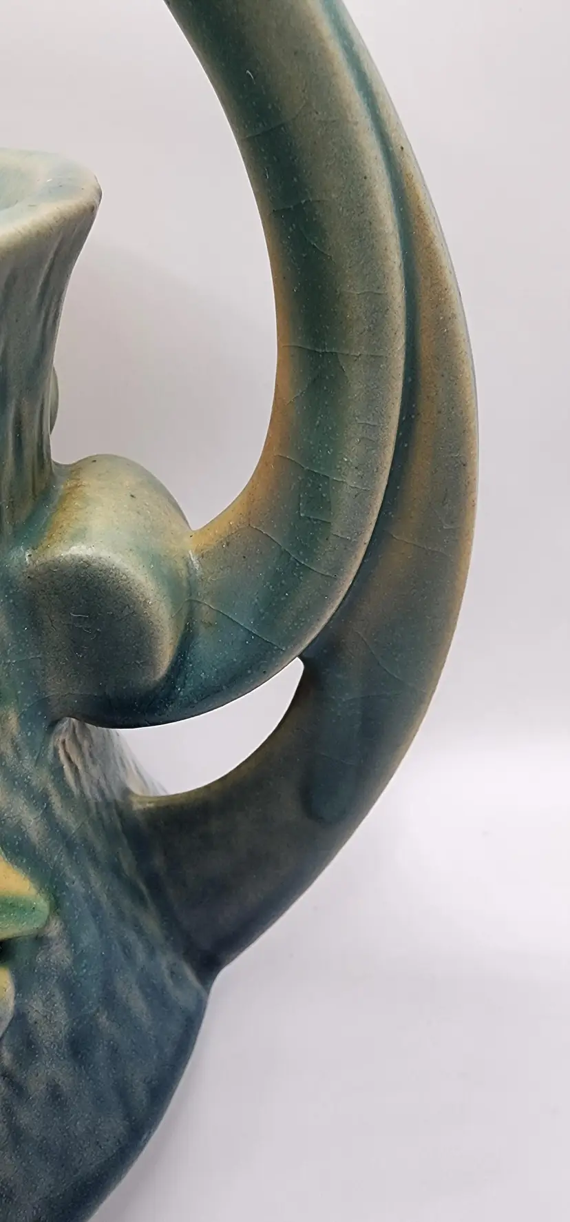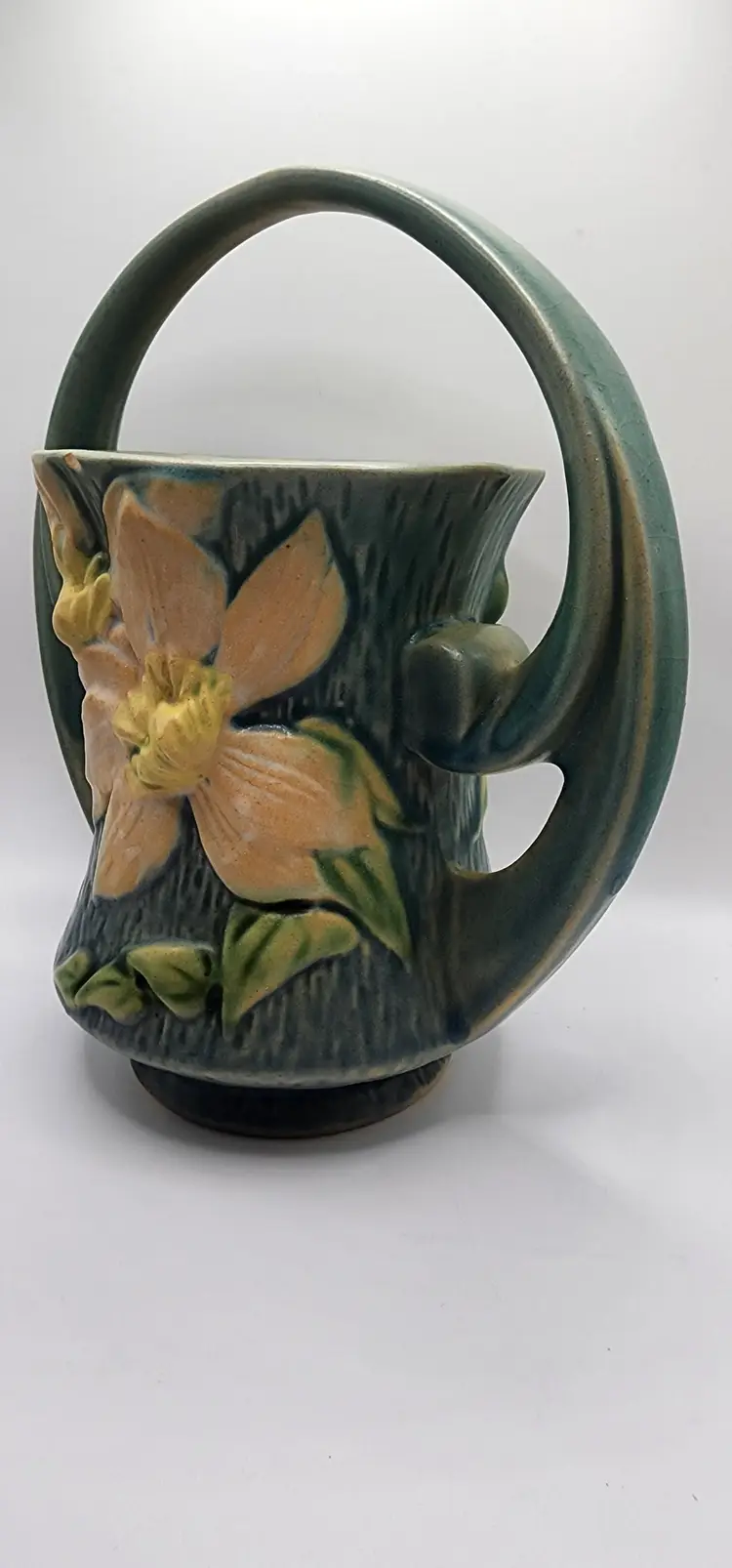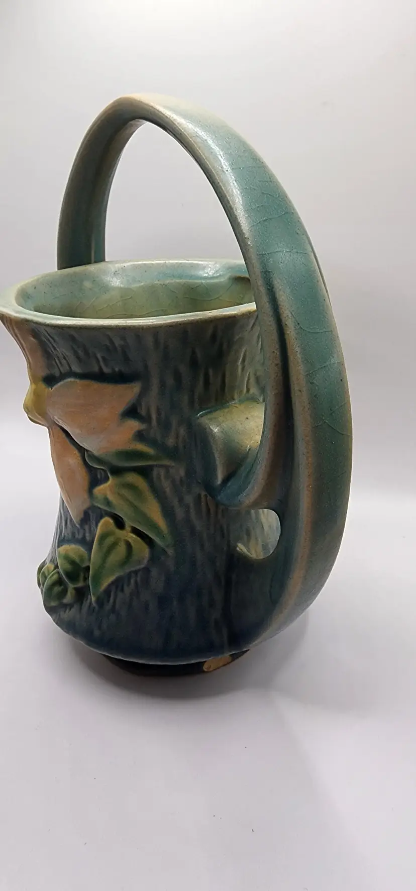 Roseville Clematis Green 1944 Vintage Art Deco Pottery Ceramic Basket 387-7. This is such a stunning piece of artwork. Its in beautiful condition except for a couple of chips :( There is some crazing in the glaze as well. Please see all pics. The price reflects the damage. Thanks so much!