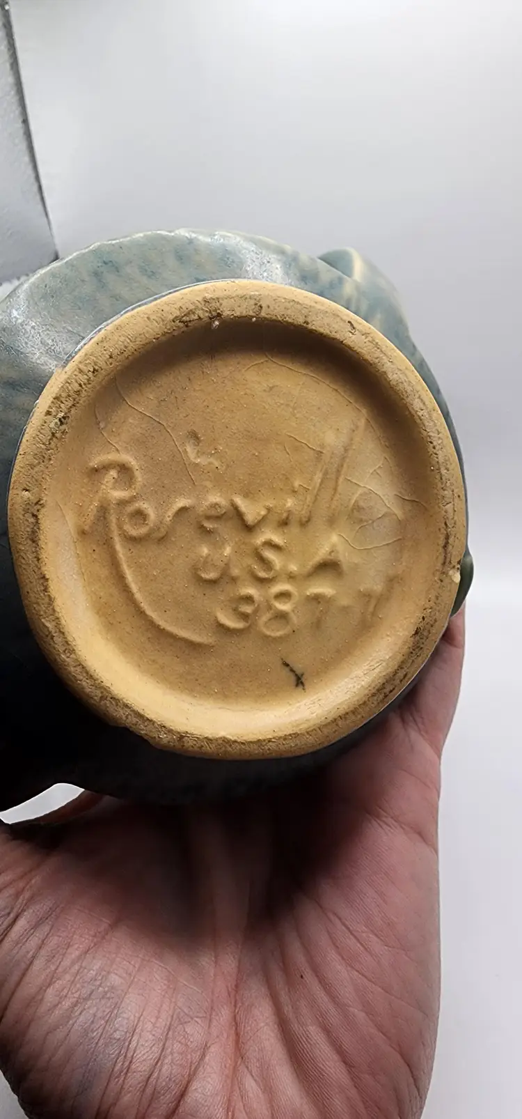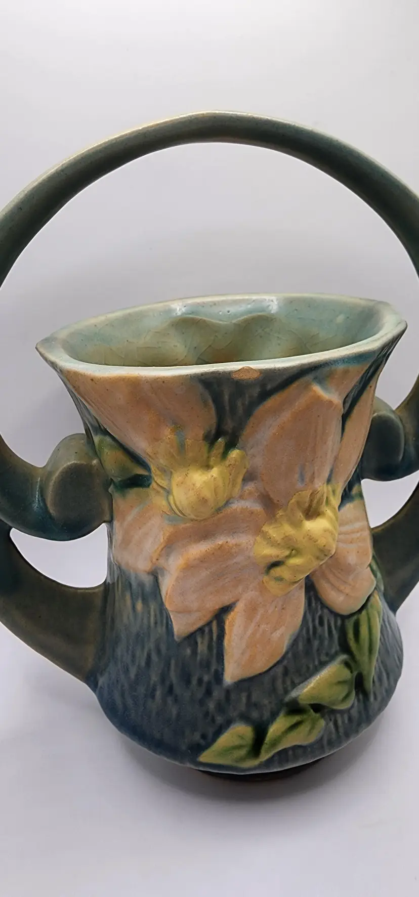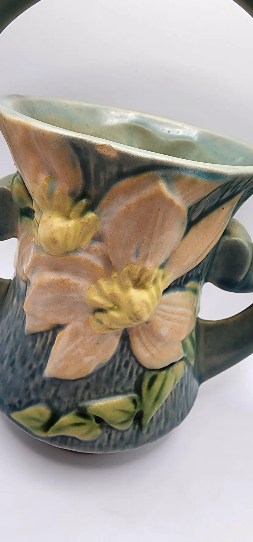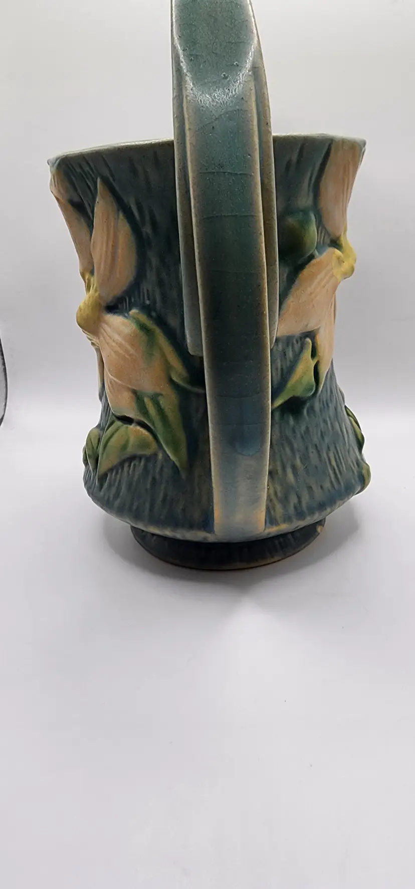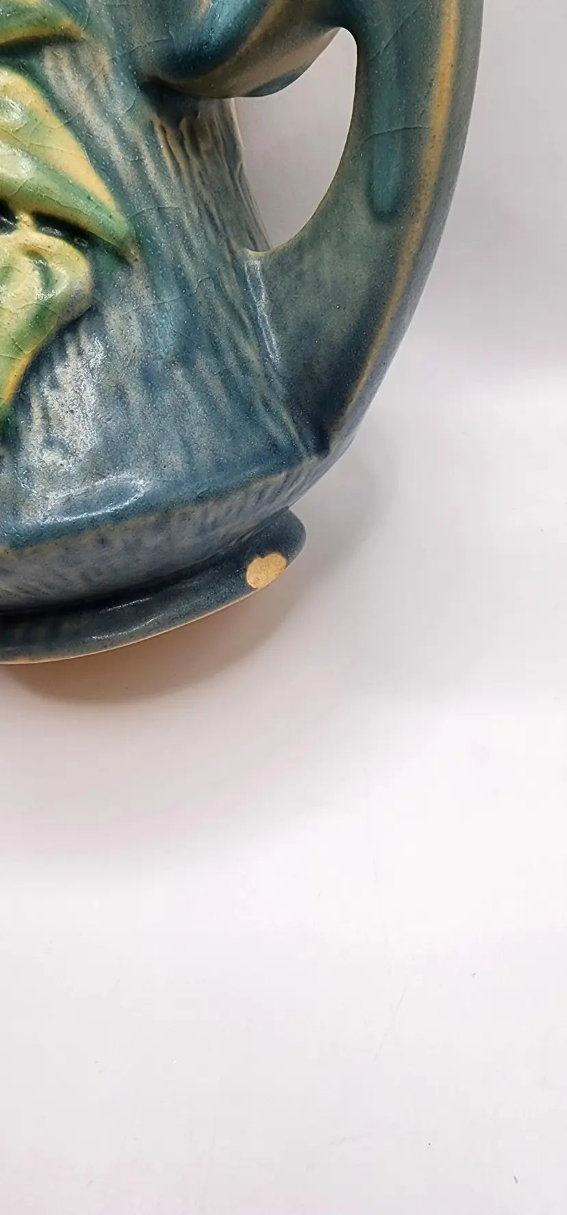 Roseville Clematis Green 1944 Vintage Art Deco Pottery Ceramic Basket 387-7. This is such a stunning piece of artwork. Its in beautiful condition except for a couple of chips :( There is some crazing in the glaze as well. Please see all pics. The price reflects the damage. Thanks so much!