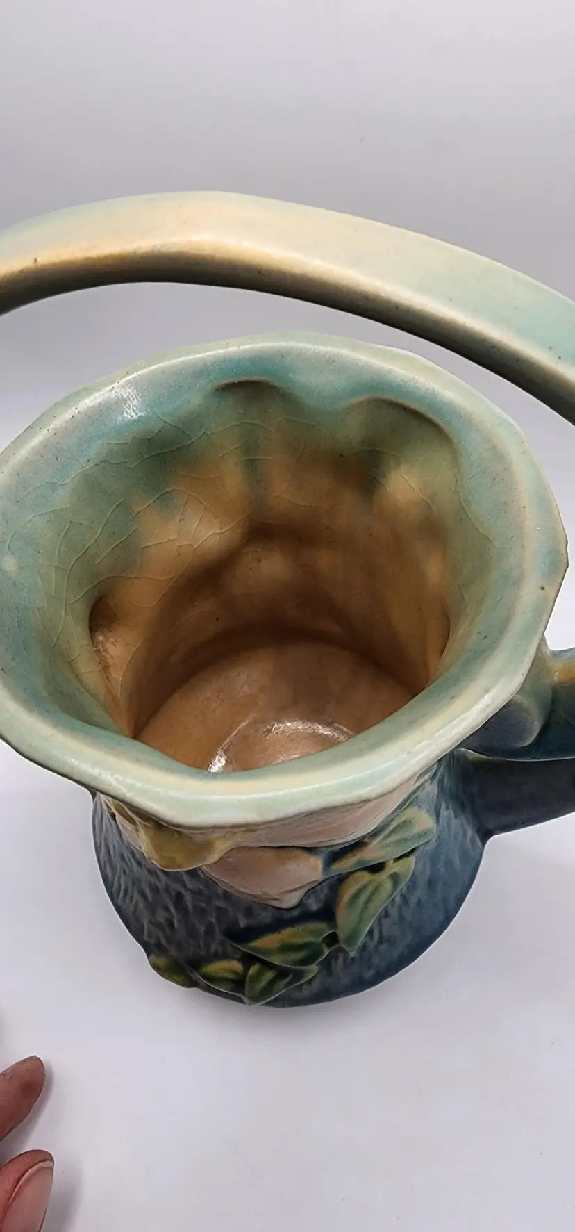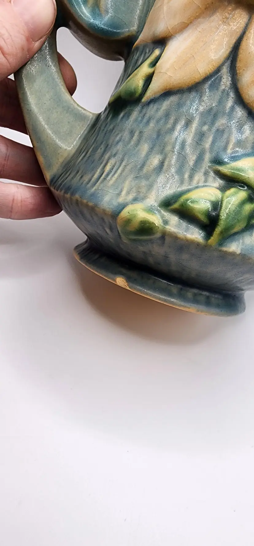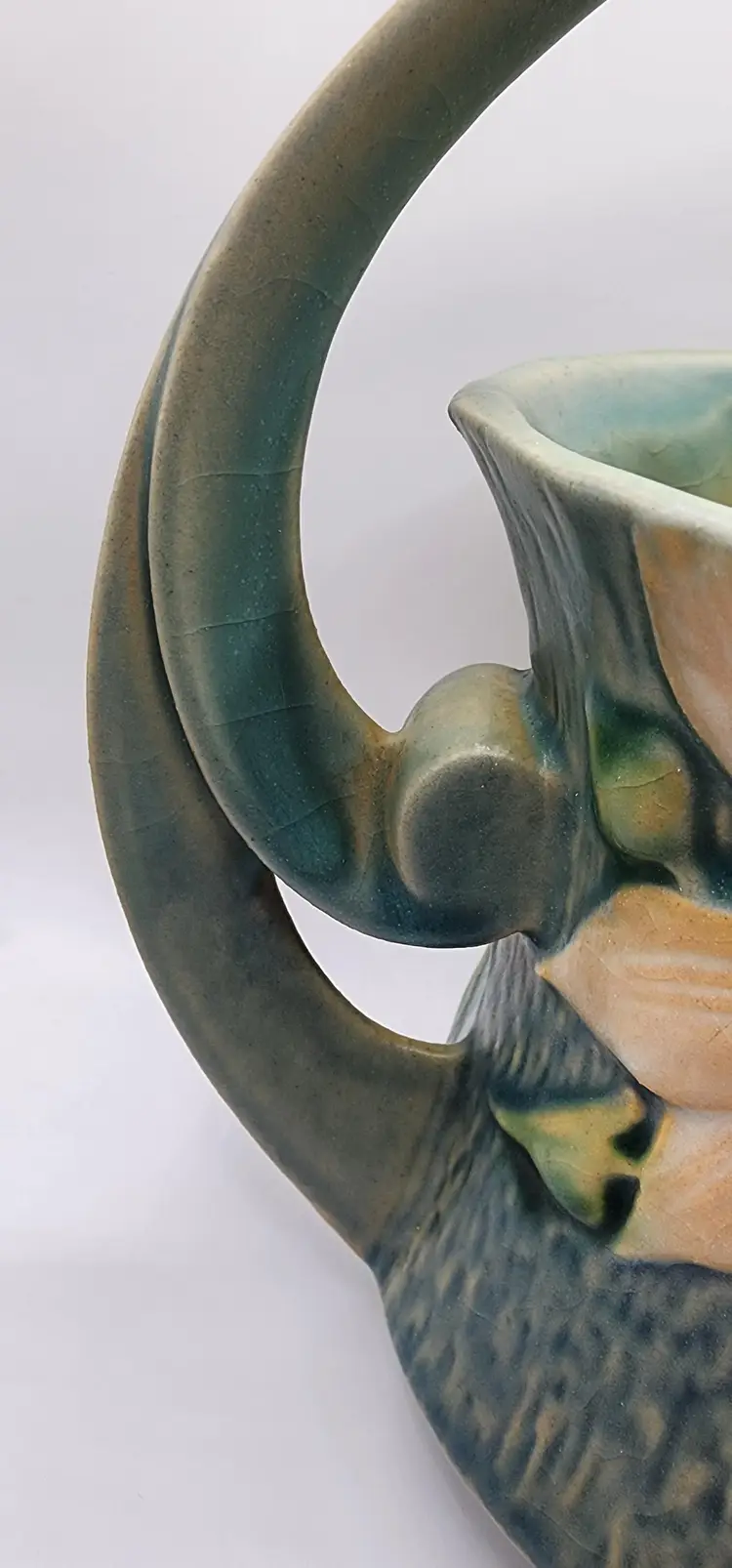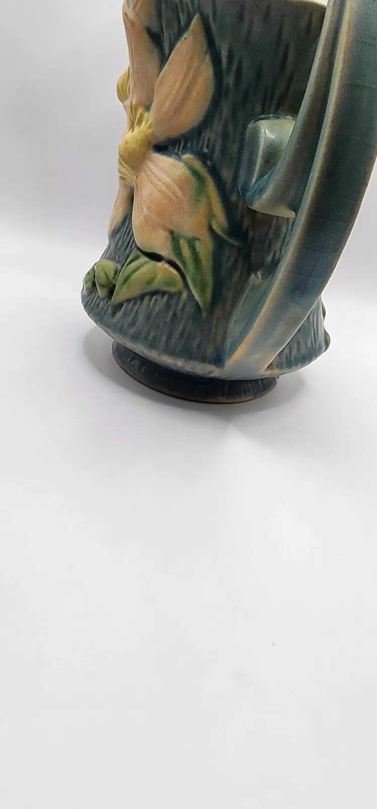 Roseville Clematis Green 1944 Vintage Art Deco Pottery Ceramic Basket 387-7. This is such a stunning piece of artwork. Its in beautiful condition except for a couple of chips :( There is some crazing in the glaze as well. Please see all pics. The price reflects the damage. Thanks so much!