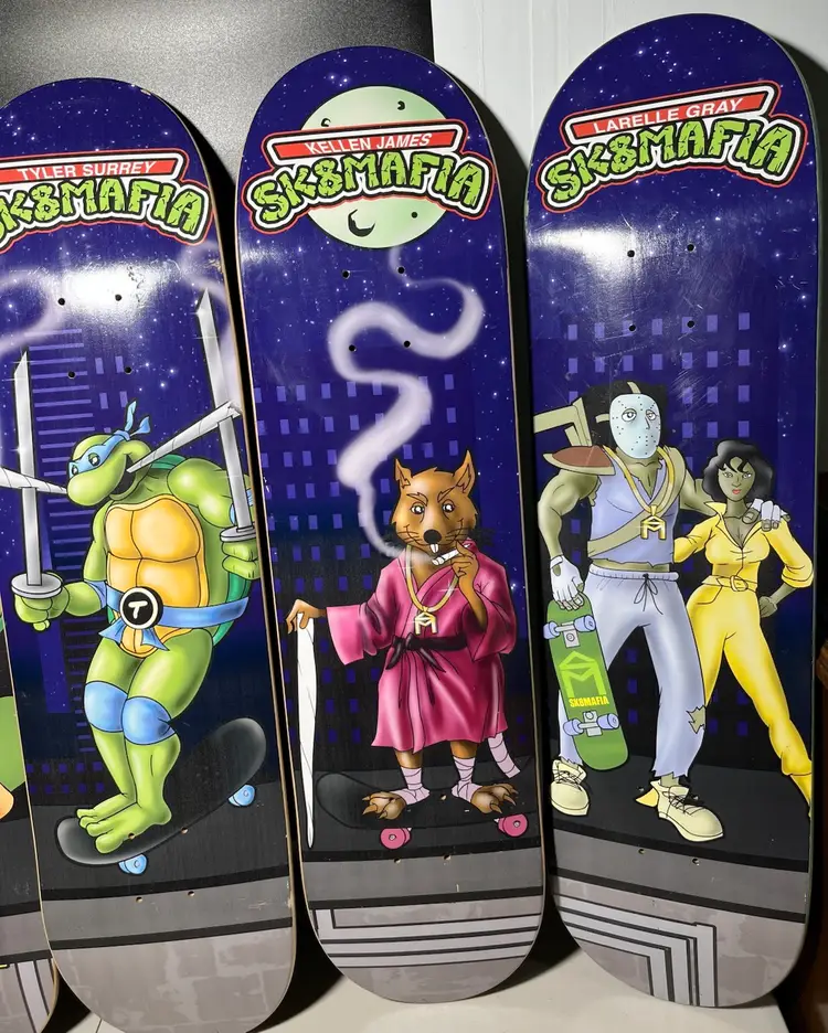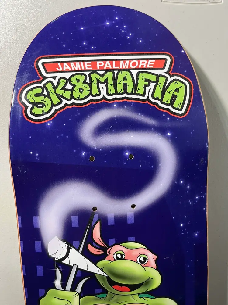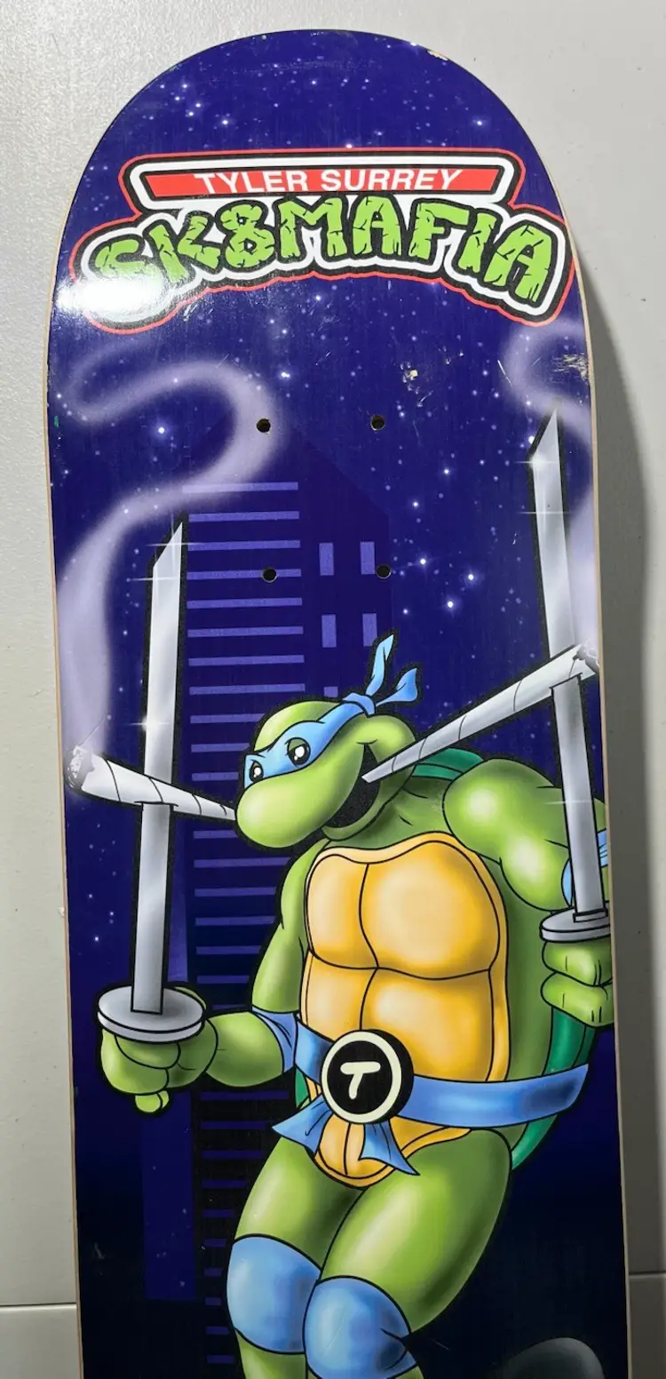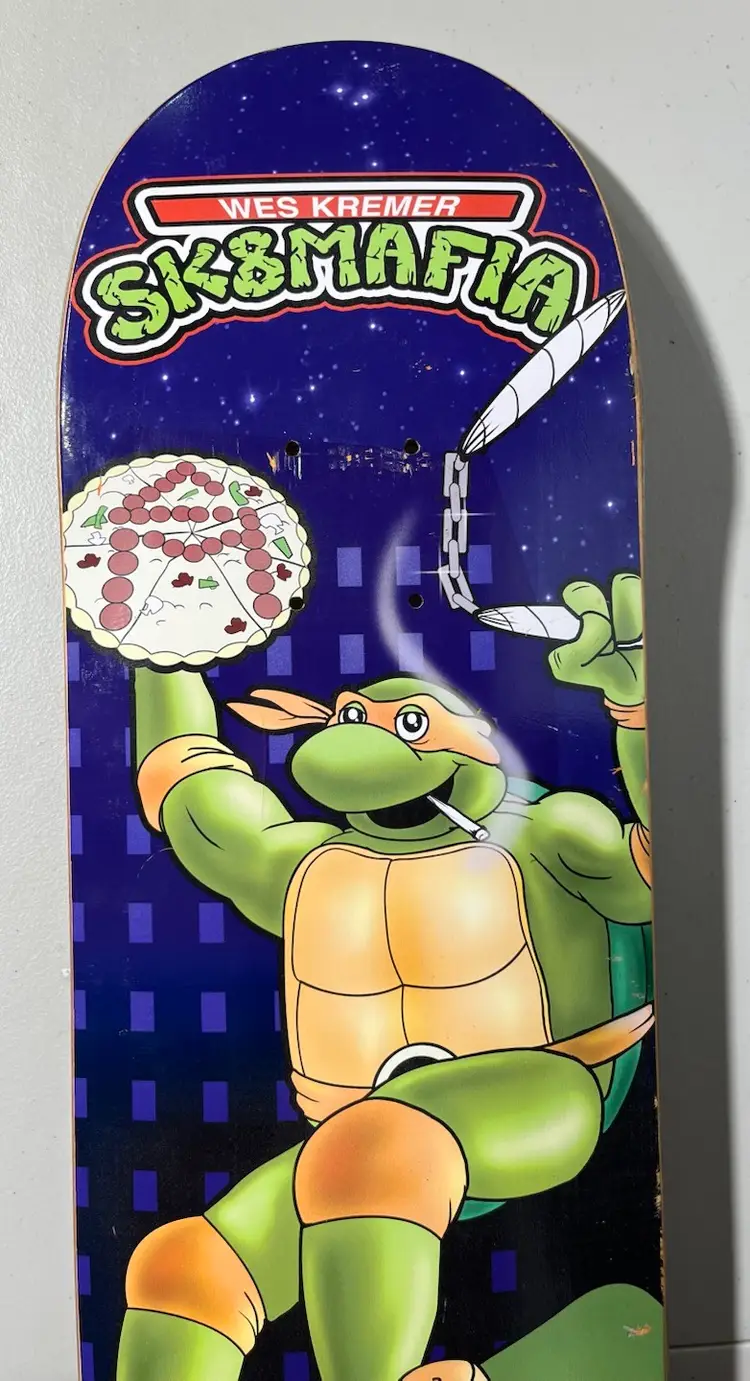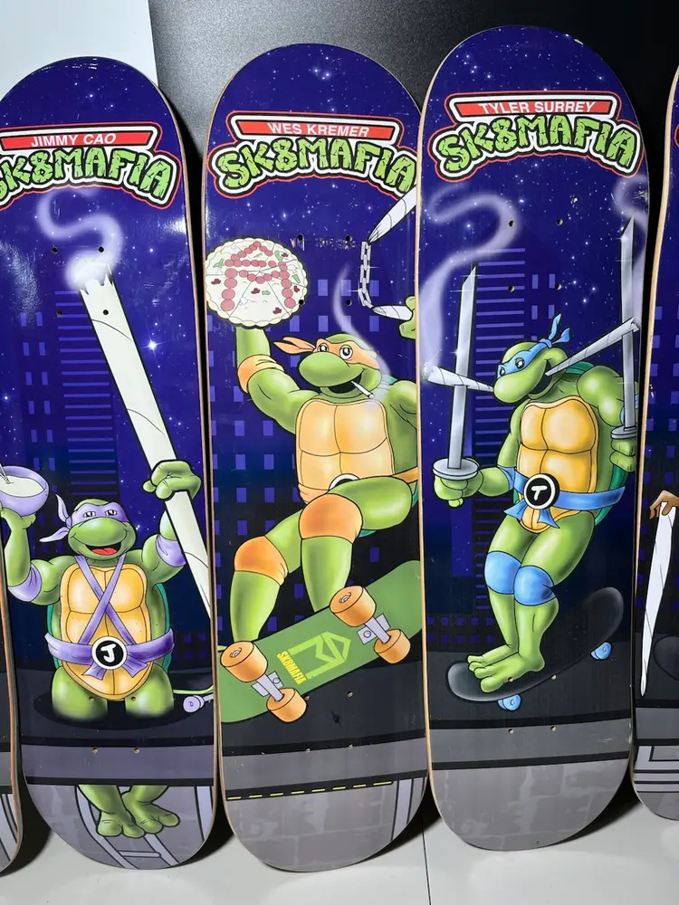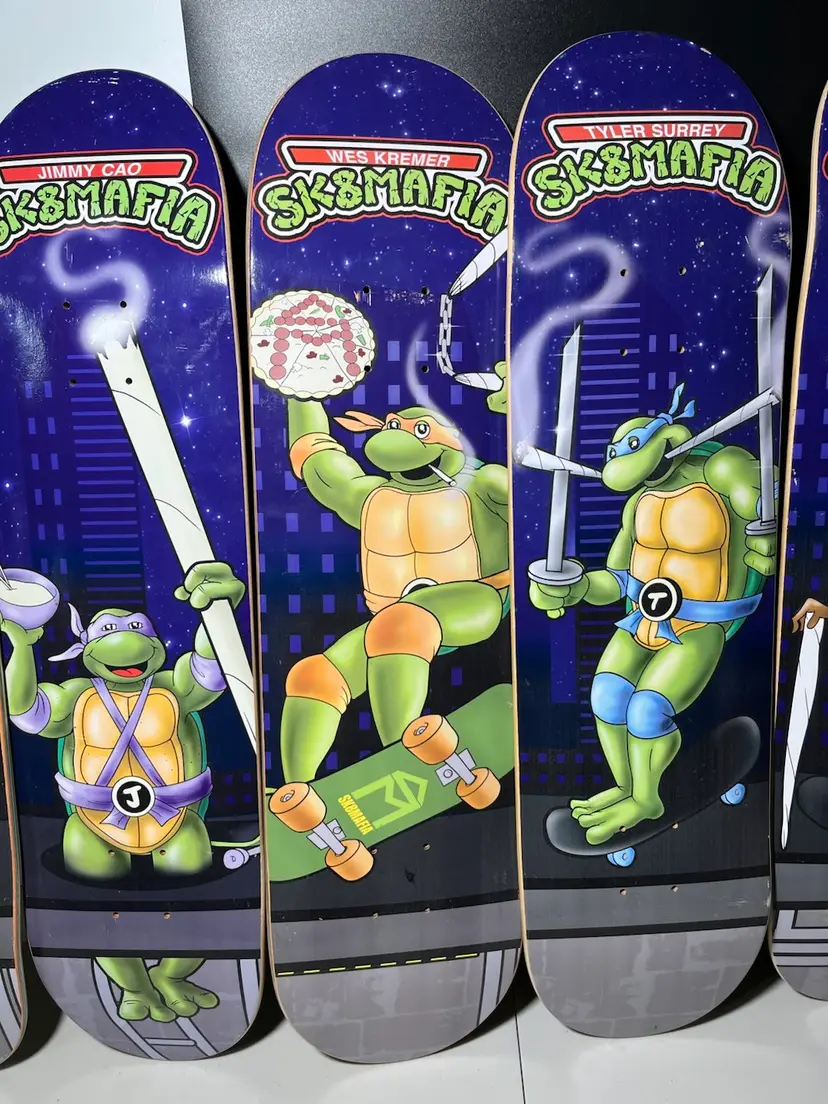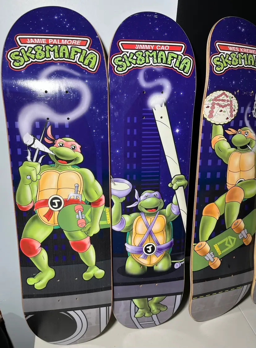 See all photos for condition. Set of six rare Sk8mafia ninja turtle skateboard decks. All are in used condition. Minor scratches, marks, paint, chipping, scuffs throughout on all boards. No major damage dents or dings. Decks only. Please ask for more photos if needed. Selling as a set.