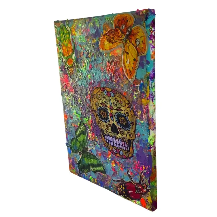 Technique: Drip and splatter painting, creating a layered effect with vibrant colors.