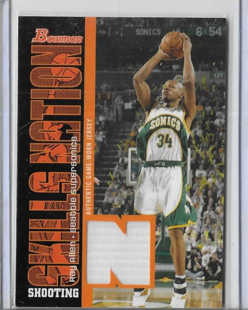 Add this Ray Allen Skills Nation card featuring an authentic game-worn jersey piece to your collection. A must-have for any Seattle Supersonics fan or basketball card enthusiast.