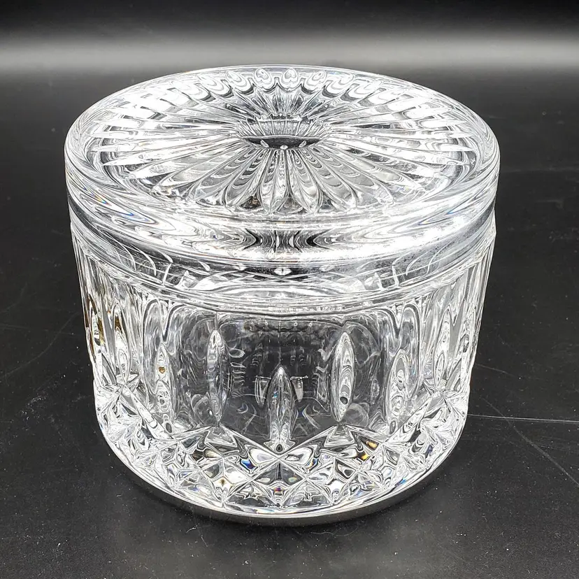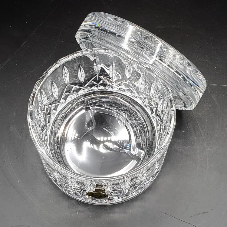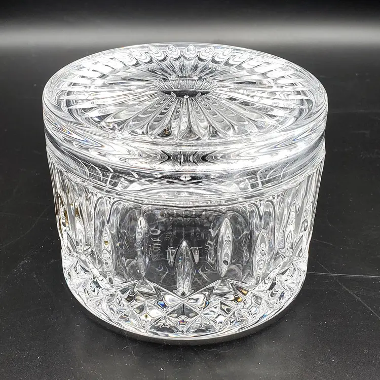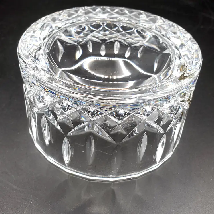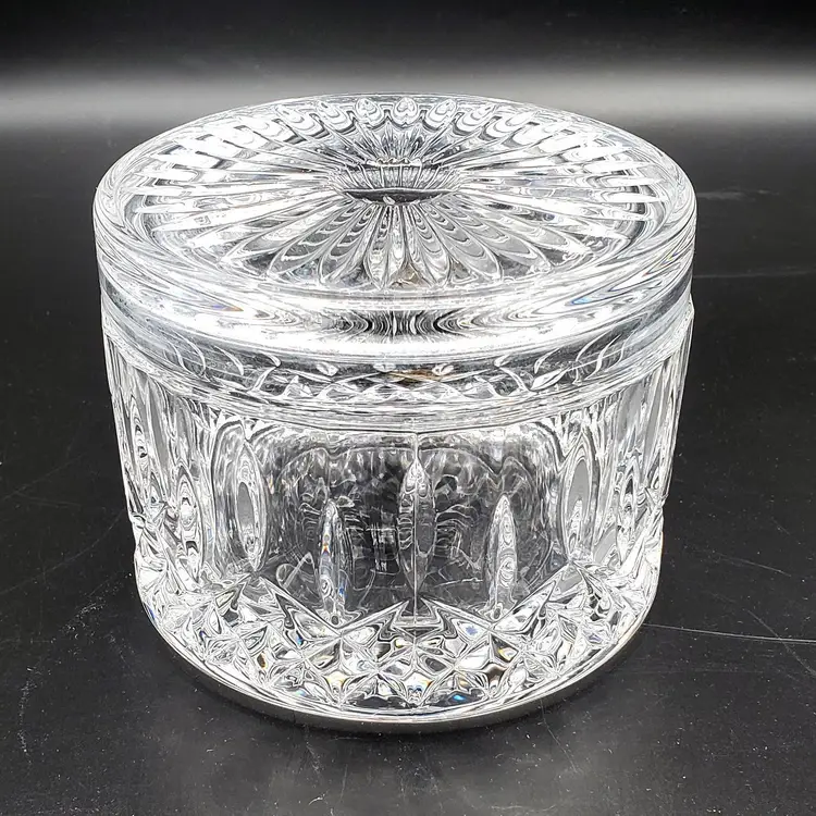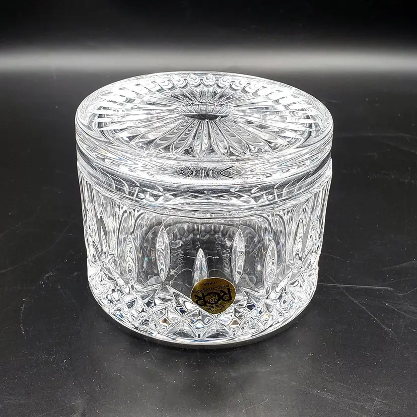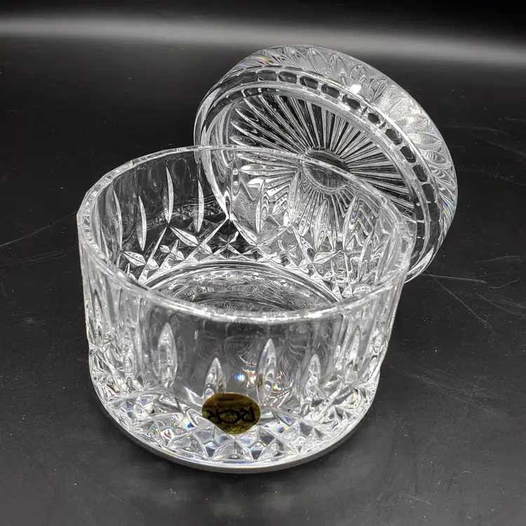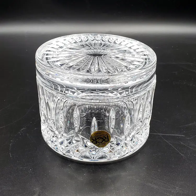 This beautiful Italian crystal trinket box features an intricate starburst pattern on the lid. It's 4" in diameter and 3" high. It's perfect for storing small treasures or as a decorative piece on your vanity. The box is in excellent condition with no chips or cracks. Thanks for looking!