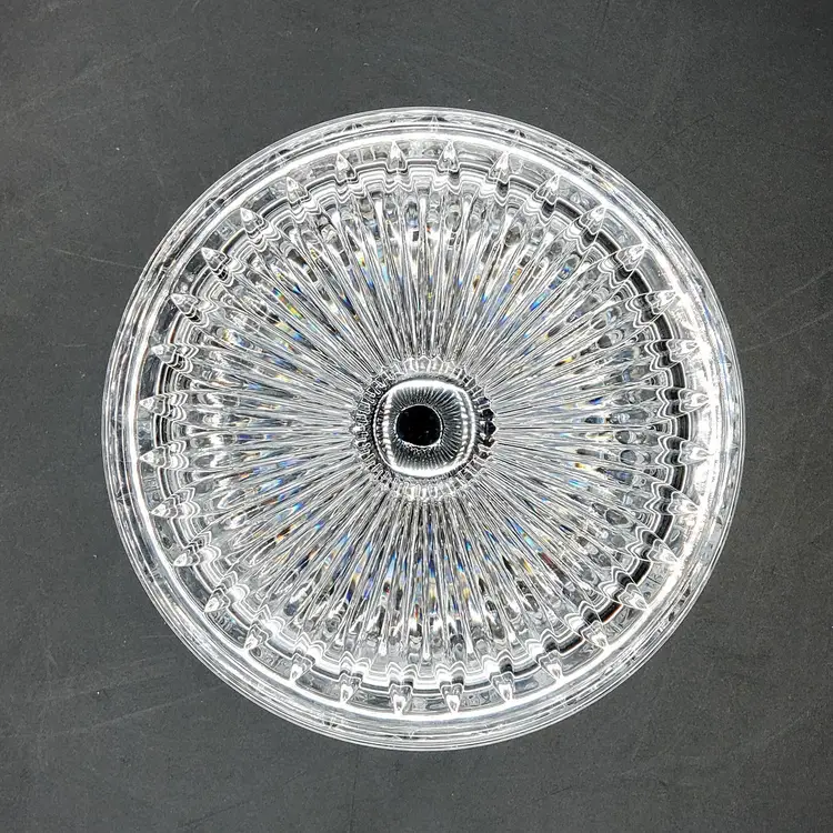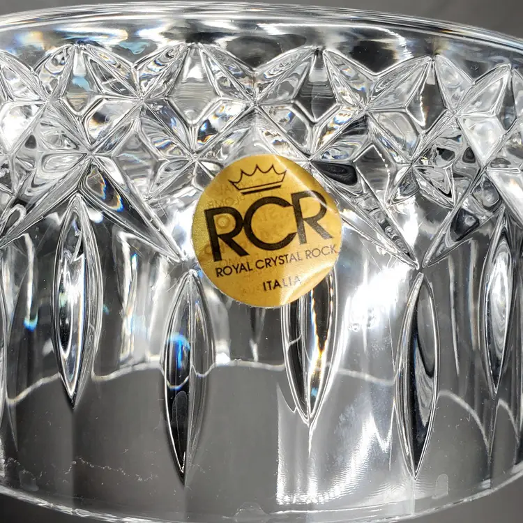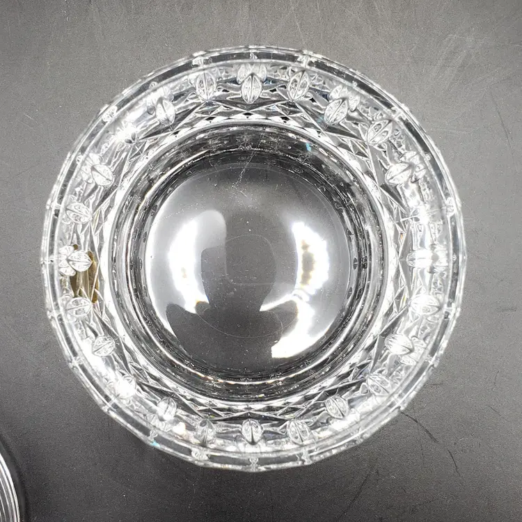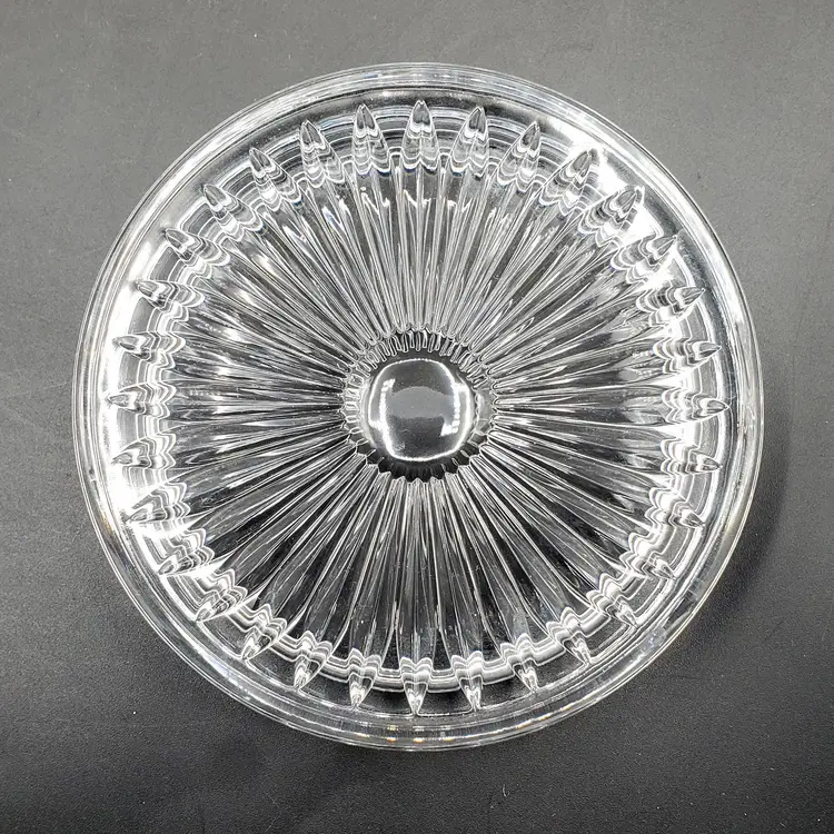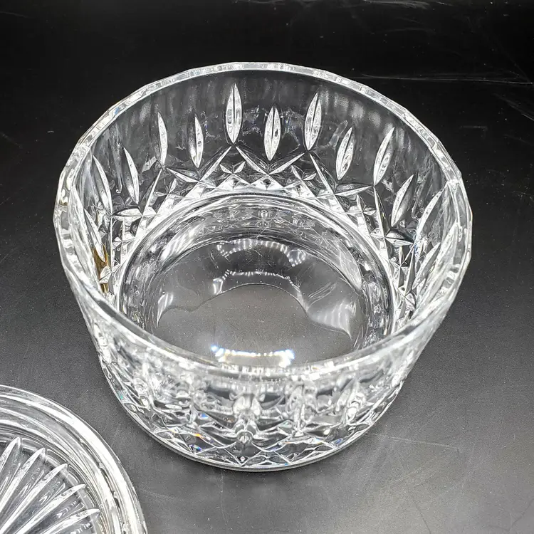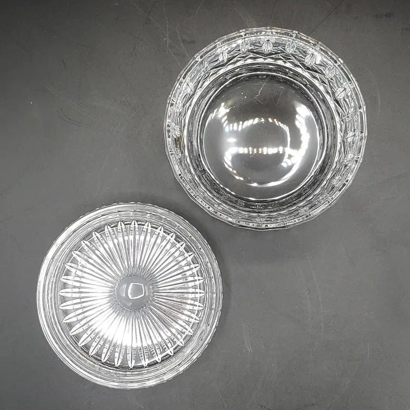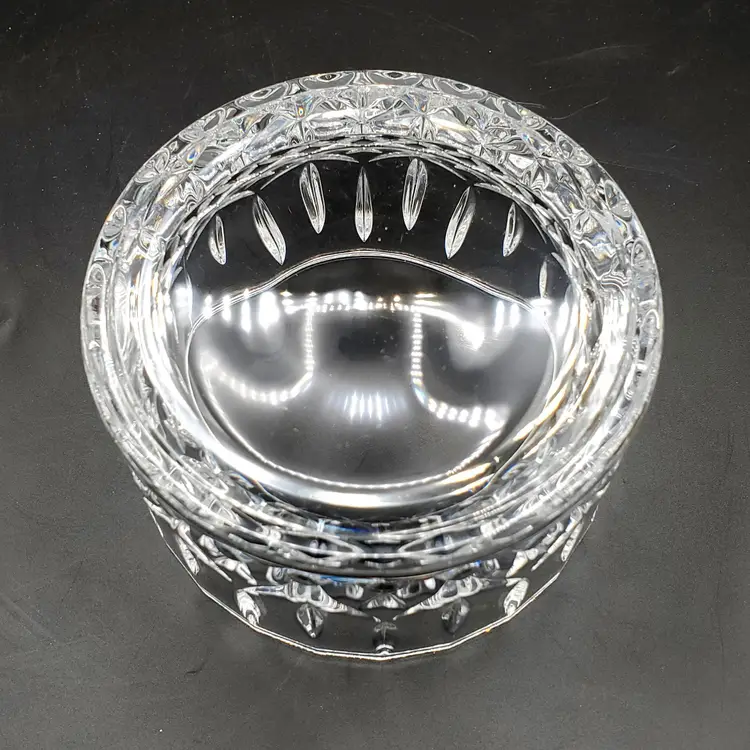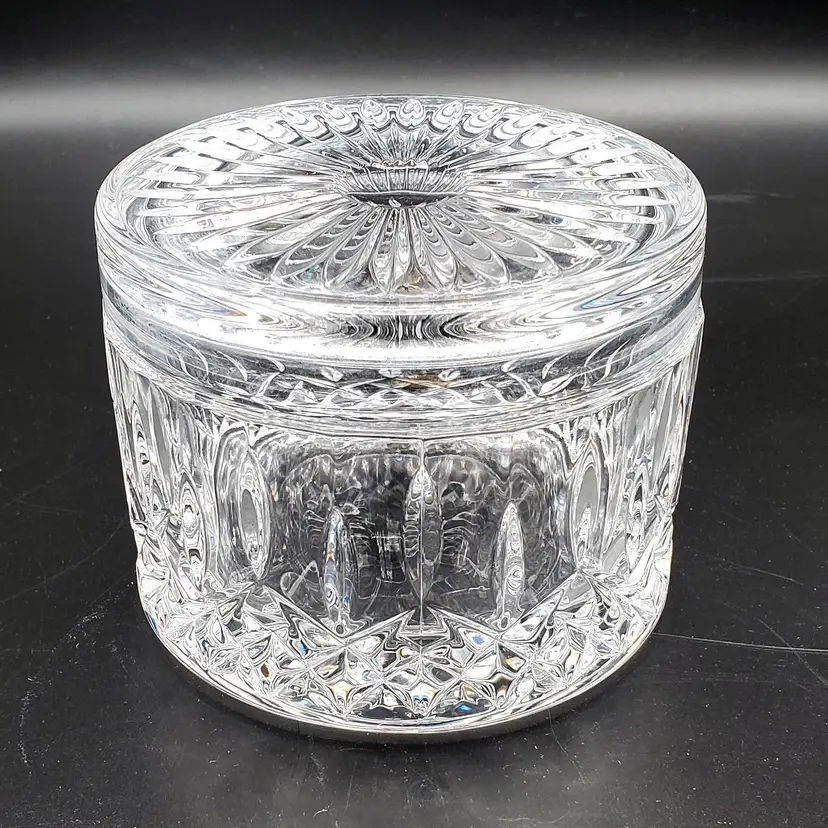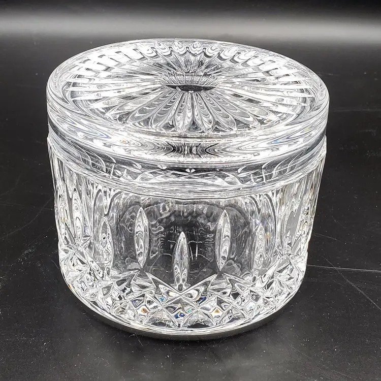 This beautiful Italian crystal trinket box features an intricate starburst pattern on the lid. It's 4" in diameter and 3" high. It's perfect for storing small treasures or as a decorative piece on your vanity. The box is in excellent condition with no chips or cracks. Thanks for looking!