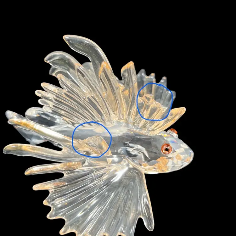 Approximately 2” x 2.75” x 2.75”. Please see last photo to see spots of broken fin within the blue circles.