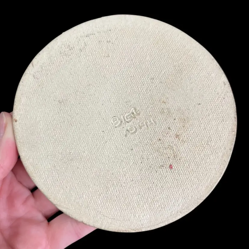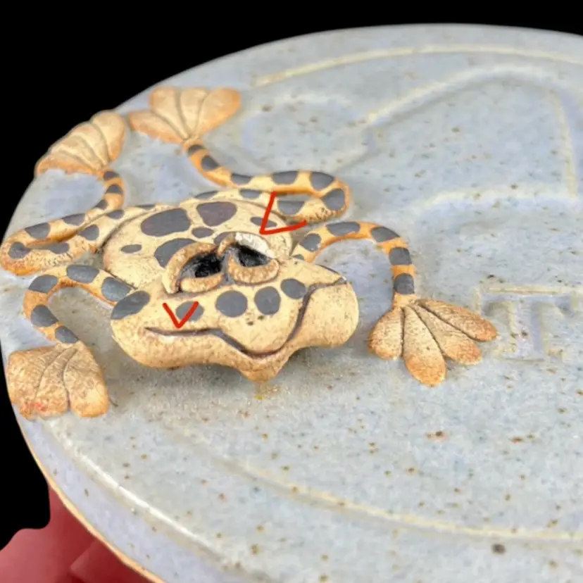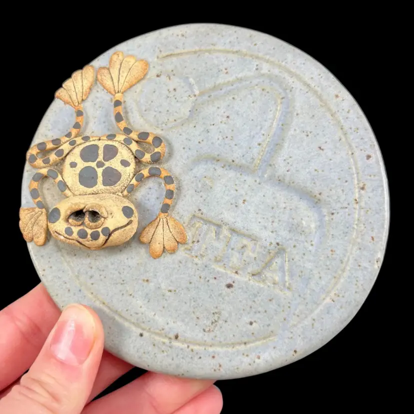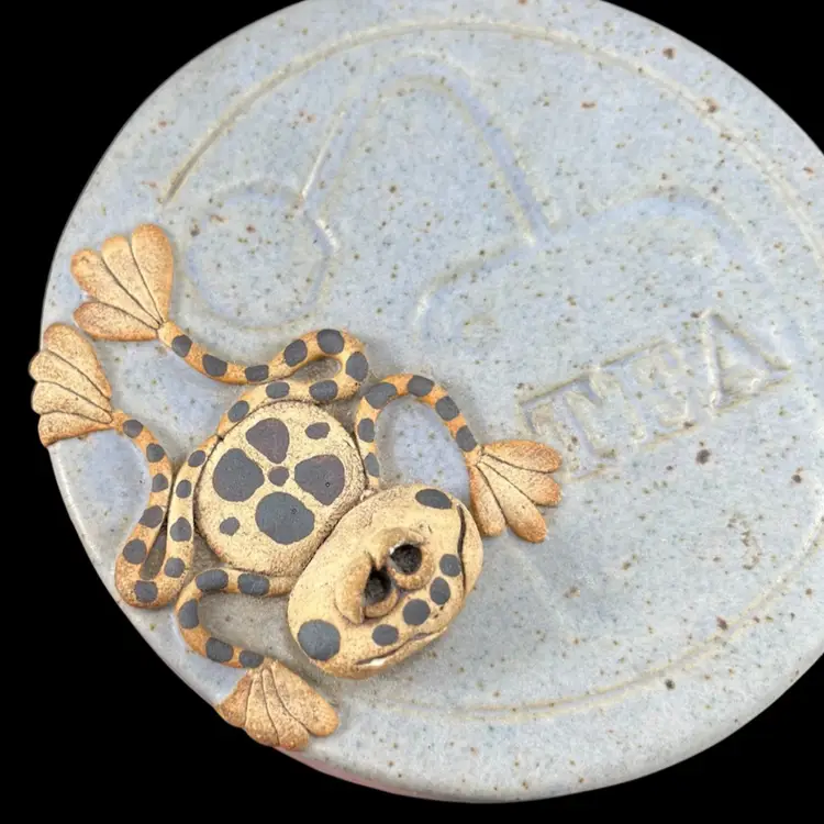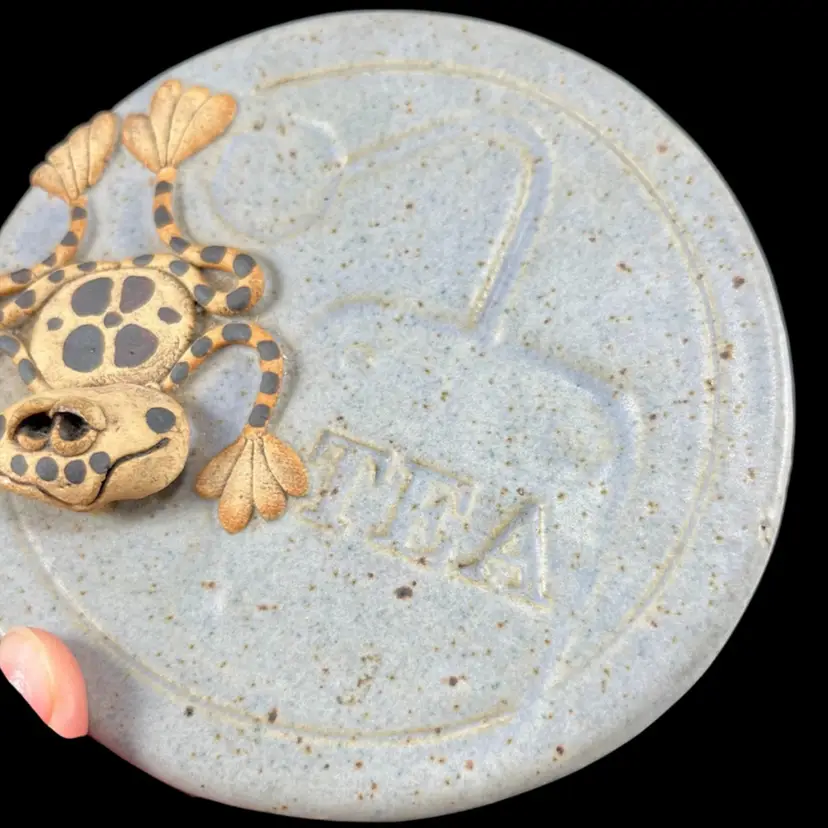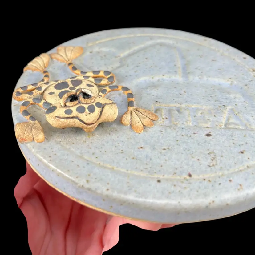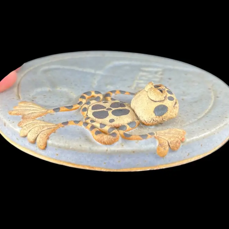 Approximately 4.5” in diameter and 1” tall. Two chips on frog, one above the eye and one on the mouth. Please see last photo.