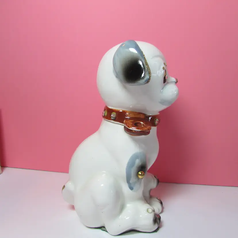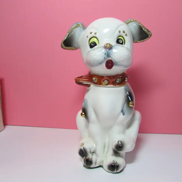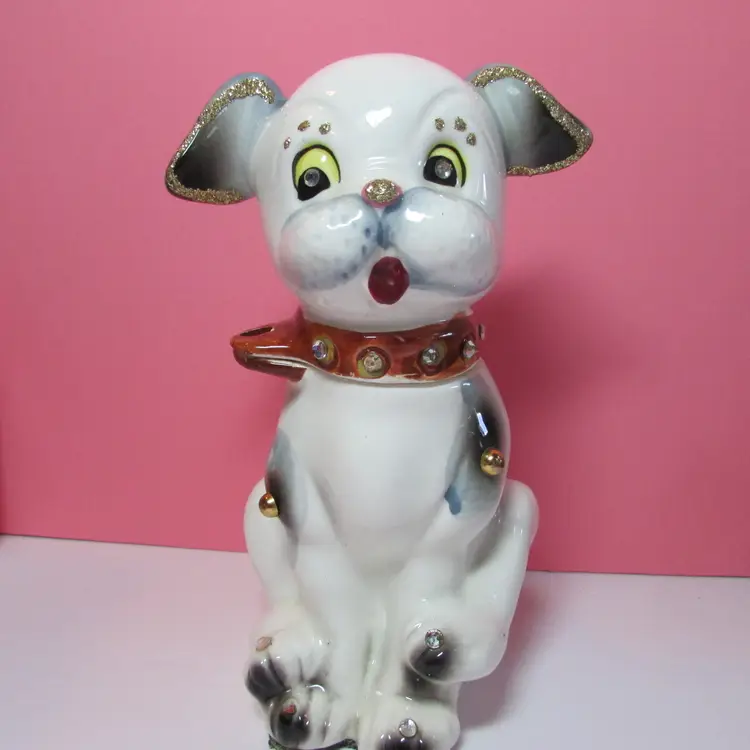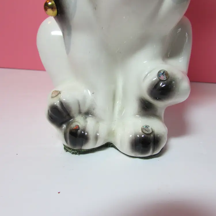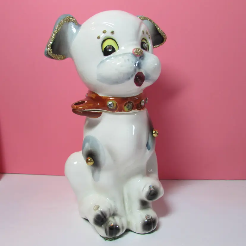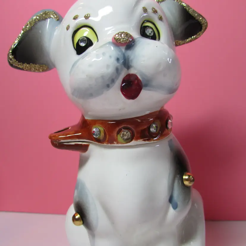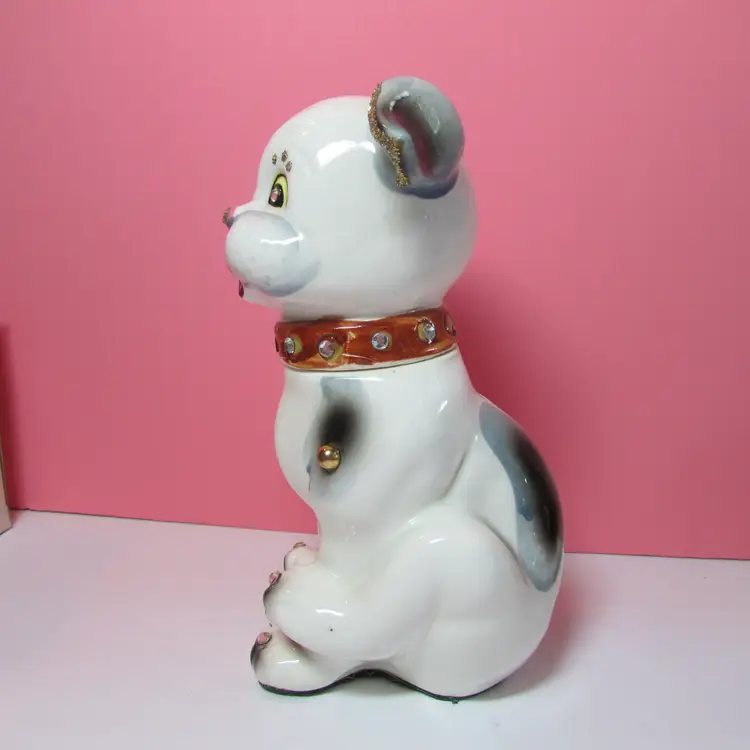 This adorable bank has some wear, there is some rhinestones missing and the collar lock part has been repaired on the bottom piece. It is not very noticeable, but I would not put a little lock on it. He is still an adorable piece to display, he is about 7 1/2" tall. This is shipped from a smoke free home. Thanks for looking!