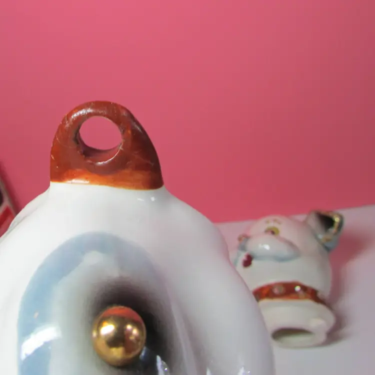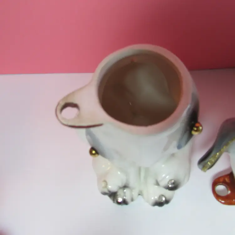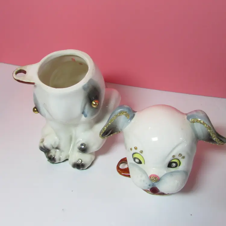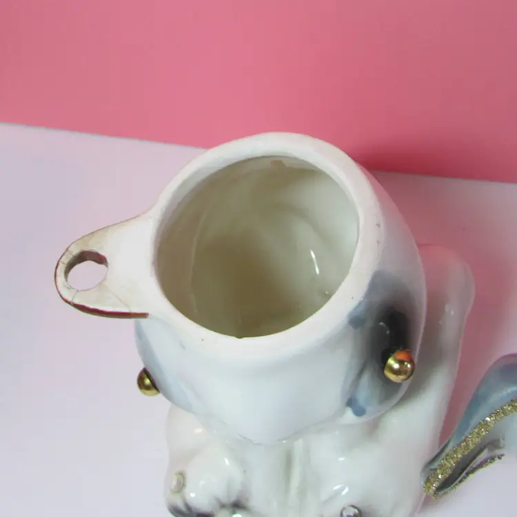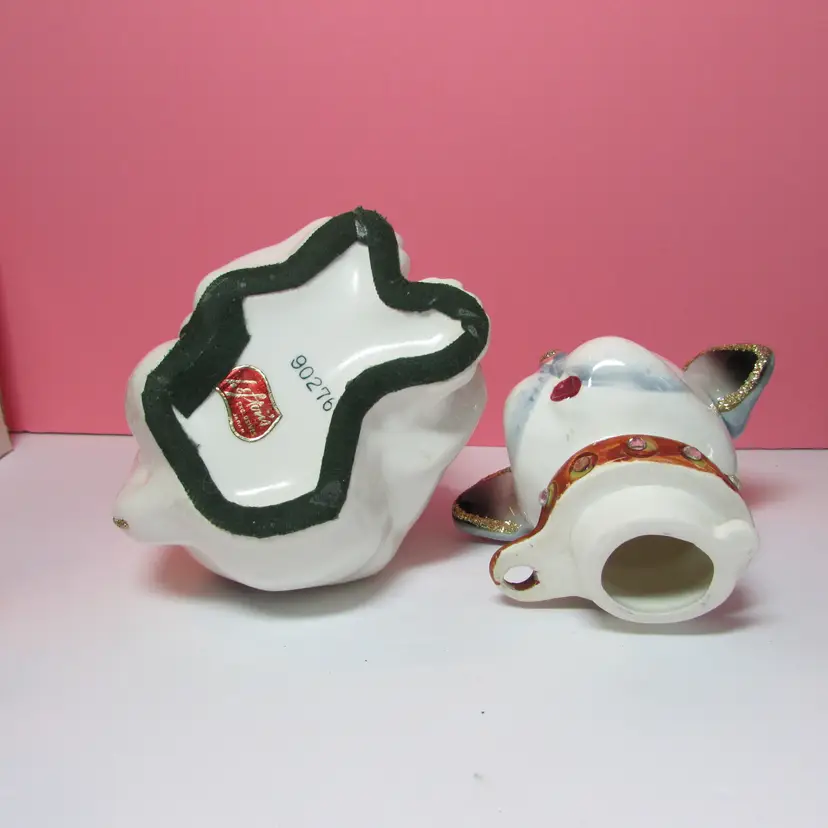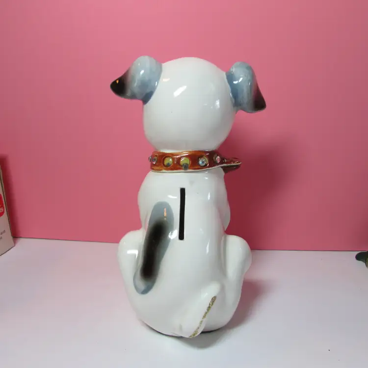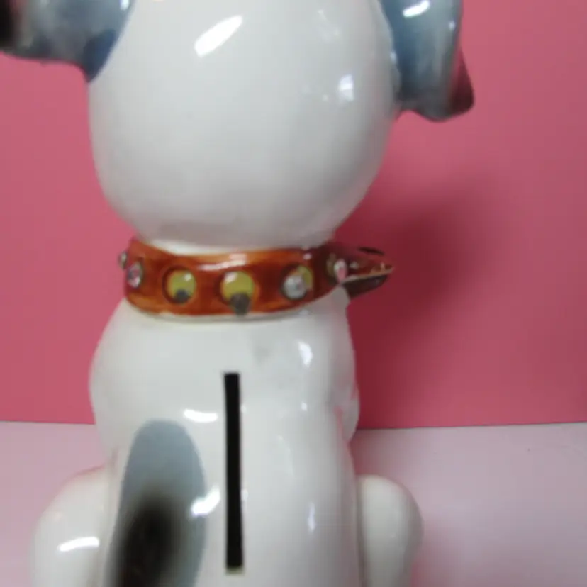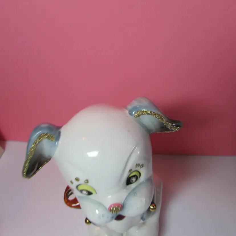 This adorable bank has some wear, there is some rhinestones missing and the collar lock part has been repaired on the bottom piece. It is not very noticeable, but I would not put a little lock on it. He is still an adorable piece to display, he is about 7 1/2" tall. This is shipped from a smoke free home. Thanks for looking!