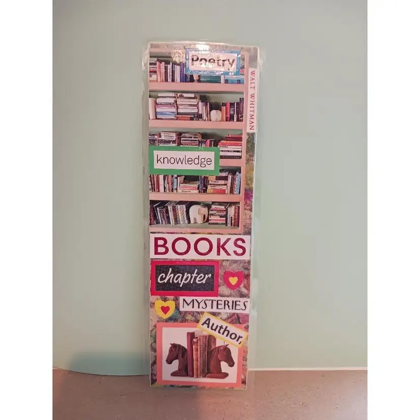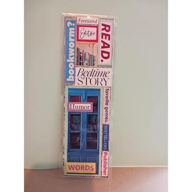 I create bookmarks and vision boards from words and pictures cut out of magazines. Some of the magazines date back to the 1940s! It is my goal to use only recycled found materials, and not buy anything. Occasionally I can't find a word, like NikNax, and have to cheat and type it and print it out.