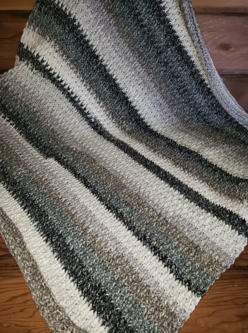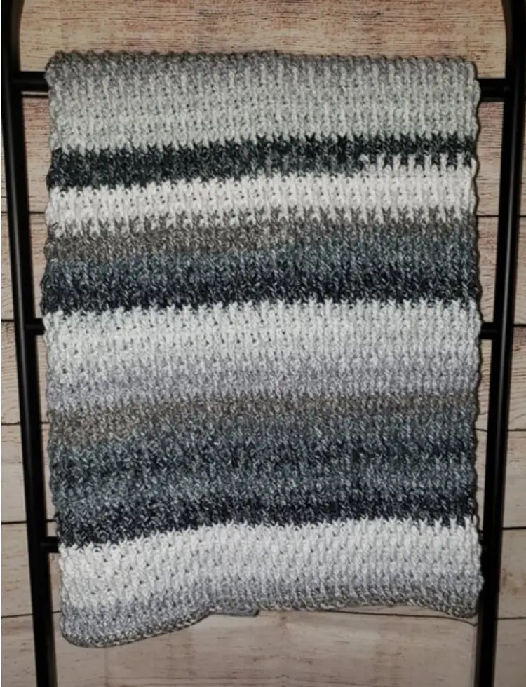 Beautiful blanket with a tight roll of stitches on one side and flat on the backside in a beautiful ombre of black and gray.