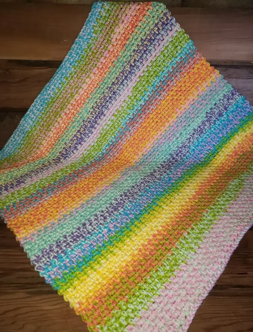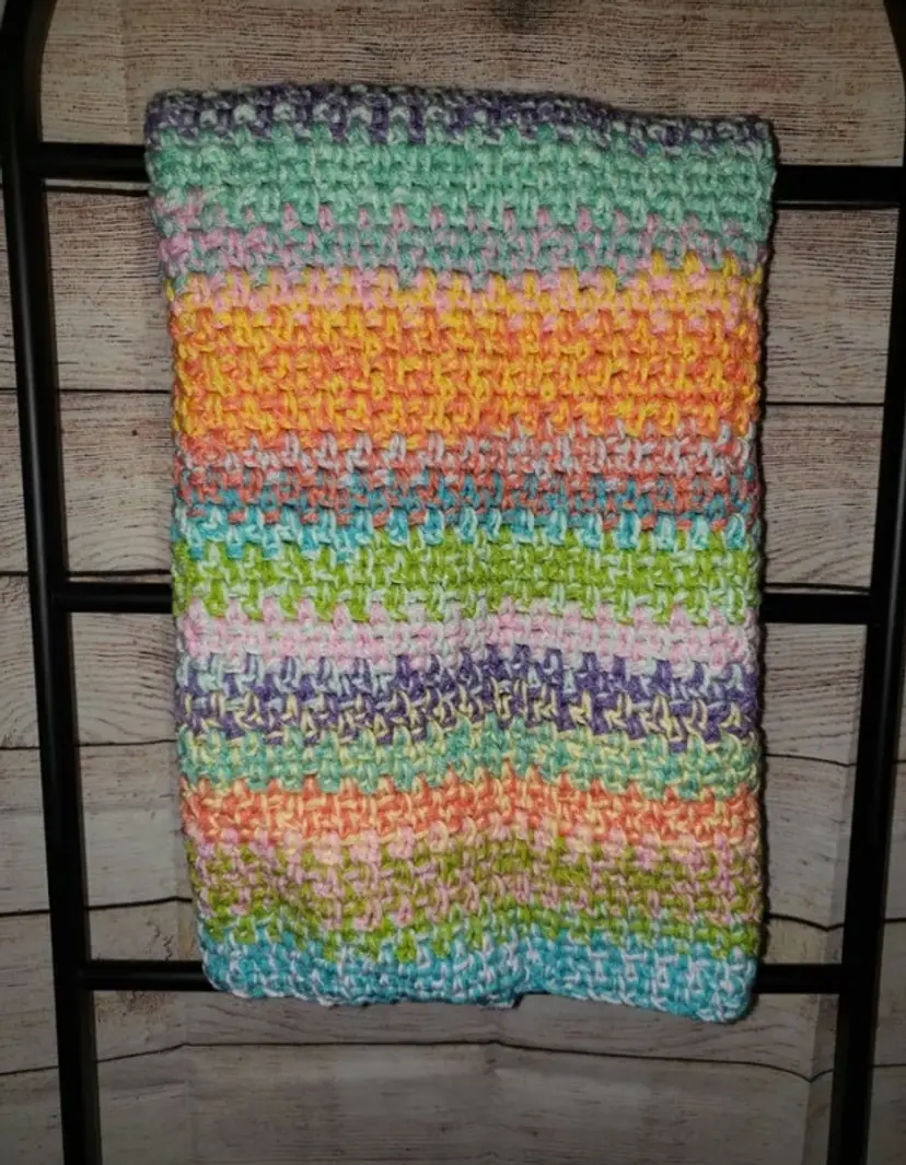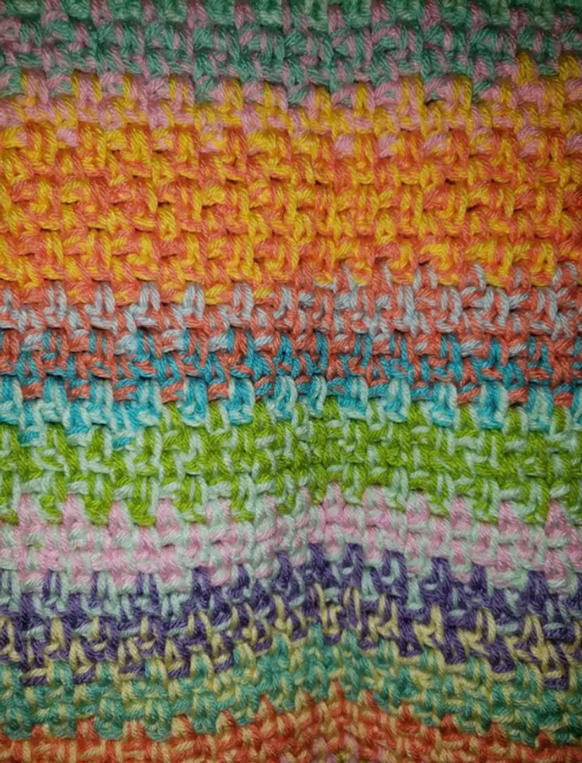 Beautiful blanket made holding 2 strands of yarn together. I randomly picked up yarn as each color ended. I really love how this one came out. I only make them when I have extra time and no two are alike. Once its gone, there won't be another with the same colors.
