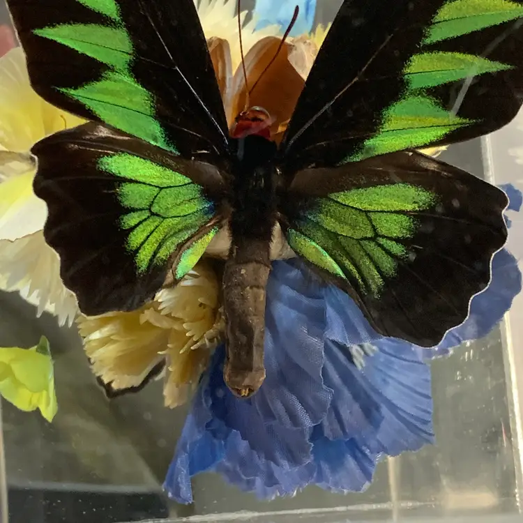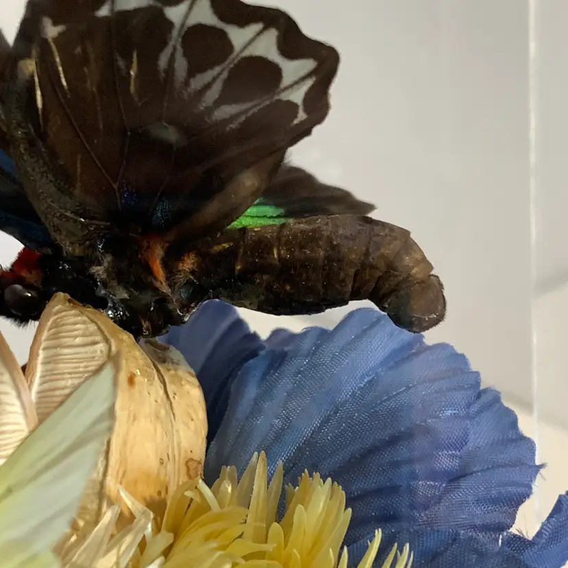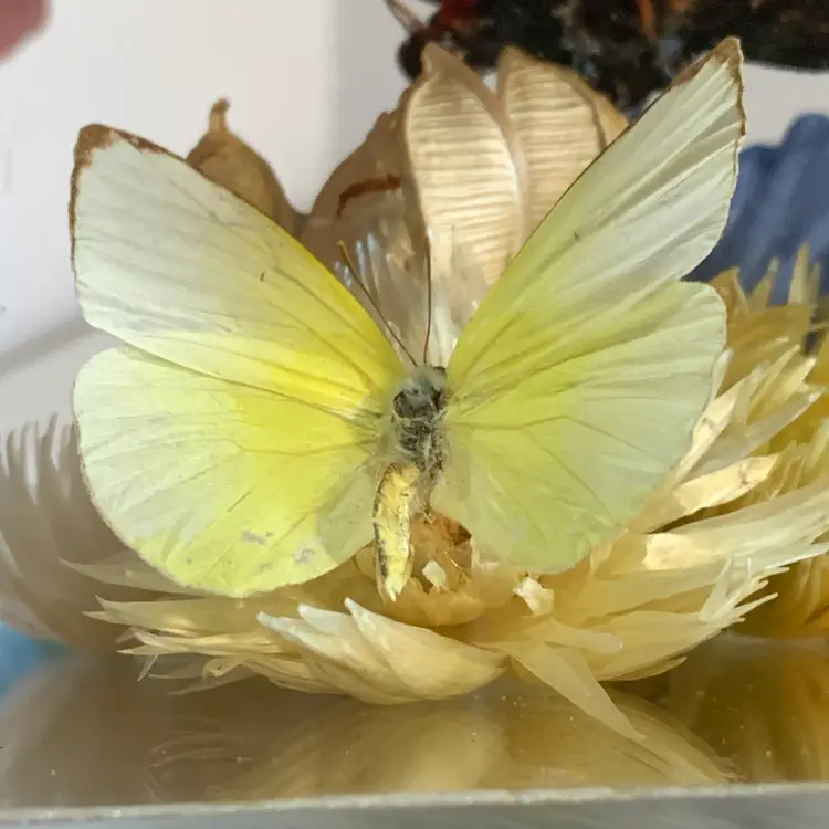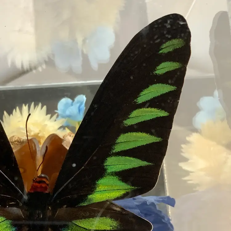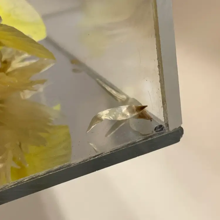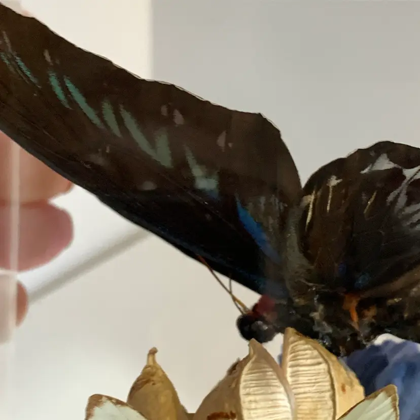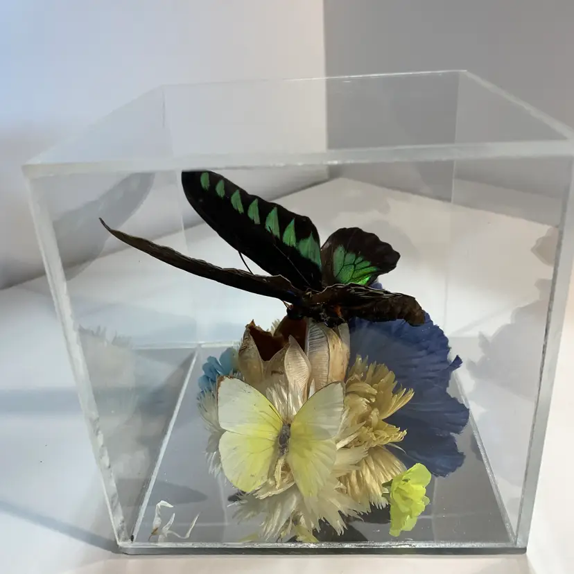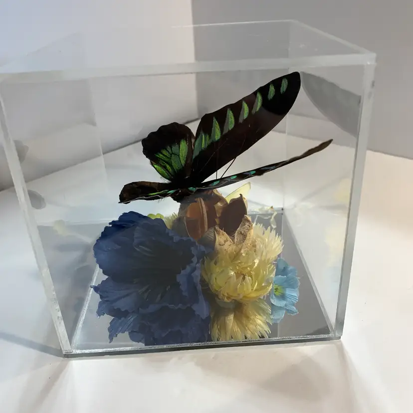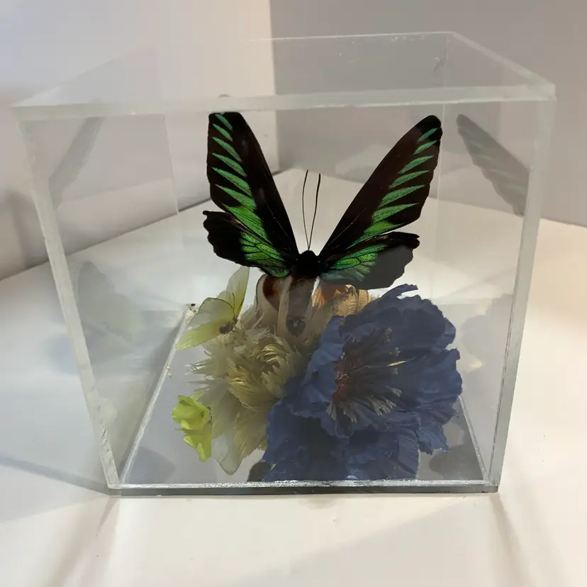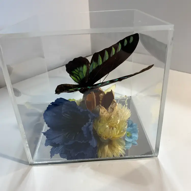 The butterflies are real. The cube is made out of acrylic. There is a mark in one corner that I have included a photo of. A small amount of the dried flowers have come loose. The cube measures 4 3/4 inches square. I do not guarantee that this will stay together in the mail but It will be packaged with a lot of bubble wrap and packing paper. Weighs 11 ounces. If the actual postage ends up being less than what you paid, you will be refunded for anything over one dollar.