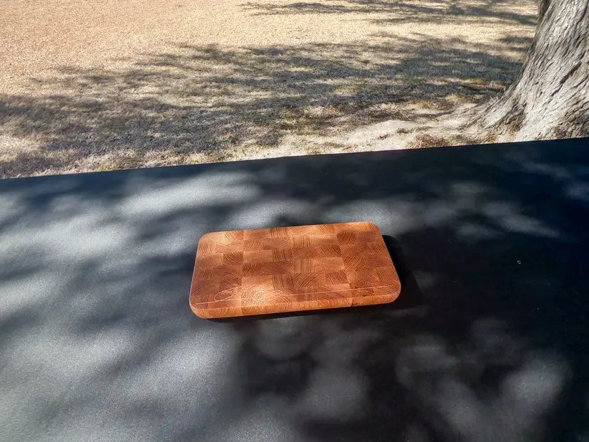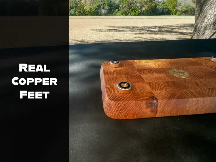 The Build The Wood: Locally sourced White Oak, chosen for its durability and classic grain. The Inlay: Genuine copper-leaf, meticulously sealed for safe, everyday food contact. The Hardware: 0.75" copper feet for a coordinated look and a stable, "pro" feel. The Surface: 100% end-grain orientation—the gold standard for knife edge retention. The Finish: Deep-saturated in a mineral oil bath and finished with a hand-applied food-safe wax.