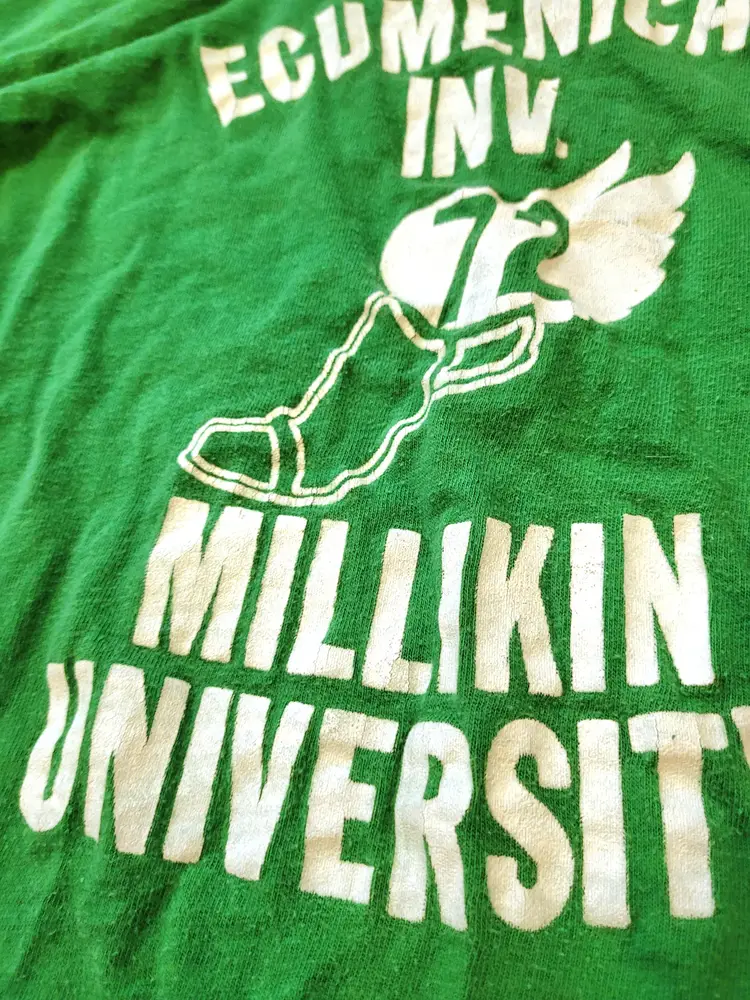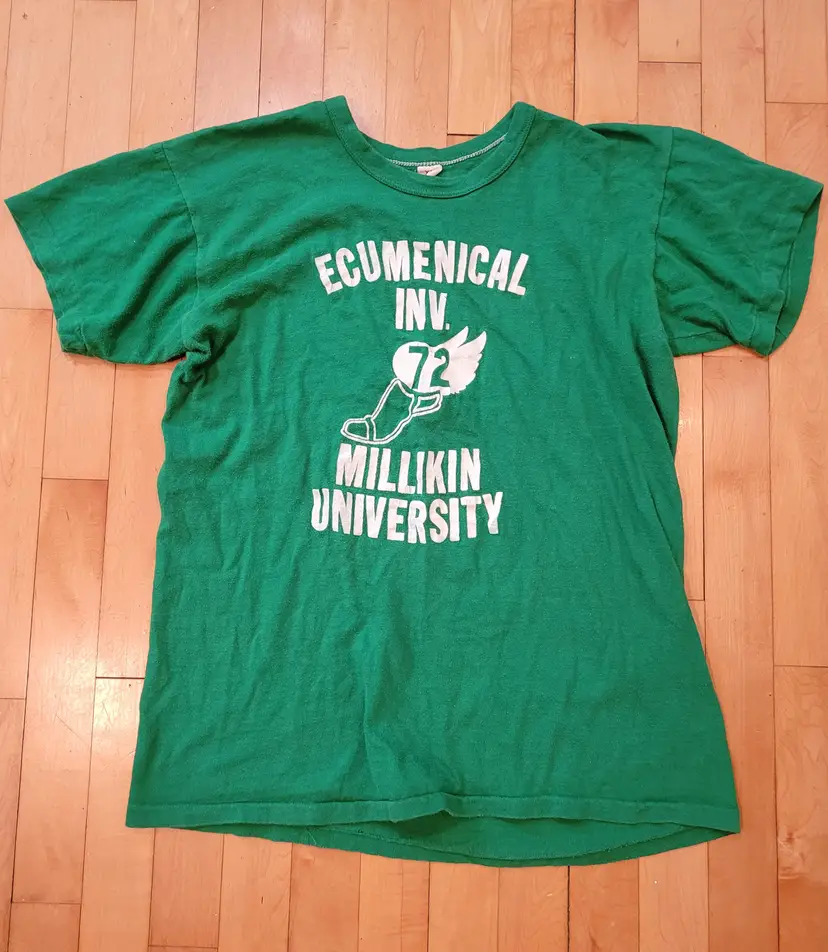 This is a genuine vintage tee from Millikin University (not repro!), circa 1972. This came from the estate of the original owner who attended college there. It is in decent condition, but has signs of wear and flaws- a couple small white spots and a few pinholes. Please see pictures for details on the flaws. It is tagged a men's size XL but as vintage sizes vary from modern, please see measurements below to ensure it'll fit you before purchasing.
