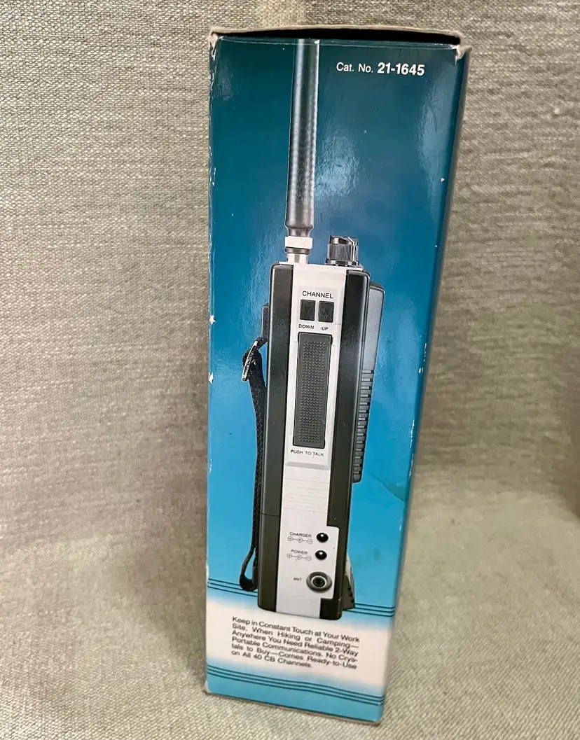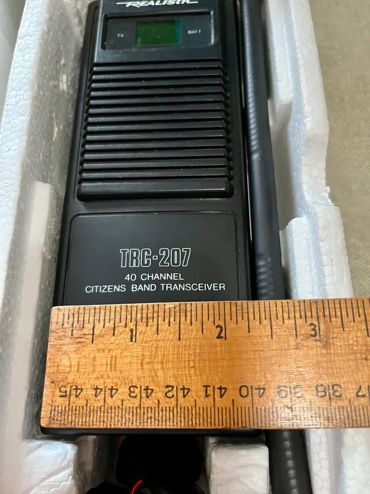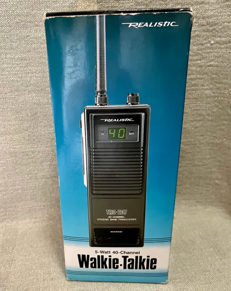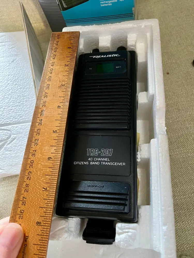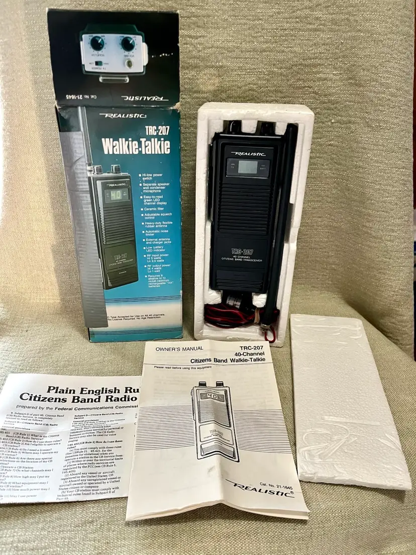1989 Realistic TRC-207 40 Channel Portable CB Radio Walkie Talkie 5 Watt 2 Way with Original box, paperwork, and purchase receipt of 4/10/1993 for $72.75. This is UNTESTED. Buyer can decide by looking at the multiple photos its condition.