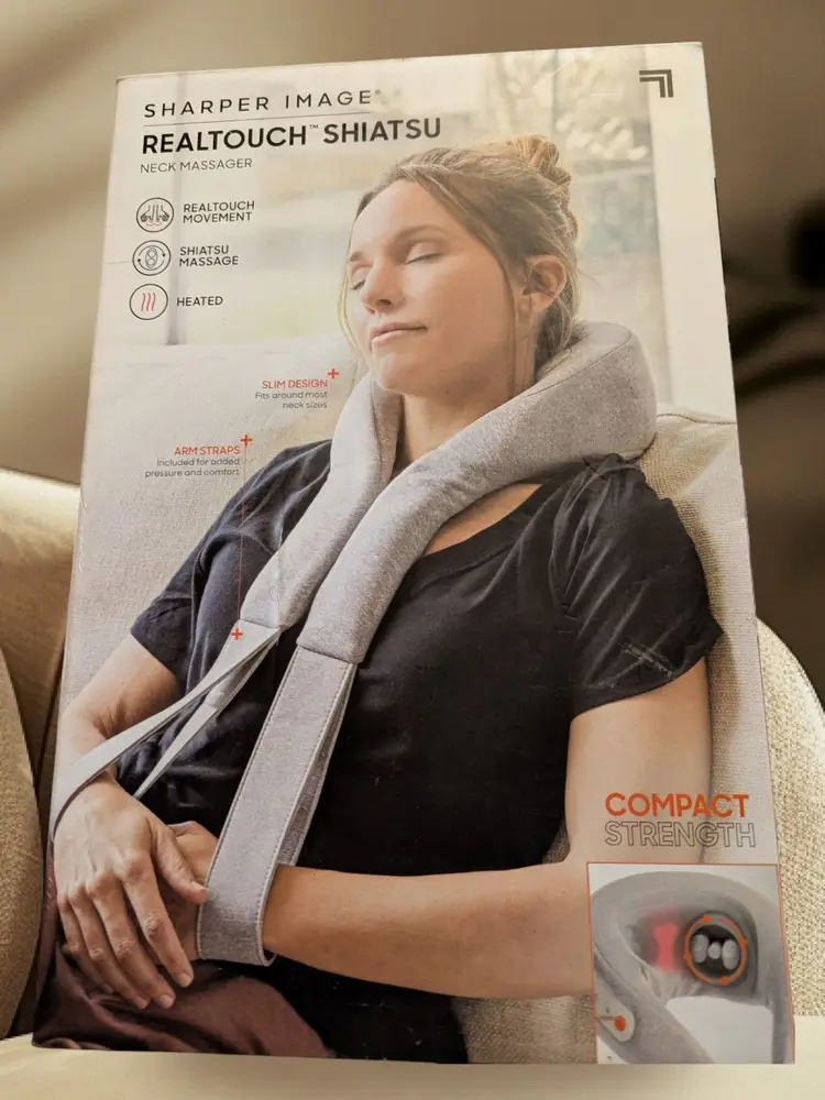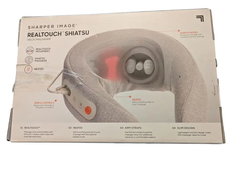 RealTouch Shiatsu Neck Massager Compact Heated Sharper Image Slim Design Relief. Relax after a long day at work or exercise. It is in like new condition with box, instruction booklet, and USB cable. Enjoy!