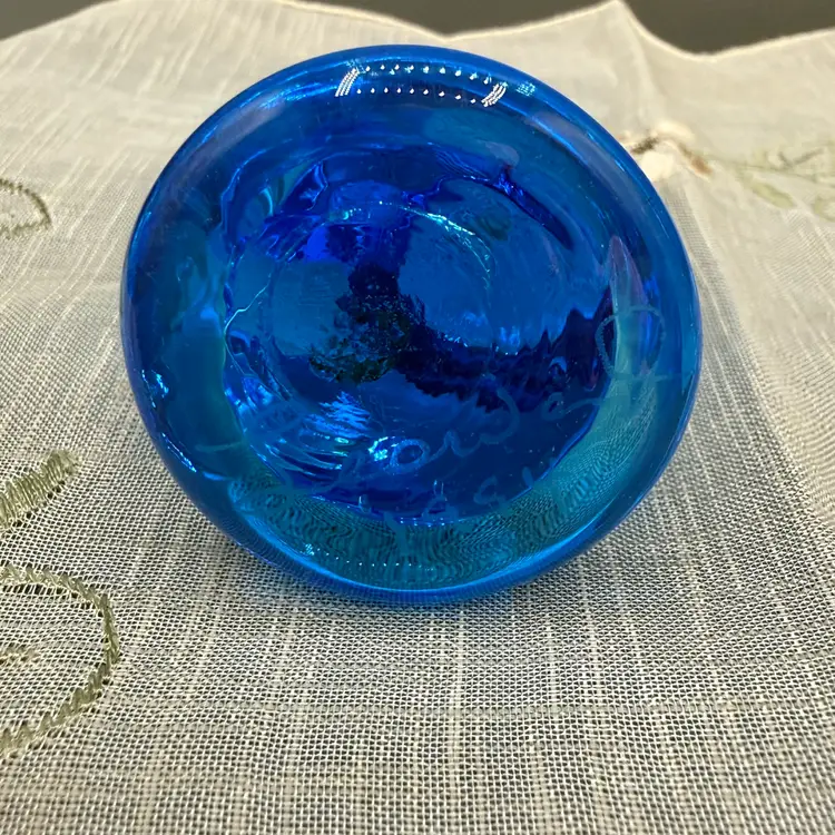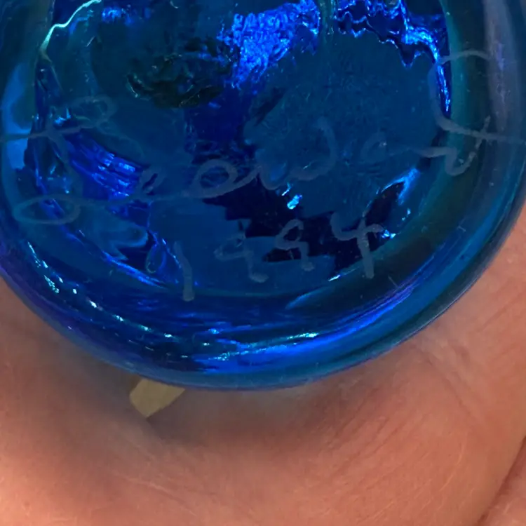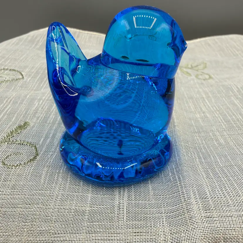 This 2-inch cobalt blue bird is a genuine vintage piece from 1994, featuring the hand-etched signature of the studio’s founder, Leo Ward, on the base.