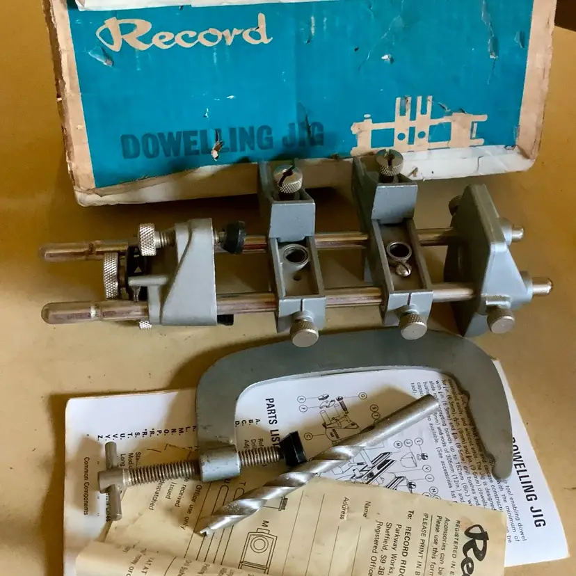 PRICE REDUCED! This is a complete Record 148 doweling jig, complete with all parts including the requisite brad point drill bit. The original box is included (old, taped and shabby but intact) the instruction manual, and a spare parts order form denominated in British pence, dated 11/74.